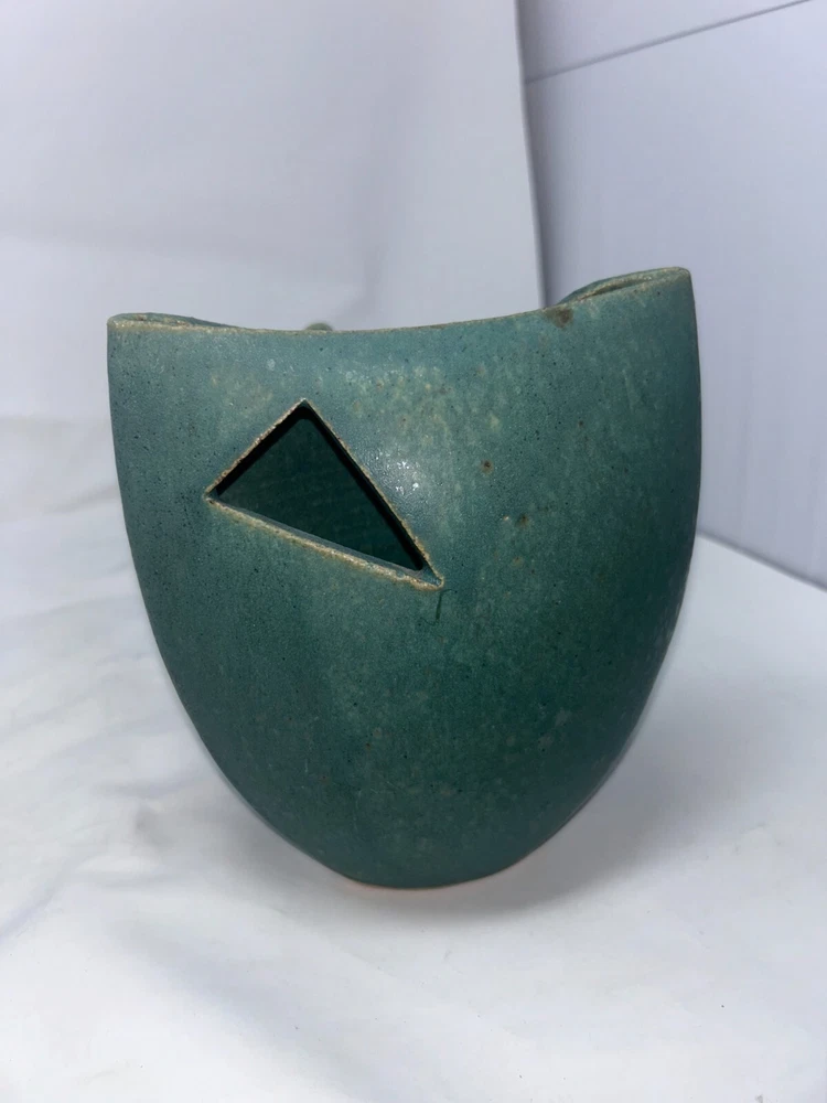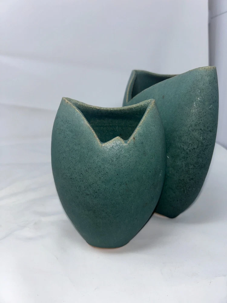 This elegant set of three modernist ceramic vases features a striking mid-century aesthetic with clean lines and organic shapes. Crafted from a matte green glazed ceramic, these vases offer a minimalist yet artistic design. Perfect as a statement centerpiece or as a collectible item for art pottery enthusiasts. Each vase has unique openings, making them suitable for single stems or as sculptural decor pieces. The set is in excellent vintage condition, showcasing subtle variations in glaze and form that highlight their handmade quality. Details: Category: Home & Living > Home Decor > Vases Style: Mid-Century Modern, Modernist Estimated Year of Manufacture: 1950s–1960s Material: Ceramic Color: Matte green Dimensions: Large vase: Approximately [provide height/width measurements] Medium vase: Approximately [provide height/width measurements] Small vase: Approximately [provide height/width measurements] Weight: [provide total weight in ounces] Condition: Excellent vintage condition with no chips or cracks.