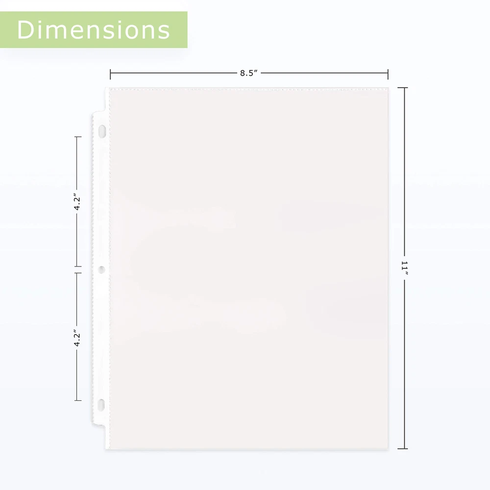 Having our Clear Sheet Protectors is the best way to keep all your important documents safe and secure! These toploading clear sleeves offer a high-end, archival quality finish for long term use. Allow you to add 2 single-sided prints, or 1 double-sided print into each sleeve. Printed materials do not stick or lift off of this specially formulated material. A great lightweight material for protection and easy transportation. ⭐WHAT YOU WILL GET⭐ ✔️ GREAT VALUE - Bulk pack of 150 toploading non-glare sheet protectors (Size: 8.5 x 11 inches) that will keep all of your important documents safe and secure in a three ring binder, packed for large jobs and additional value. ✔️ DURABLE PROTECTION - Our polypropylene sheet protectors absorbs wear & tear. Its thickness provides great performance, made for durability and frequent daily use at home, school or office. ✔️ PREMIUM QUALITY - Sheet protectors are PVC free, acid free, odor free and made of environmentally safe recyclable polypropylene. Each hole line is reinforced with a white polypropylene reinforcement. ✔️ ARCHIVAL SAFE - PVC free, acid free and archival safe plastic sleeves made with non-stick material that avoids lifting or transferring ink to the binder sleeves while it is stored in shelves, archives, safe boxes or plastic boxes. ✔️ CRYSTAL CLEAR VISIBILITY - Toploading sheet protectors have clear finish providing optimum clarity for easy viewing of the documents. 100% SATISFACTION GUARANTEE Buy with confidence! We stand by our products and offer a 30-day money-back/replacement guarantee! Great Value - Bulk pack of 150 top loading non-glare sheet protectors (Size: 8.5 x 11 inches) that will keep all of your important documents safe and secure in a three ring binder, packed for large jobs and additional value. Our bulk pack ensures that you have an ample supply on hand whenever you need it. Your important documents deserve the best protection, and our sheet protectors provide just that. Durable Protection - Our polypropylene sheet protectors absorbs wear & tear. Its thickness provides great performance, made for durability and frequent daily use at home, school or office. These sheet protectors are not just designed for occasional use; they are built for the demands of daily life. Our Polypropylene Sheet Protectors are designed to excel in various settings. Premium Quality - Sheet protectors are PVC free, acid free, odor free and made of environmentally safe recyclable polypropylene. Each hole line is reinforced with a white polypropylene reinforcement. Embrace a new standard of excellence with our Premium Quality Sheet Protectors, where every detail is meticulously crafted to exceed your expectations. Archival Safe - PVC free, acid free and archival safe plastic sleeves made with non-stick material that avoids lifting or transferring ink to the binder sleeves while it is stored in shelves, archives, safe boxes or plastic boxes. Meticulously designed to safeguard your documents for generations to come. We prioritize the longevity of your materials while ensuring that your documents remain in pristine condition. Crystal Clear Visibilty - Top loading sheet protectors have clear finish providing optimum clarity for easy viewing of the documents. You can trust that your content will always be clear and easily readable, without the distractions caused by glare or reflections. This ensures that your materials maintain their impact and effectiveness, regardless of the setting.