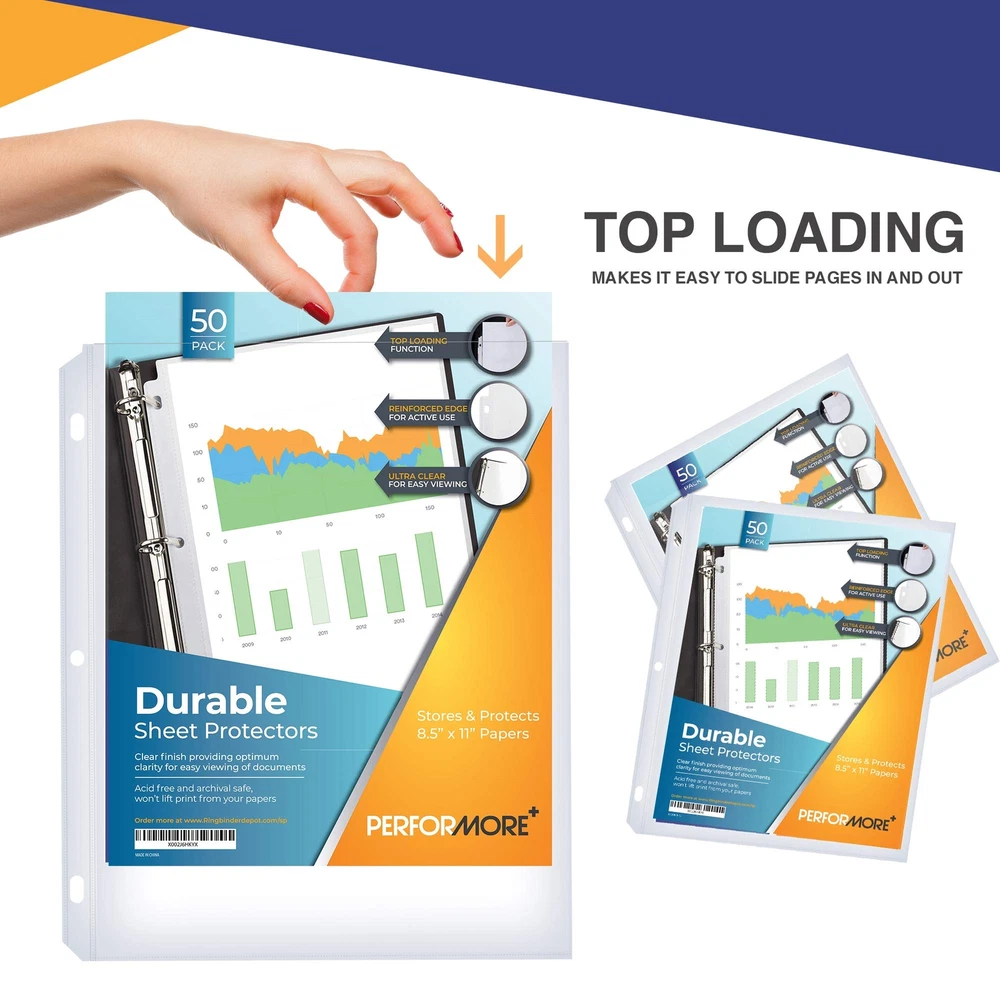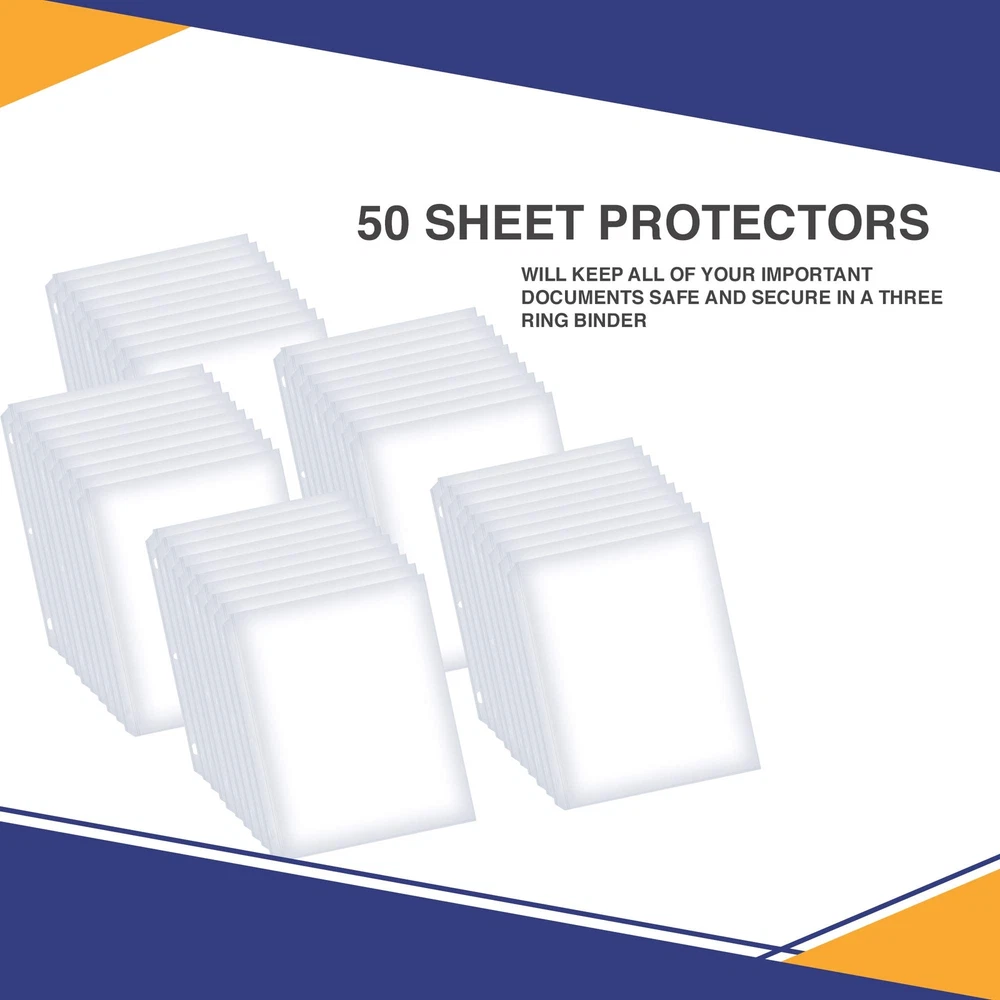 Slip your important documents into our sheet protectors. The clear finish lets the documents be seen while remaining protected, making them ideal for portfolios or manuals. Each protector features nonstick construction to prevent ink and toner transfer. Accommodate letter-size (8.5" x 11") sheets for versatile document storage options. Clip them into a three-ring binder to keep papers organized and safe. PRODUCT FEATURES: ✓ Stop Tears, Stains and Other Damage to Important Documents Think of the dangers the average document faces in the office: folded corners, unsightly tears, greasy fingerprints. Your important documents need a little help to stay looking their best. These page protectors feature a plastic construction holds up to regular, everyday use so you don't have to worry about the safety of your documents. ✓ Organize Pages as You Wish Each page protector comes with reinforced holes for three-hold folders and binders. Arrange the page-protected documents in a binder for additional protection. If you decide you don't like the order, want to remove pages or just need to add more information, open the rings of the binder and work your rearranging magic. ✓ Resilient, Long-Lasting Protection The acid-free nature of these page protectors means you don't have to worry about your documents degrading over time. Archival-quality protection leaves a crystal-clear finish to make the documents easy to read. Ink from the documents stays put, thanks to the polypropylene construction, which doesn't lift ink. 100% SATISFACTION GUARANTEE Buy with confidence! We stand by our products and offer a 30-day money-back/replacement guarantee! Gret Value - Bulk pack of 50 durable top loading sheet protectors, reinforced 3 hole-punched for 8.5 x 11 inch paper that will keep all of your important documents safe and secure in a three ring binder, packed for large jobs and additional value. Durable Protection - Our polypropylene sheet protectors absorbs wear & tear. Its thickness provides great performance, made for durability and frequent daily use at home, school or office. Top loading makes it easy to slide pages in and out Premium Quality - Sheet protectors are PVC free, acid free, odor free and made of environmentally safe recyclable polypropylene. Holes are reinforced for long-lasting use. Archival Safe - PVC free, acid free and archival safe plastic sleeves made with non-stick material that avoids lifting or transferring ink to the binder sleeves while it is stored in shelves, archives, safe boxes or plastic boxes. Crystal Clear Visibility - These top loading sheet protectors have clear finish providing optimum clarity for easy viewing of the documents. Offering the highest level of transparency and clarity available on the market today.