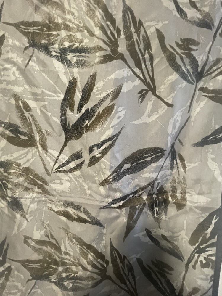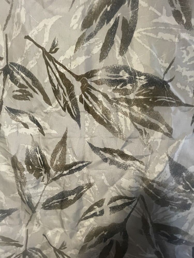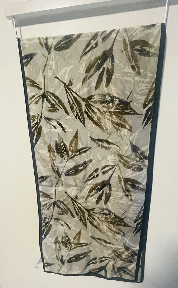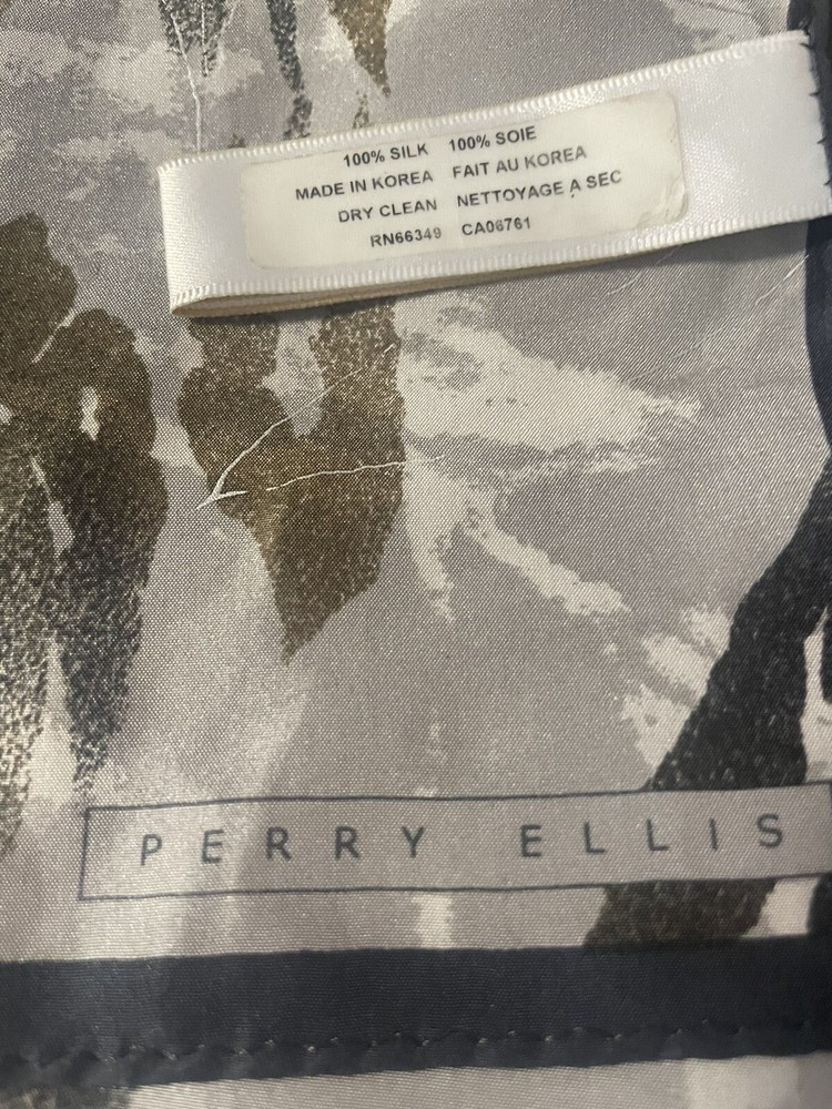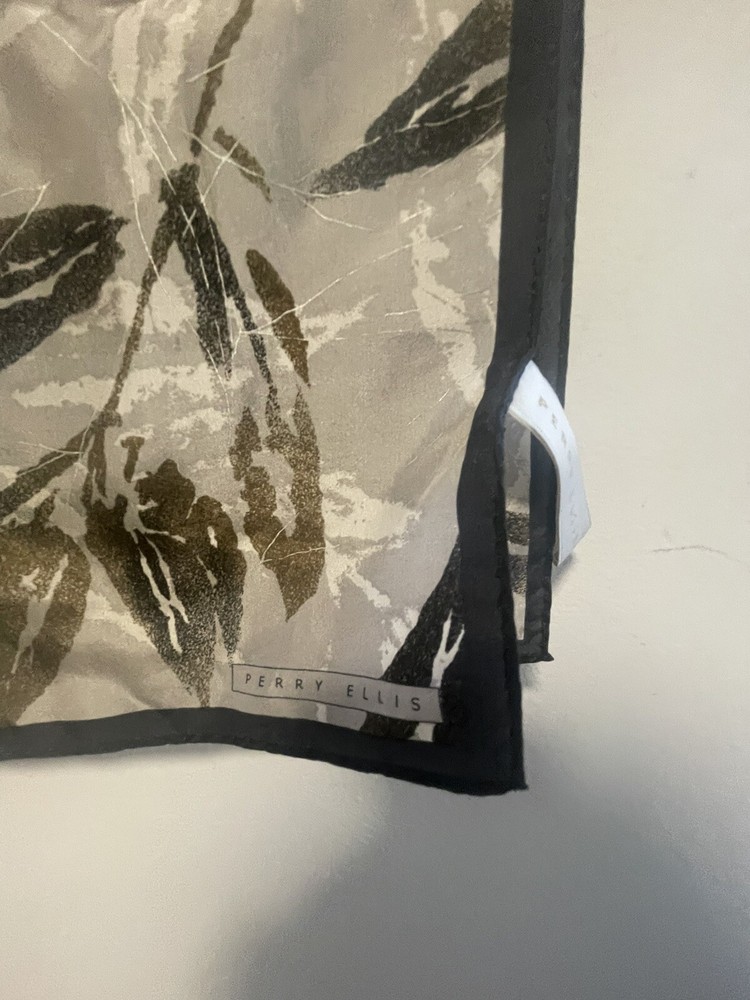 This Perry Ellis Vintage SILK Rectangle Abstract Art bamboo leaf print Scarf is made of a multicolor silk fabric, measuring 57 inches in length. Preowned from a smoke-free environment.