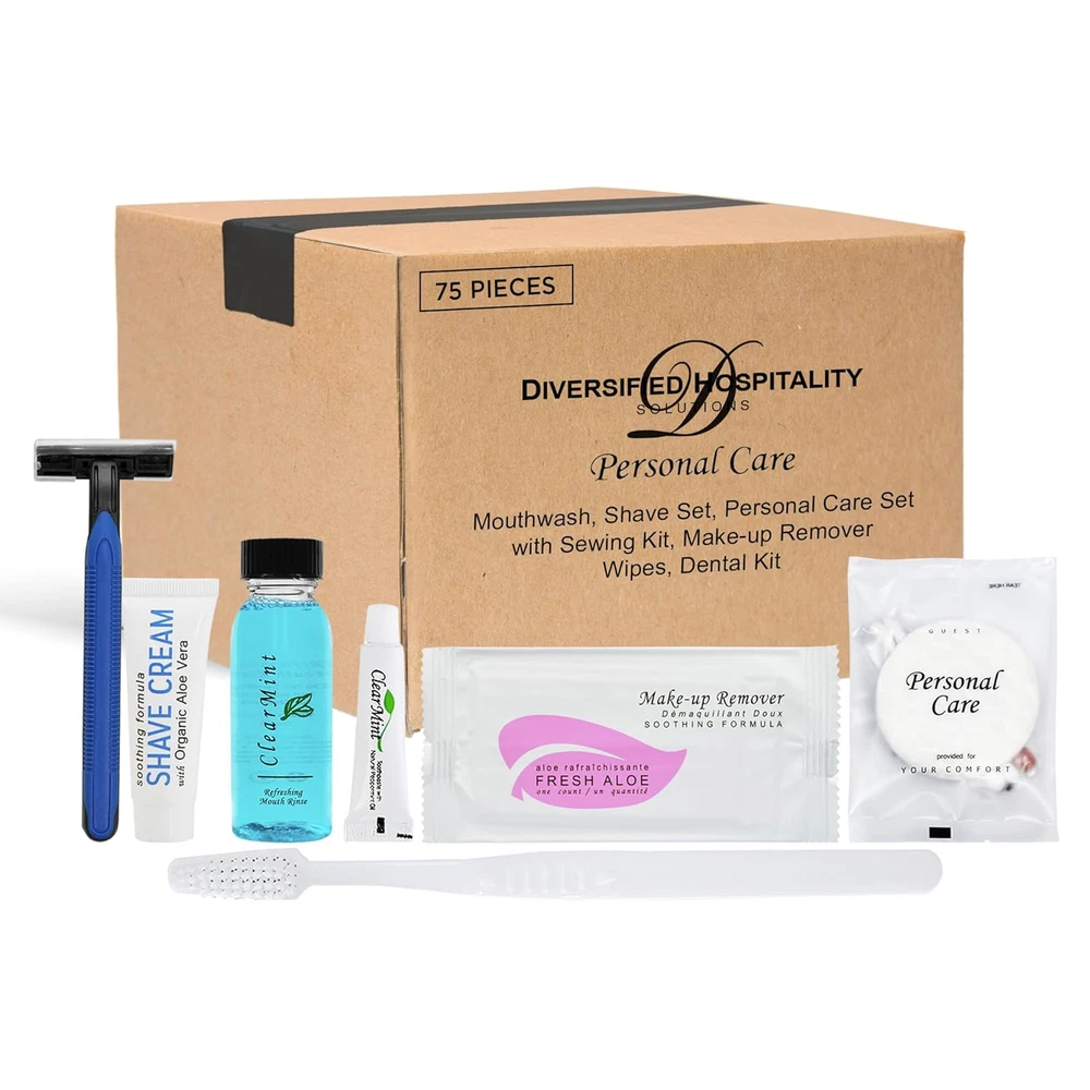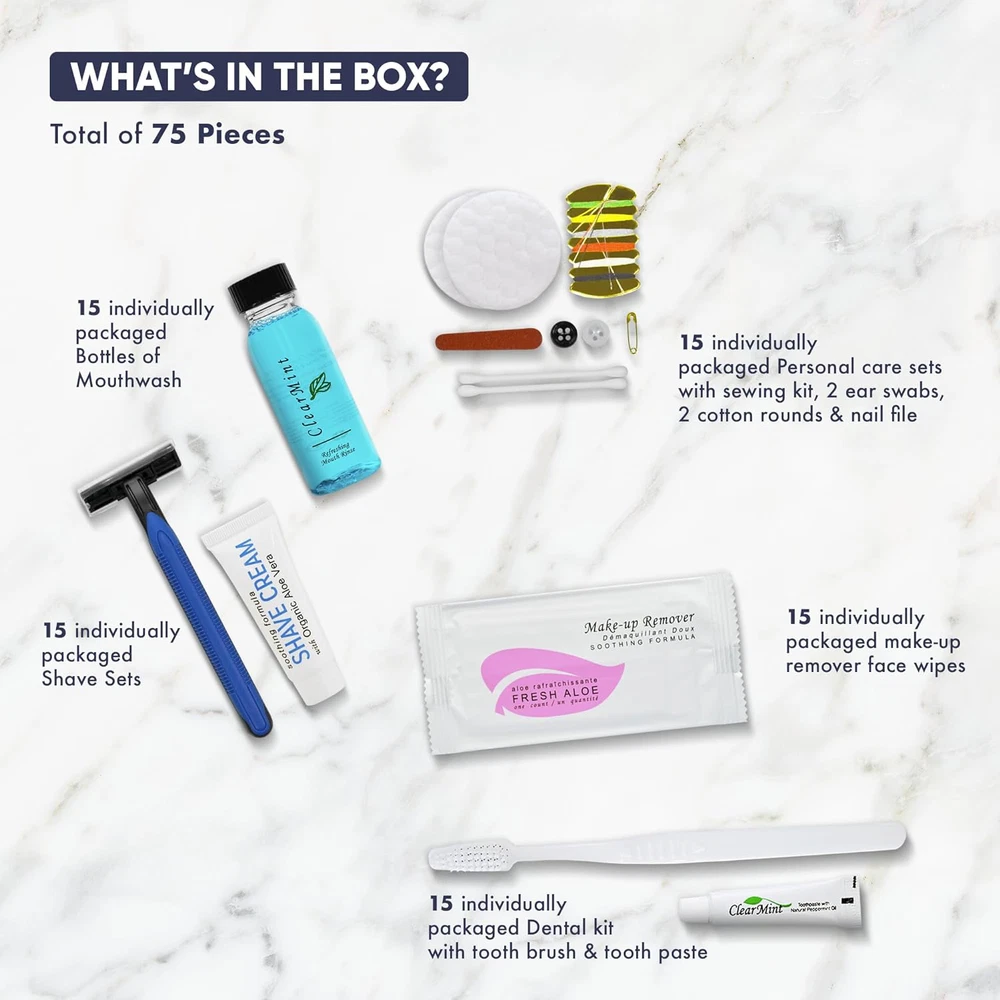 Personal Care Travel Size Toiletries | 1-Shoppe All-in-Kit Hotel Amenities Bulk BULK TRAVEL SIZE TOILETRIES: We offer luxury mini toiletries in disposable eco-friendly packaging great for single use. Our hygiene kit is perfect for hotels, Airbnb essentials, VRBOs, gyms, traveling, vacation rentals, guest rooms, homeless care package supplies, & more! IN THE BOX: The 75 piece travel kits have everything you need to keep your guests comfortable. The travel accessory set includes 15 of each: Shaving Set, Toothbrush, Tooth Paste, Mouthwash, Make-Up Remover, Cotton Swabs, Nail File & Sewing Kit! WHY CHOOSE DIVERSIFIED HOSPITALITY? We offer high-end products & environmentally-friendly bulk toiletries that are designed to bring elegance to any upscale property. This toiletry kit will keep all of your guests happy & satisfied! TSA AIRLINE APPROVED: Our travel hygiene kit is also great for personal travel because all included toiletries meet carry-on standards for air travel. Pack everything you need for your upcoming vacation in your carry-on luggage!