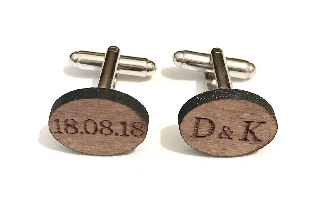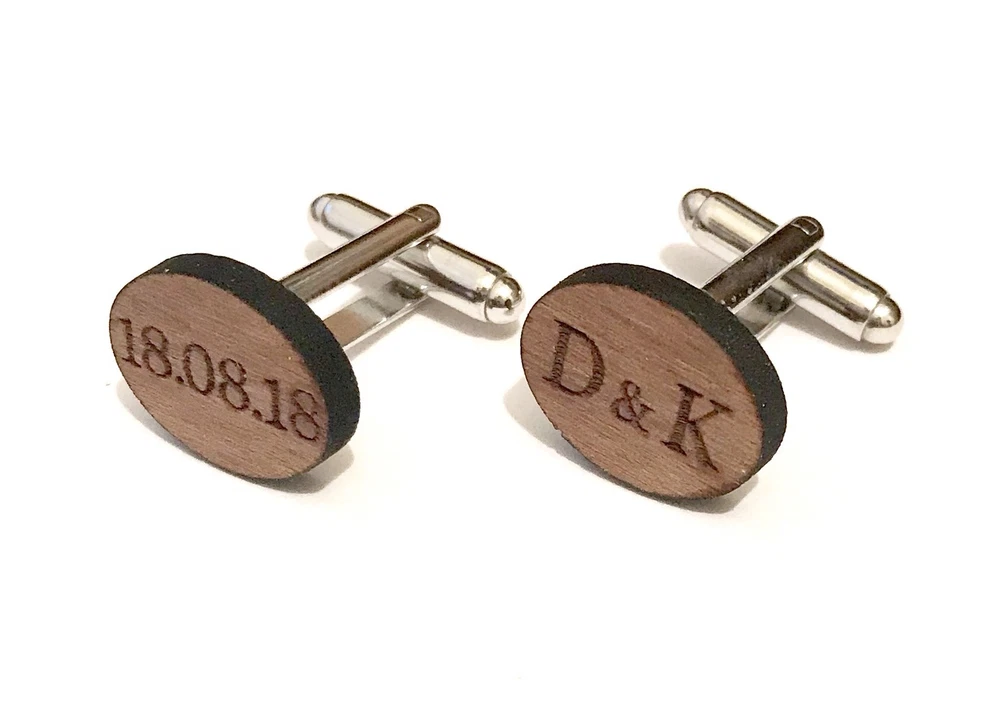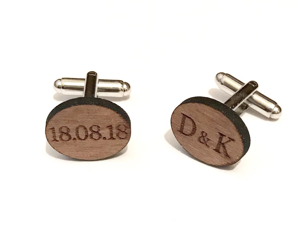 Men's personalised cufflinks. Handmade laser cut and engraved from 3mm quality walnut wood. Personalised with the date one one cufflink and two initials on the other Approximately 17mm x 12mm The perfect accessory for any wedding or other special occasion.