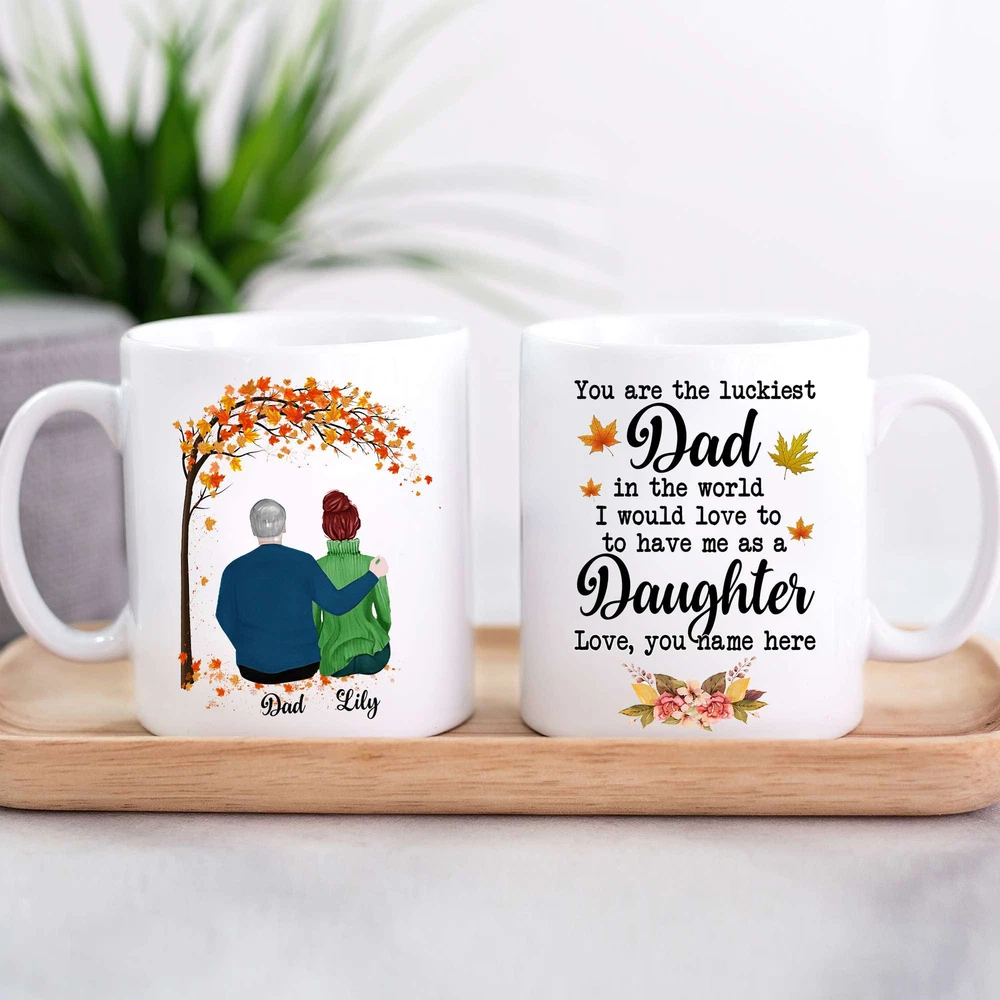 Personalize Dad Daughter Mug You Are The Luckiest Dad In The World I Would Love Product Details.. This high quality 11oz. ceramic white mug has a premium hard coat that provides crisp and vibrant color reproduction sure to last for years. Perfect for all hot & cold beverages. The highest quality printing possible is used. It will never fade no matter how many times you wash it. Material: 100% Ceramic. Print both sides. Dishwasher and Microwave Safe. High Gloss + Premium White Finish. Printed in the U.S.A. Personalized & Custom. We support personalized and custom mug to add custom, when placing an order, you can add notes to the "order note" in shipping address section. Also you can contact us directly via message. Shipping Info. Ready to ship in 1 to 2 business days, All products are made-to-order and proudly printed in the United States. Shipped by USPS and DHL, You will receive your order in 5-7 days. Replace & Refund. All products are defective during shipping broken, chipped will be replaced free of charge. You are not satisfied with the product, we will refund 100% money to you. If any other issues arise, please do not hesitate to message, we would be more than happy to assist you.