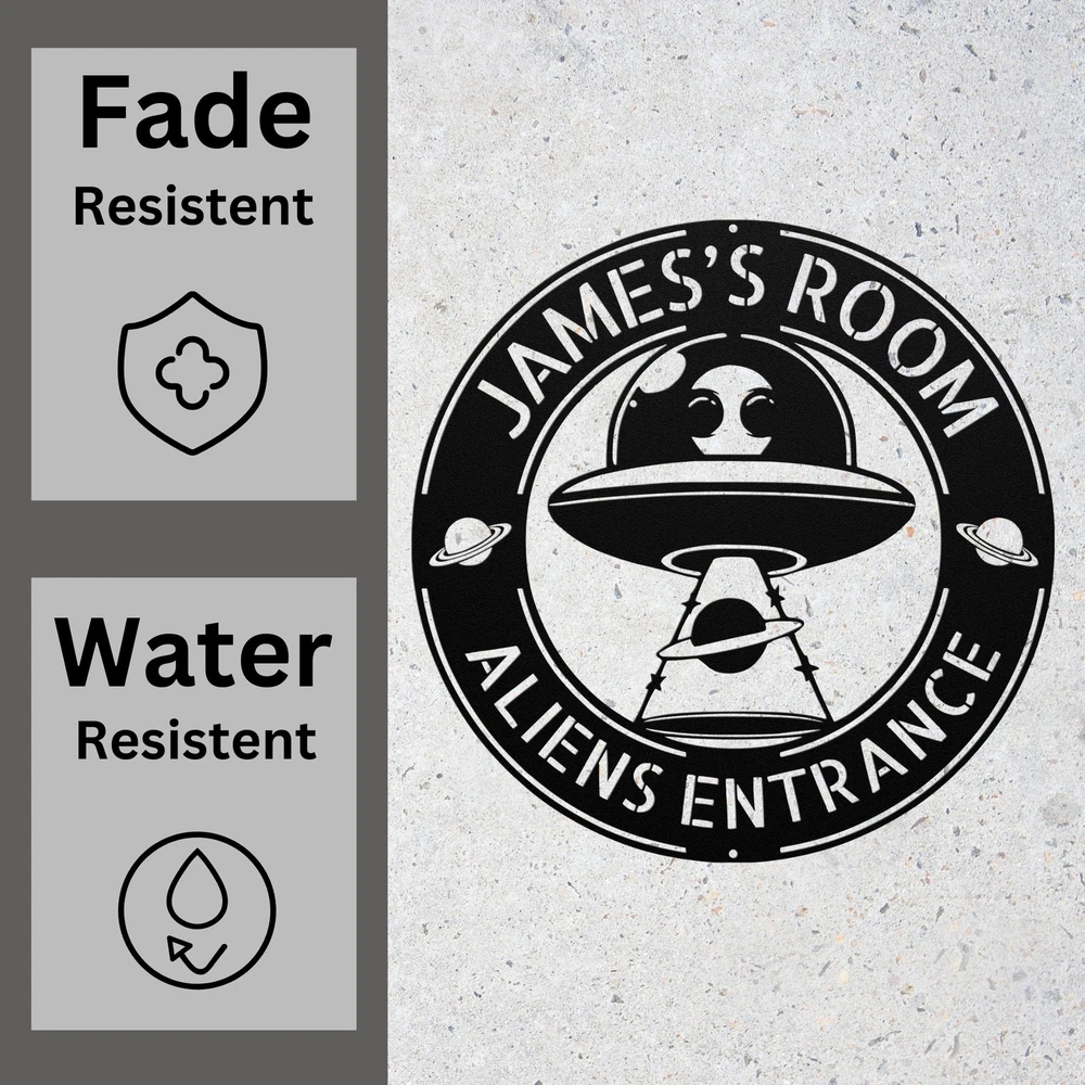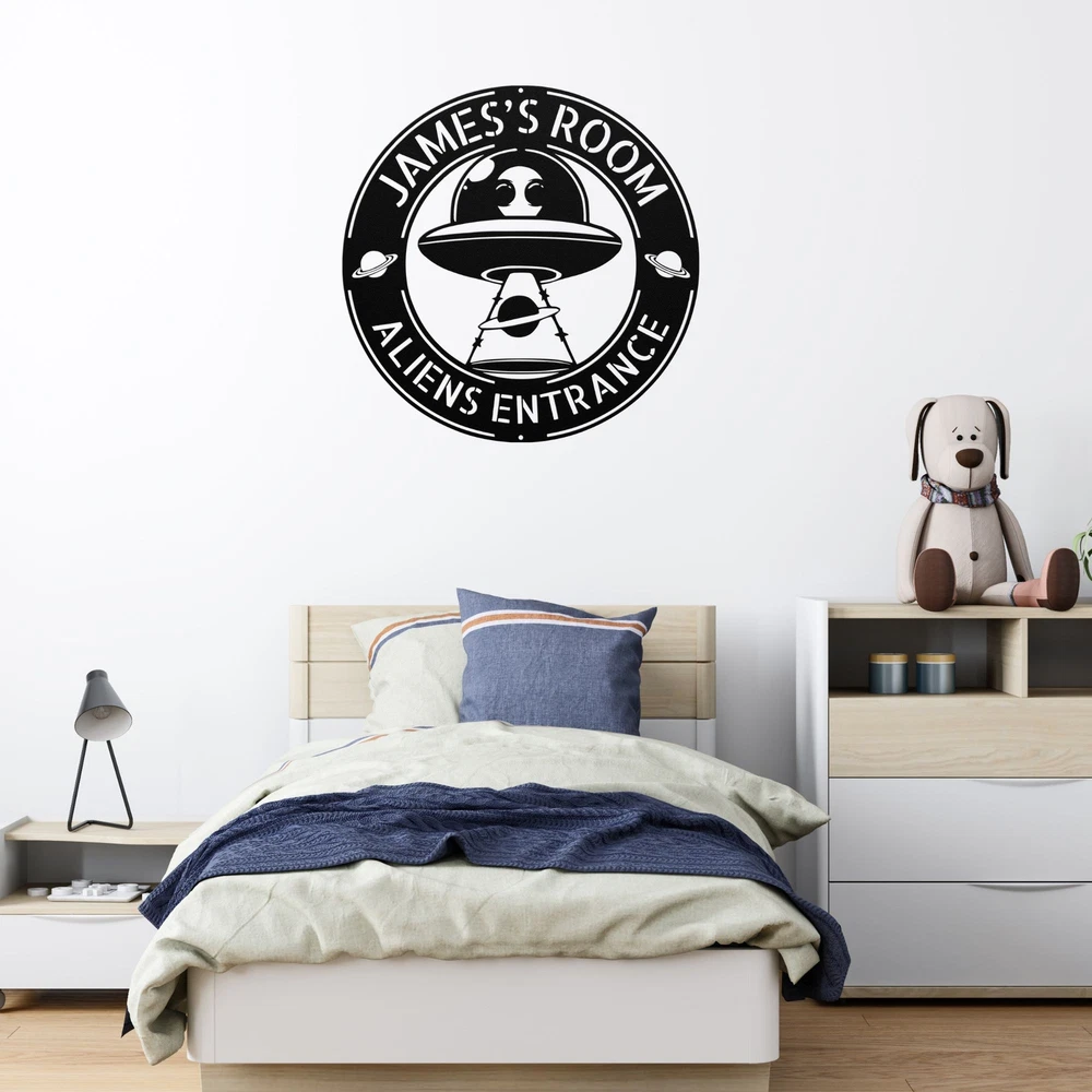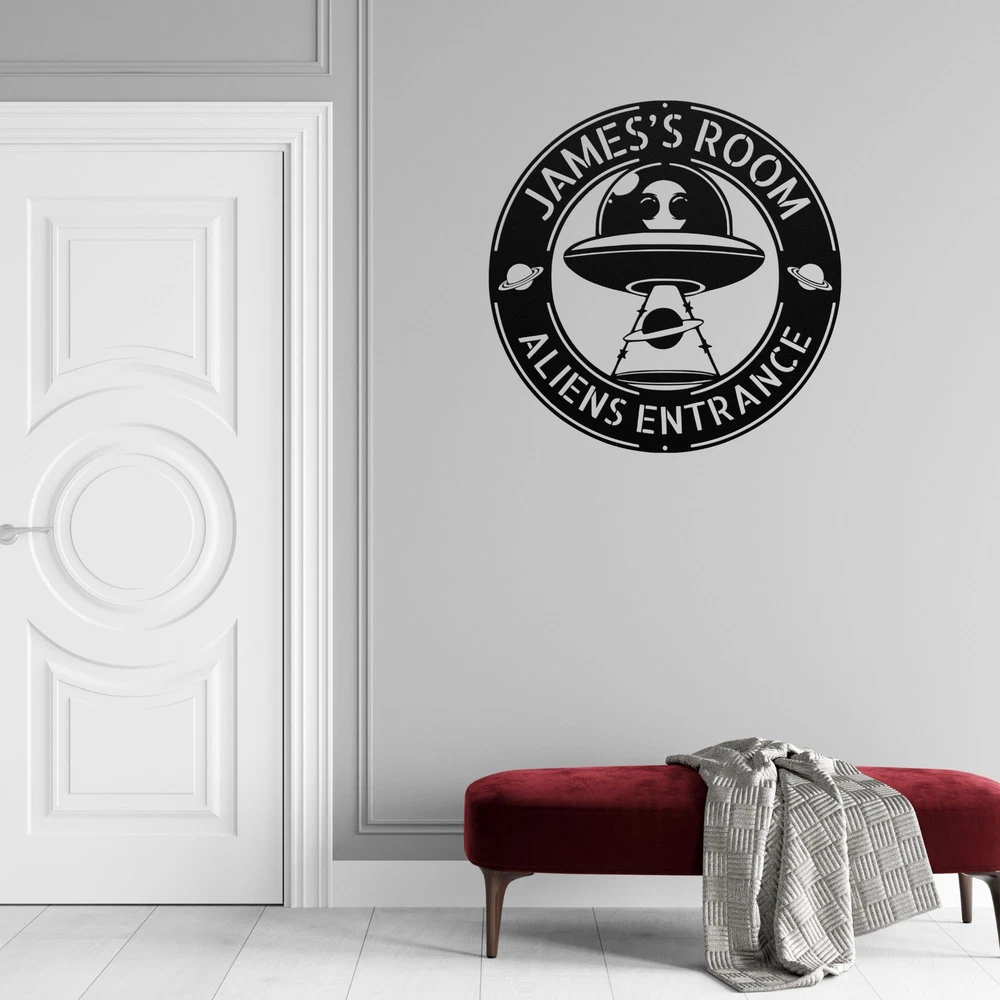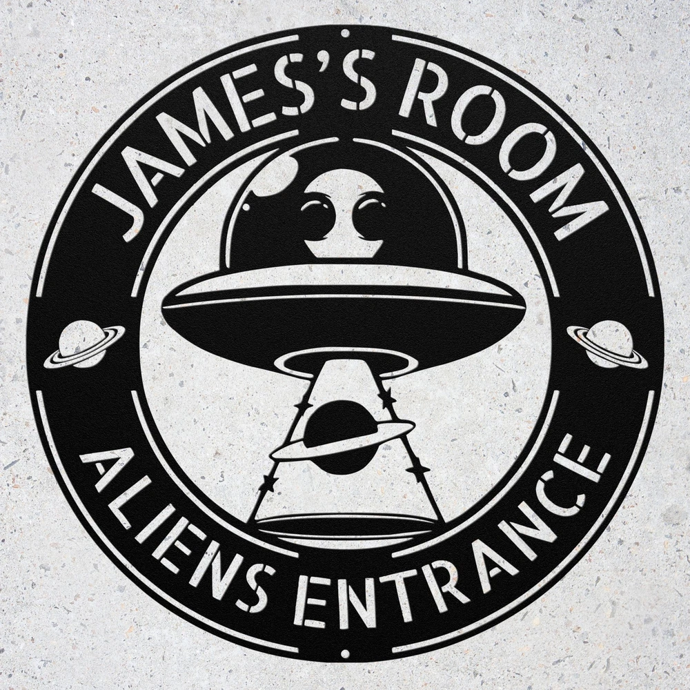 Product Description Personalized Alien Metal Sign Custom UFO Home Decor Unique Alien Room Decoration Add an out-of-this-world touch to your space with this Personalized Alien Metal Wall Art ! Perfect for UFO enthusiasts, sci-fi lovers, and anyone fascinated by extraterrestrial themes, this custom wall decor is a unique statement piece for any room. Key Features: Customizable Design: Add your name or a special message for a truly personalized piece of art. Premium Quality: Made from durable 16-gauge laser-cut metal with a powder-coated finish for long-lasting beauty and resistance to wear. Versatile Decor: Ideal for bedrooms, game rooms, man caves, or any sci-fi-inspired space. Unique Alien Design: Features a creative UFO and alien motif, perfect for fans of outer space and the unknown. Indoor & Outdoor Use: Weather-resistant design makes it suitable for both indoor and outdoor display. Perfect Gift: A fun and thoughtful gift for UFO enthusiasts, alien lovers, and sci-fi fans on birthdays, holidays, or special occasions. Elevate your room decor with this Personalized Alien Metal Wall Art . Whether for yourself or as a gift, this custom UFO sign will transport your space to another dimension! Service and Color Choice Our metal signs are designed to be personalized just for you, making them the perfect addition to any space! The default color for our signs is Black , but we also offer a variety of beautiful options including Copper, Gold, White, and Silver . After placing your order, simply contact us with your preferred color choice, and we'll ensure your sign is exactly how you envision it. Let’s create something special together!