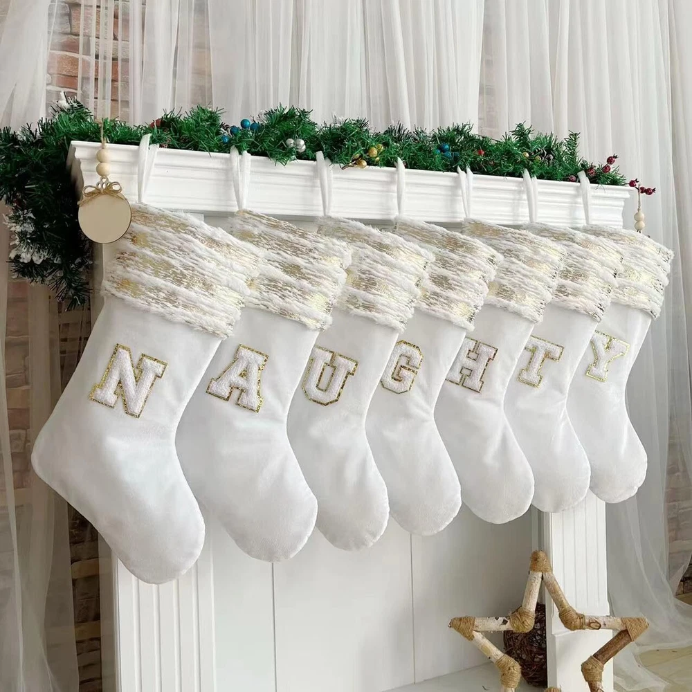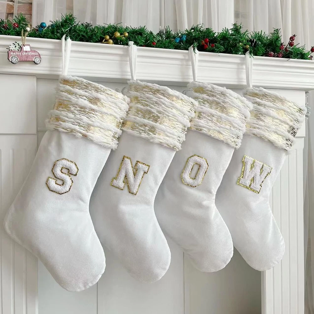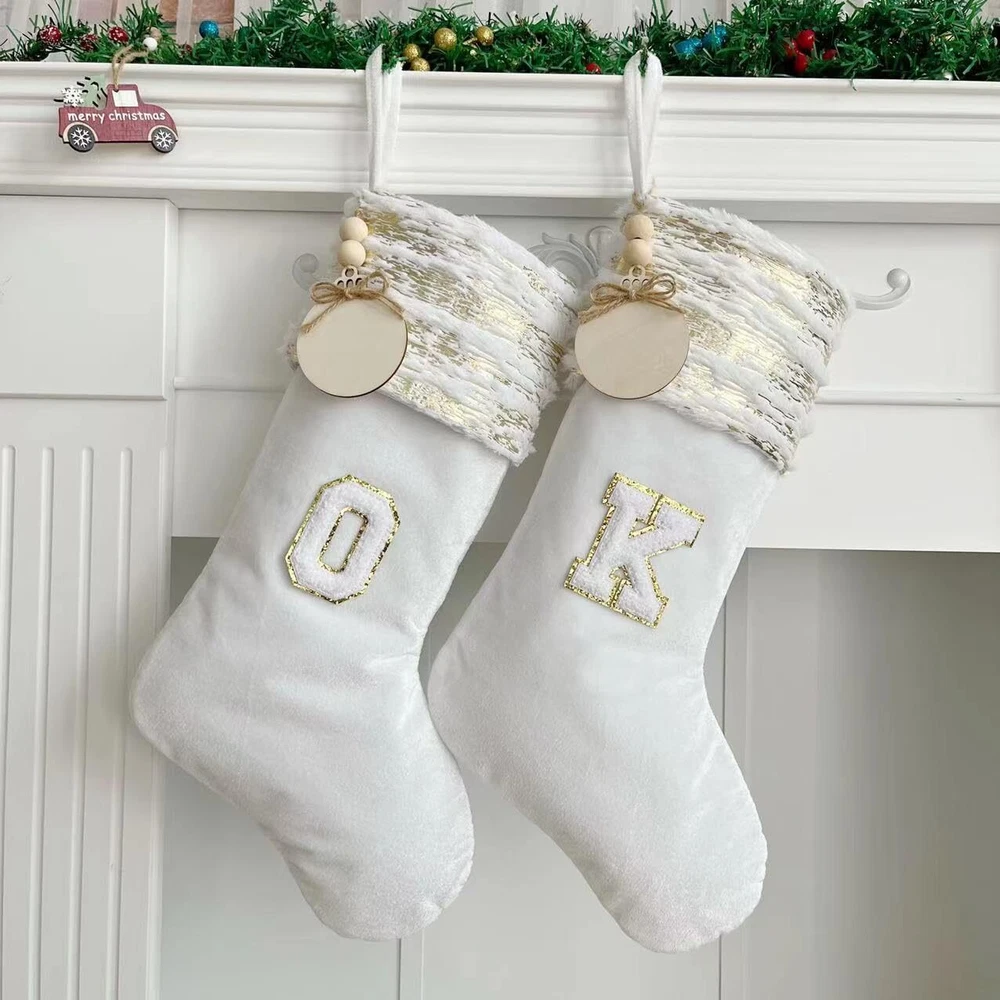 Personalized Cable Knitted Christmas Hanging Stocking Decorations with Name Tags Everyone loves Christmas. Every expect to get the gifts from Santa. Share the best wishes to your dear family, friends and others. Just start with choosing a nice Christmas stocking. Color: White Overall Height: 20 inches Feature: Everyone can enjoy a Christmas stocking with wooden name tags. Personalize the name or any text to capture the warmth of Christmas, you can freely write down anything you want to customize gifts for your children, family and friends, and pets Material: Christmas stockings are made of high quality Polyester and are strong and durable. White and gold fuzzy cable knit stockings with wooden tags, classic and innovative. Add traditional elements to your Christmas decorations .Get ready for the incoming XMAS Size: 20 inches Christmas stockings are large enough to hold many small toys, candy, gadgets and gifts for children, Imagine the screams, happiness and excitement of your lovely children when they find their Christmas-only presents with their names on them on Christmas morning Style: After you've stuffed your stocking with lots of Christmas presents, you can hang it up safely. Hook accessories can be selected in the customization information. Christmas stockings also bring warmth to children and adults, especially families Application: christmas white stockings are suitable for hanging fireplaces mantel, windows, wall, doors,banister,Christmas Tree, hotel, club, bar and so on. Christmas Stockings are large enough for small gift, candies or cookies, watch, folding wallet, ties, gift cards, small toy cars, etc