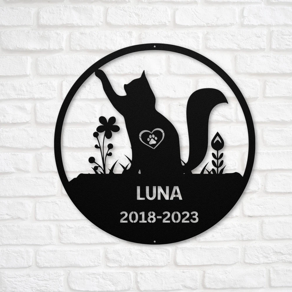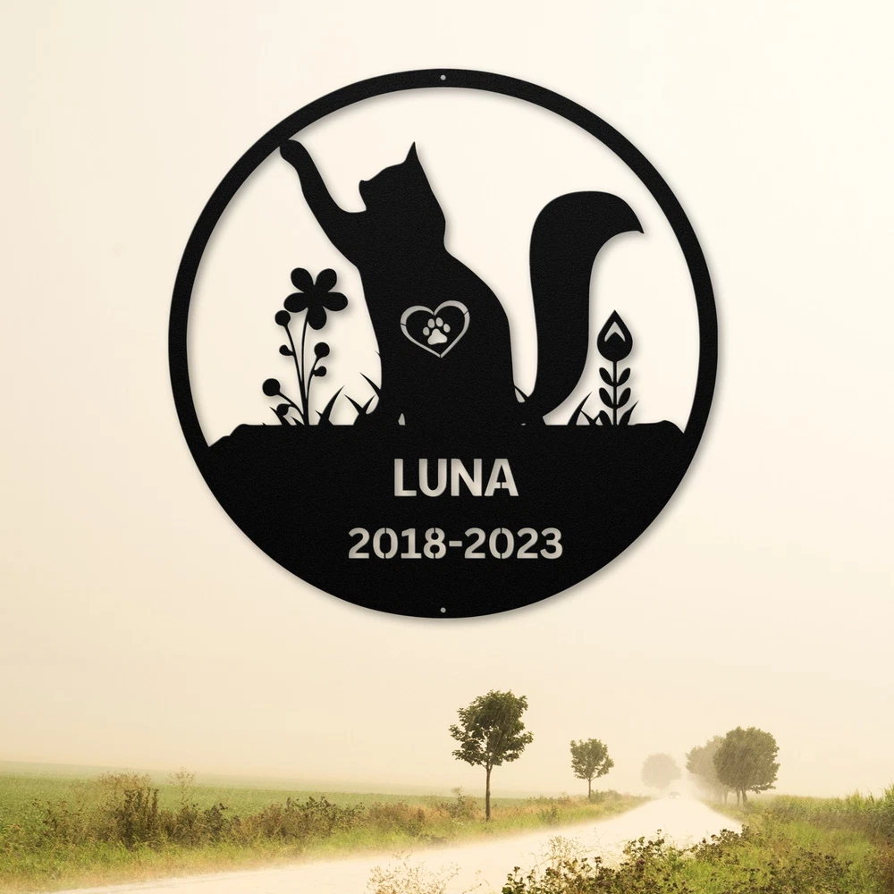 Product Description Personalized Cat Memorial Metal Sign Custom Pet Tribute Decor Gift for Cat Owner Cherish the memory of your beloved feline companion with our Personalized Cat Memorial Metal Sign . This touching tribute is perfect for honoring your cherished pet and can be displayed in your home or garden. Crafted from 16 gauge high-quality metal , this sign is built to last. It features a powder coating that makes it dust, weather, and water-resistant , ensuring it remains beautiful in any setting. Key features include: Customizable Design: Personalize with your cat’s name and a special message for a heartfelt tribute. Durable Construction: Made from high-quality metal to withstand the elements and time. Thoughtful Gift: A meaningful gift for pet lovers, perfect for Christmas, birthdays, or any special occasion. Beautiful Decoration: A lovely addition to your home or garden, creating a lasting memory of your furry friend. Celebrate the love and joy your cat brought into your life with the Personalized Cat Memorial Metal Sign . It’s a beautiful way to remember and honor your cherished pet for years to come. Service and Color Choice Our metal signs are designed to be personalized just for you, making them the perfect addition to any space! The default color for our signs is Black , but we also offer a variety of beautiful options including Copper, Gold, White, and Silver . After placing your order, simply contact us with your preferred color choice, and we'll ensure your sign is exactly how you envision it. Let’s create something special together!