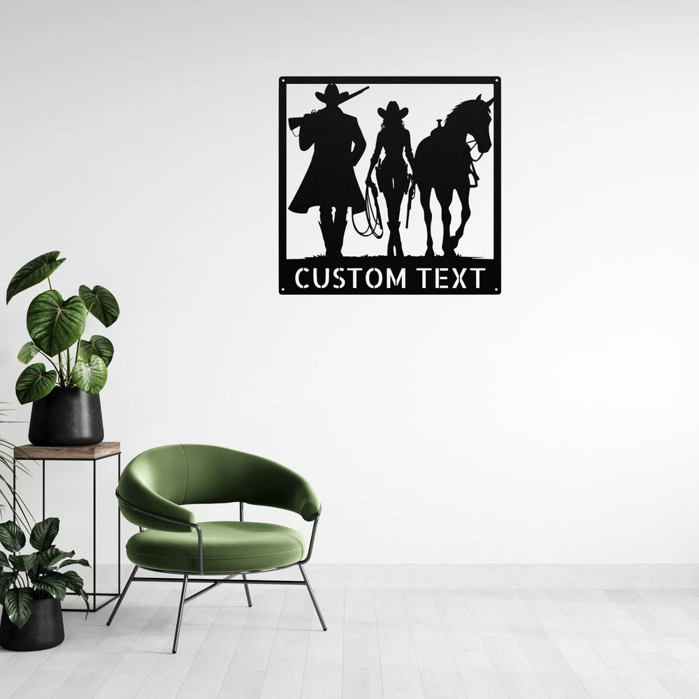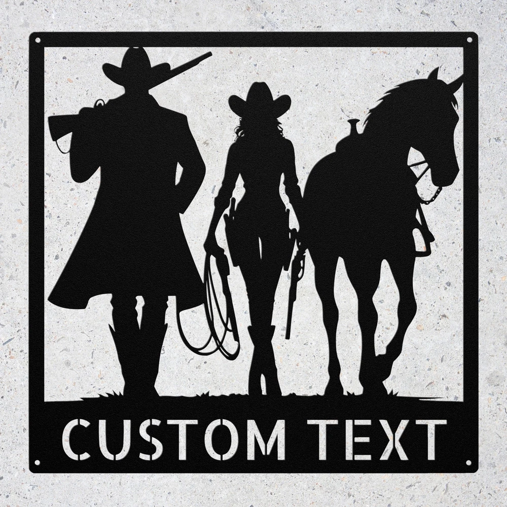 Product Description Personalized Cowboy Cowgirl with Horse Metal Sign Custom Wall Art Decor Gift Add a touch of western charm to your space with our Personalized Cowboy Cowgirl with Horse Metal Sign ! This custom wall art decor is perfect for horse lovers and those who embrace the cowboy lifestyle. Made from high-quality 16-gauge metal, this sign features a durable powder coating that protects it from dust, weather, and water, ensuring it looks great both indoors and outdoors. Looking for the perfect gift? This personalized metal sign makes an excellent choice for Christmas, birthdays, or any special occasion. It’s a unique way to celebrate the bond between cowboys, cowgirls, and their horses. Key Features: Customizable Design : Personalize the sign with a name or special message. Durable Material : Crafted from 16-gauge high-quality metal for long-lasting use. Weather-Resistant : Powder-coated finish protects against dust, rain, and rust. Versatile Decor : Ideal for both indoor and outdoor display. Great Gift Idea : A thoughtful present for any cowboy or cowgirl. Show off your love for the cowboy lifestyle or surprise a friend with this beautiful metal sign. Order yours today and add a personal touch to your decor! Service and Color Choice Our metal signs are designed to be personalized just for you, making them the perfect addition to any space! The default color for our signs is Black , but we also offer a variety of beautiful options including Copper, Gold, White, and Silver . After placing your order, simply contact us with your preferred color choice, and we'll ensure your sign is exactly how you envision it. Let’s create something special together!