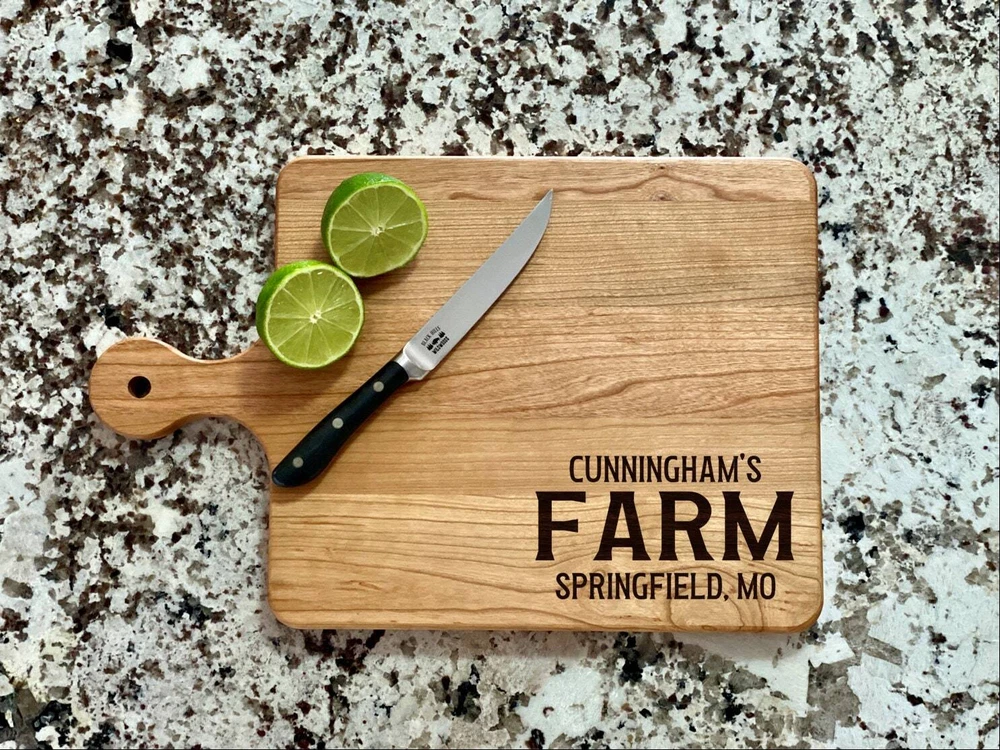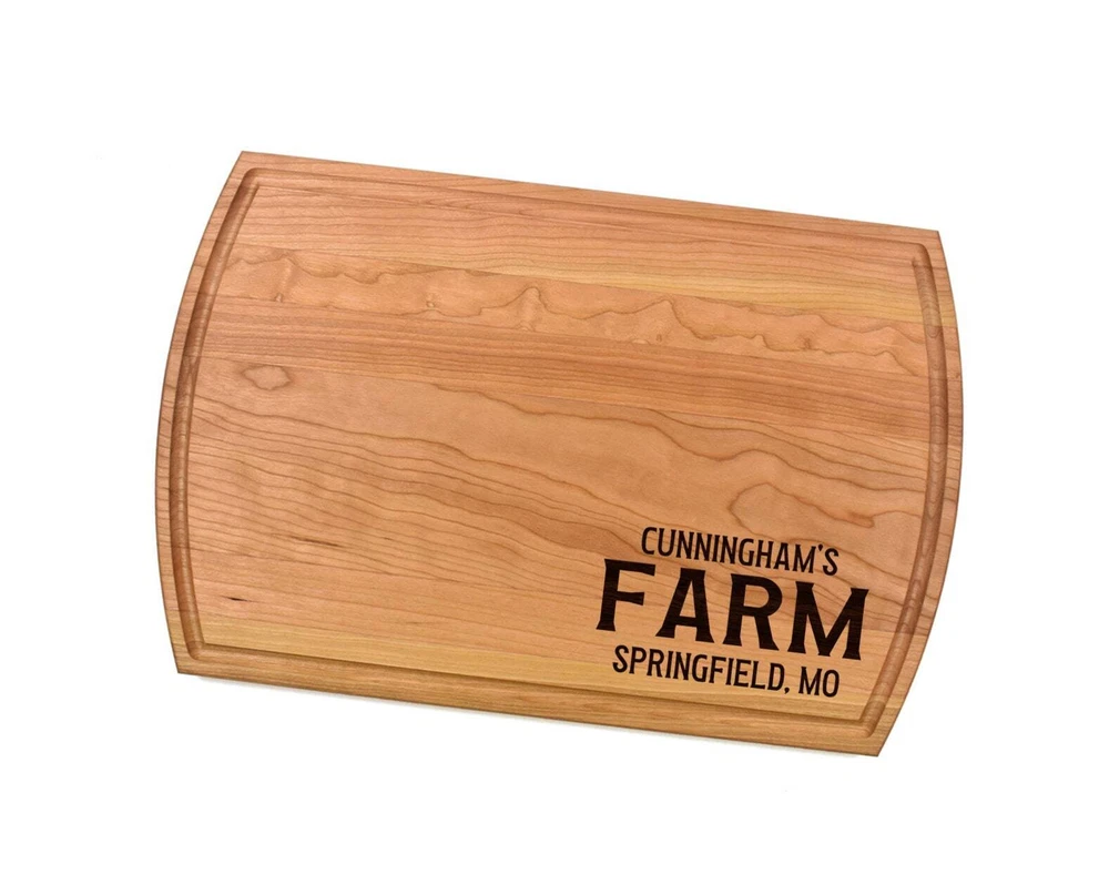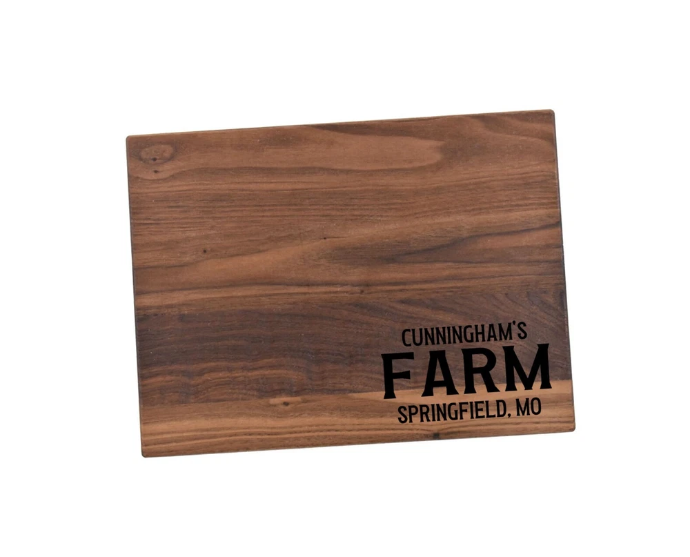 Design: Personalized Farm Cutting Board or Charcuterie Serving Tray All items ship via USPS - please make sure your address is correct :-) Whether used as a charcuterie serving tray for snacks or cutting board, our bamboo, walnut and cherry custom boards are the perfect addition for the home and make the perfect gift for your loved one celebrating a birthday, anniversary, new home, wedding, etc! *** FEATURES *** • SIZES: We have multiple styles and sizes available. To see our current sizes available, click the drop-down menu. The photo slide contains a photo showing each side by side. Please note, the board with the juice groove only has the groove on the front side of the board. • THICKNESS: Bamboo Boards - Approximately 1/2" Thick; Walnut & Cherry Boards - Approximately 3/4” Thick • UNIQUE: Every board is unique with the grain and coloring varying throughout - no board is the same! • CARE INSTRUCTIONS: Hand wash only with warm water. Do not soak. Please apply mineral oil throughout the board’s life. • PERSONALIZATION/CUSTIMIZATION: Do you want the text placed differently on the board? Please don’t hesitate to contact us. All personalization notes can be entered in the personalization box when checking out. • SHIPPING: All cutting boards ship within 2 to 5 business days. • WHOLESALE ORDERS: Please don’t hesitate to contact us for information about wholesale orders. Processing times for larger orders may change. • NOTE: Colors can vary a bit on different monitors and screens. Any props included in photos are not included. Please be sure to double-check your address to make sure it is accurate for USPS delivery. If a package is returned to us due to an invalid address, the buyer is responsible for all additional shipping charges. We appreciate you supporting small business – best wishes! For items ordered with simple edits, we do not send proofs since the layout doesn't change from the example(s). However, in the event there are requests that change the layout from the example(s), we do send proofs for approval before making the product. If you'd like a proof before we make the product, please note so in the personalization box.