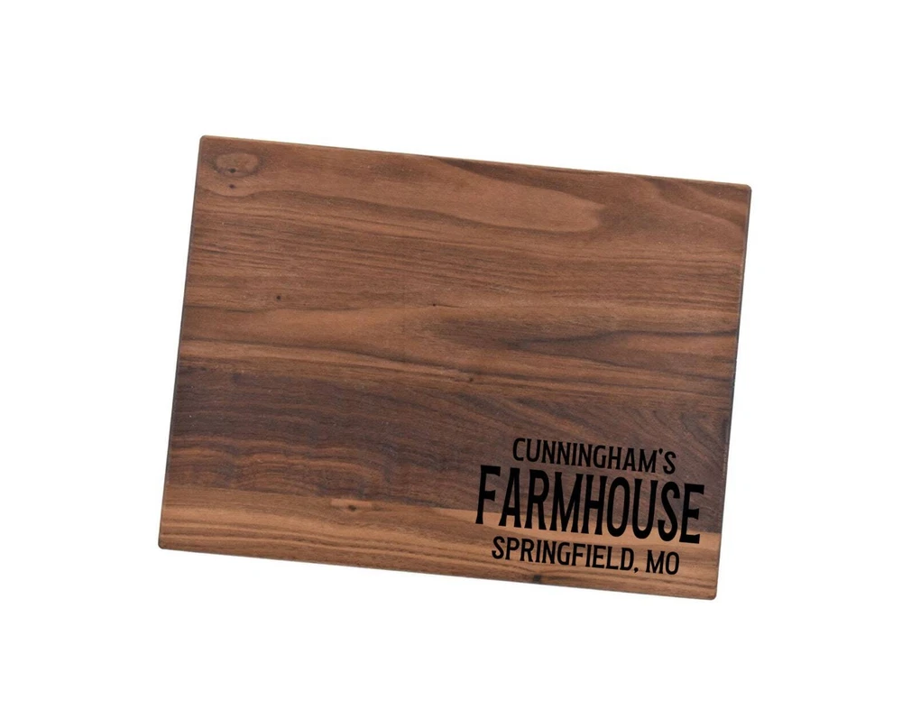 Design: Personalized Farmhouse Cutting Board or Charcuterie Serving Tray All items ship via USPS - please make sure your address is correct :-) Whether used as a charcuterie serving tray for snacks or cutting board, our bamboo, walnut and cherry custom boards are the perfect addition for the home and make the perfect gift for your loved one celebrating a birthday, anniversary, new home, wedding, etc! *** FEATURES *** • SIZES: We have multiple styles and sizes available. To see our current sizes available, click the drop-down menu. The photo slide contains a photo showing each side by side. Please note, the board with the juice groove only has the groove on the front side of the board. • THICKNESS: Bamboo Boards - Approximately 1/2" Thick; Walnut & Cherry Boards - Approximately 3/4” Thick • UNIQUE: Every board is unique with the grain and coloring varying throughout - no board is the same! • CARE INSTRUCTIONS: Hand wash only with warm water. Do not soak. Please apply mineral oil throughout the board’s life. • PERSONALIZATION/CUSTIMIZATION: Do you want the text placed differently on the board? Please don’t hesitate to contact us. All personalization notes can be entered in the personalization box when checking out. • SHIPPING: All cutting boards ship within 2 to 5 business days. • WHOLESALE ORDERS: Please don’t hesitate to contact us for information about wholesale orders. Processing times for larger orders may change. • NOTE: Colors can vary a bit on different monitors and screens. Any props included in photos are not included. Please be sure to double-check your address to make sure it is accurate for USPS delivery. If a package is returned to us due to an invalid address, the buyer is responsible for all additional shipping charges. We appreciate you supporting small business – best wishes! For items ordered with simple edits, we do not send proofs since the layout doesn't change from the example(s). However, in the event there are requests that change the layout from the example(s), we do send proofs for approval before making the product. If you'd like a proof before we make the product, please note so in the personalization box.