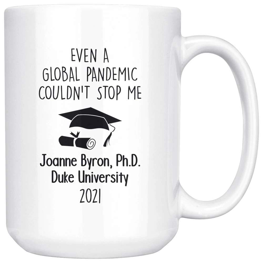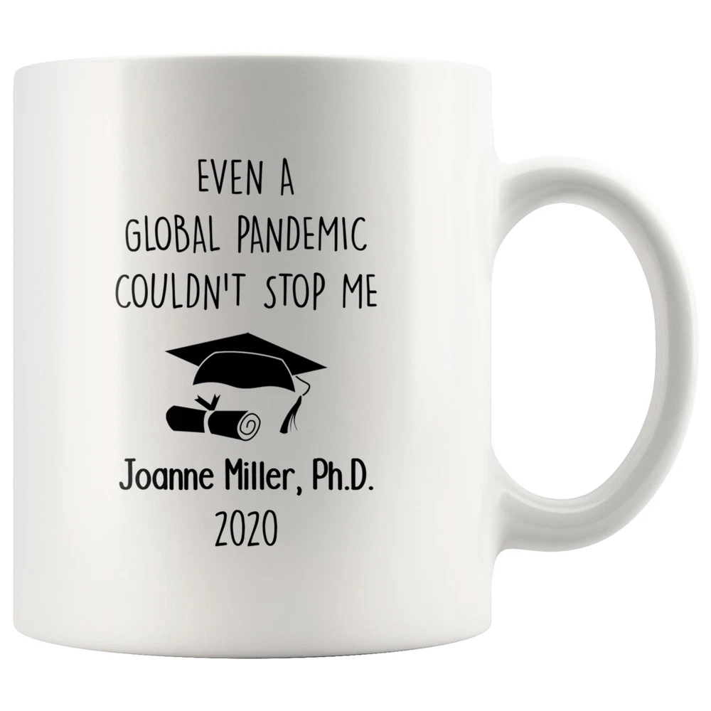Personalized Graduation Mug Gift Even A Global Pandemic Couldn't Stop Me Product Details.. This high quality 11oz. ceramic white mug has a premium hard coat that provides crisp and vibrant color reproduction sure to last for years. Perfect for all hot & cold beverages. The highest quality printing possible is used. It will never fade no matter how many times you wash it. Material: 100% Ceramic. Print both sides. Dishwasher and Microwave Safe. High Gloss + Premium White Finish. Printed in the U.S.A. Personalized & Custom. We support personalized and custom mug to add custom, when placing an order, you can add notes to the "order note" in shipping address section. Also you can contact us directly via message. Shipping Info. Ready to ship in 1 to 2 business days, All products are made-to-order and proudly printed in the United States. Shipped by USPS and DHL, You will receive your order in 5-7 days. Replace & Refund. All products are defective during shipping broken, chipped will be replaced free of charge. You are not satisfied with the product, we will refund 100% money to you. If any other issues arise, please do not hesitate to message, we would be more than happy to assist you.
