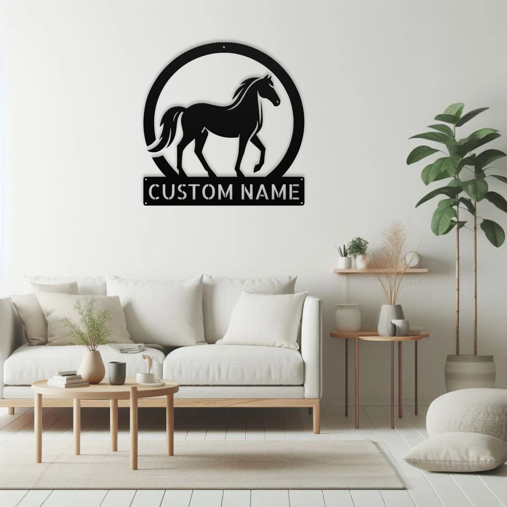 Product Description Personalized Horse Metal Sign Custom Wall Art Decor Gift for Horse Lovers Home Bring elegance to your space with our Personalized Horse Metal Sign ! This custom wall art decor is perfect for horse lovers, adding a unique touch to any room. Made from high-quality 16-gauge metal, this sign features a durable powder coating that makes it resistant to dust, weather, and water, ensuring it looks great inside or outside. Searching for a meaningful gift? This personalized metal sign is an ideal choice for Christmas, birthdays, or any special occasion. It also makes a lovely addition to your own home or office, showcasing your passion for horses. Key Features: Customizable Design : Personalize the sign with your name or a special message. Durable Material : Made from 16-gauge high-quality metal for lasting beauty. Weather-Resistant : Powder-coated finish protects against dust, rain, and rust. Versatile Decor : Suitable for both indoor and outdoor display. Great Gift Idea : A thoughtful present for any horse enthusiast. Celebrate your love for horses or surprise a friend with this beautiful metal sign. Order yours today and add a personal touch to your decor! Service and Color Choice Our metal signs are designed to be personalized just for you, making them the perfect addition to any space! The default color for our signs is Black , but we also offer a variety of beautiful options including Copper, Gold, White, and Silver . After placing your order, simply contact us with your preferred color choice, and we'll ensure your sign is exactly how you envision it. Let’s create something special together!