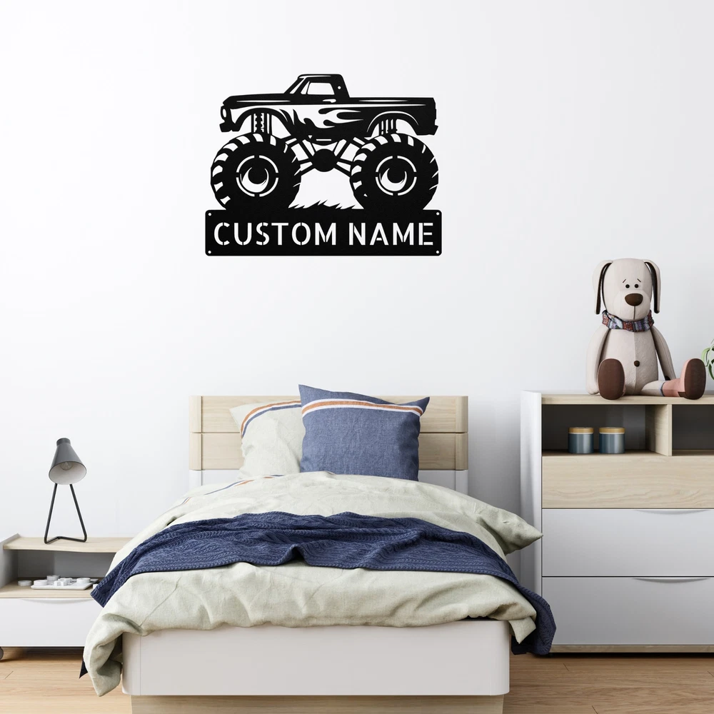 Product Description Personalized Monster Truck Metal Sign Custom Kids Room Decor Truck Lovers Gifts Rev up your decor with our Personalized Monster Truck Metal Sign ! Perfect for any young truck enthusiast or for adding a playful touch to your space, this sign is sure to impress. Crafted from 16 gauge high-quality metal , this sign is built to last. The powder coating makes it dust, weather, and water-resistant , ensuring it looks great both indoors and outdoors. Key features include: Customizable Design: Add a name or special message to create a unique sign that stands out. Durable Material: Made from high-quality metal, designed to withstand the elements. Great Gift Idea: Perfect for Christmas, birthdays, or any special occasion for truck lovers. Versatile Use: Ideal for a child’s bedroom, playroom, garage, or any space that needs a fun touch. Bring excitement and personality to your decor with the Personalized Monster Truck Metal Sign ! It’s not just a sign; it’s a celebration of your passion for all things monster trucks! Service and Color Choice Our metal signs are designed to be personalized just for you, making them the perfect addition to any space! The default color for our signs is Black , but we also offer a variety of beautiful options including Copper, Gold, White, and Silver . After placing your order, simply contact us with your preferred color choice, and we'll ensure your sign is exactly how you envision it. Let’s create something special together!