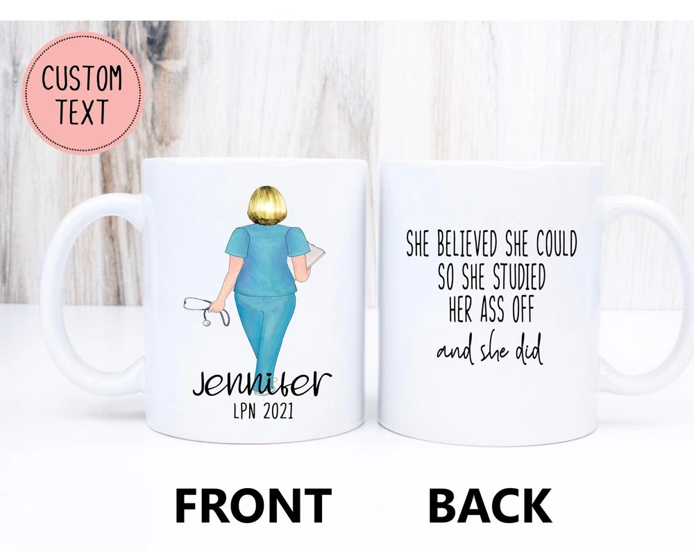 Personalized Nurse Graduation Gift She Believed She Could Studied Her Ass Off Product Details.. This high quality 11oz. ceramic white mug has a premium hard coat that provides crisp and vibrant color reproduction sure to last for years. Perfect for all hot & cold beverages. The highest quality printing possible is used. It will never fade no matter how many times you wash it. Material: 100% Ceramic. Print both sides. Dishwasher and Microwave Safe. High Gloss + Premium White Finish. Printed in the U.S.A. Personalized & Custom. We support personalized and custom mug to add custom, when placing an order, you can add notes to the "order note" in shipping address section. Also you can contact us directly via message. Shipping Info. Ready to ship in 1 to 2 business days, All products are made-to-order and proudly printed in the United States. Shipped by USPS and DHL, You will receive your order in 5-7 days. Replace & Refund. All products are defective during shipping broken, chipped will be replaced free of charge. You are not satisfied with the product, we will refund 100% money to you. If any other issues arise, please do not hesitate to message, we would be more than happy to assist you.