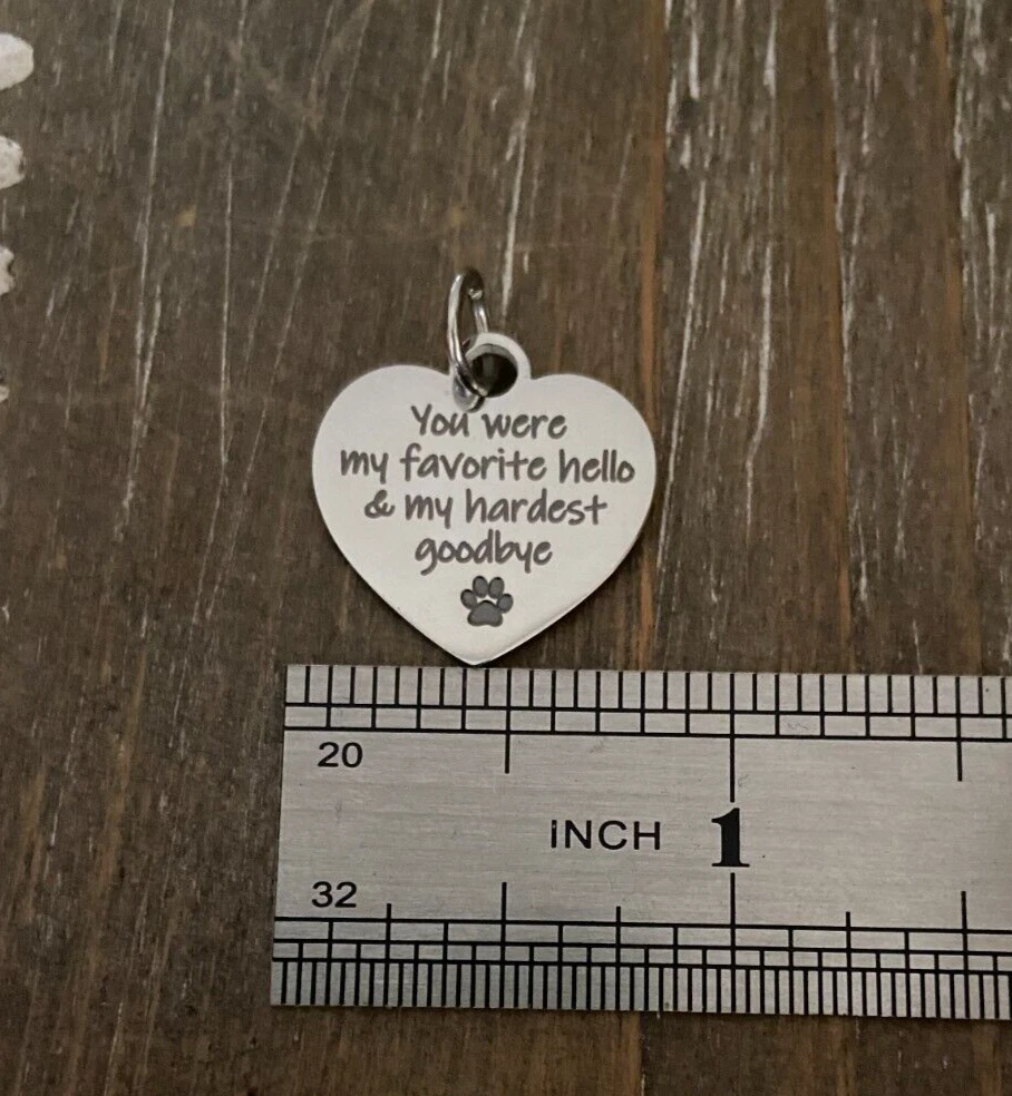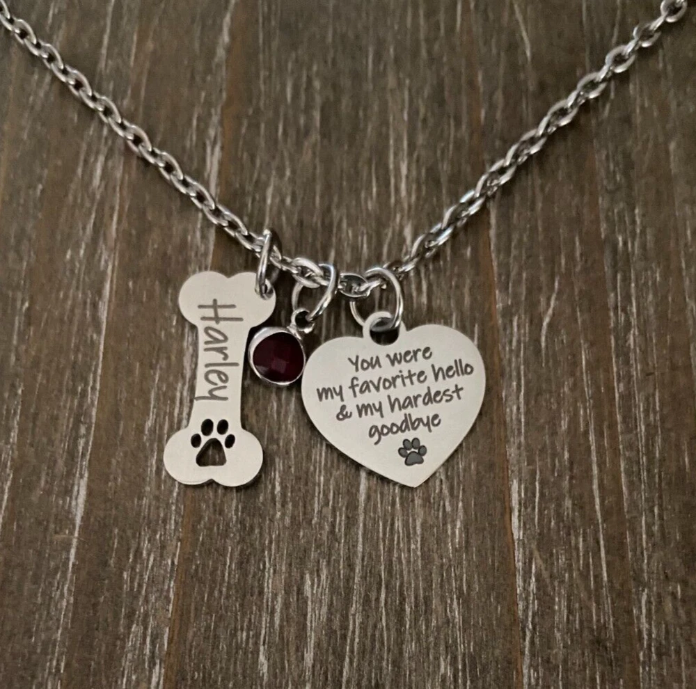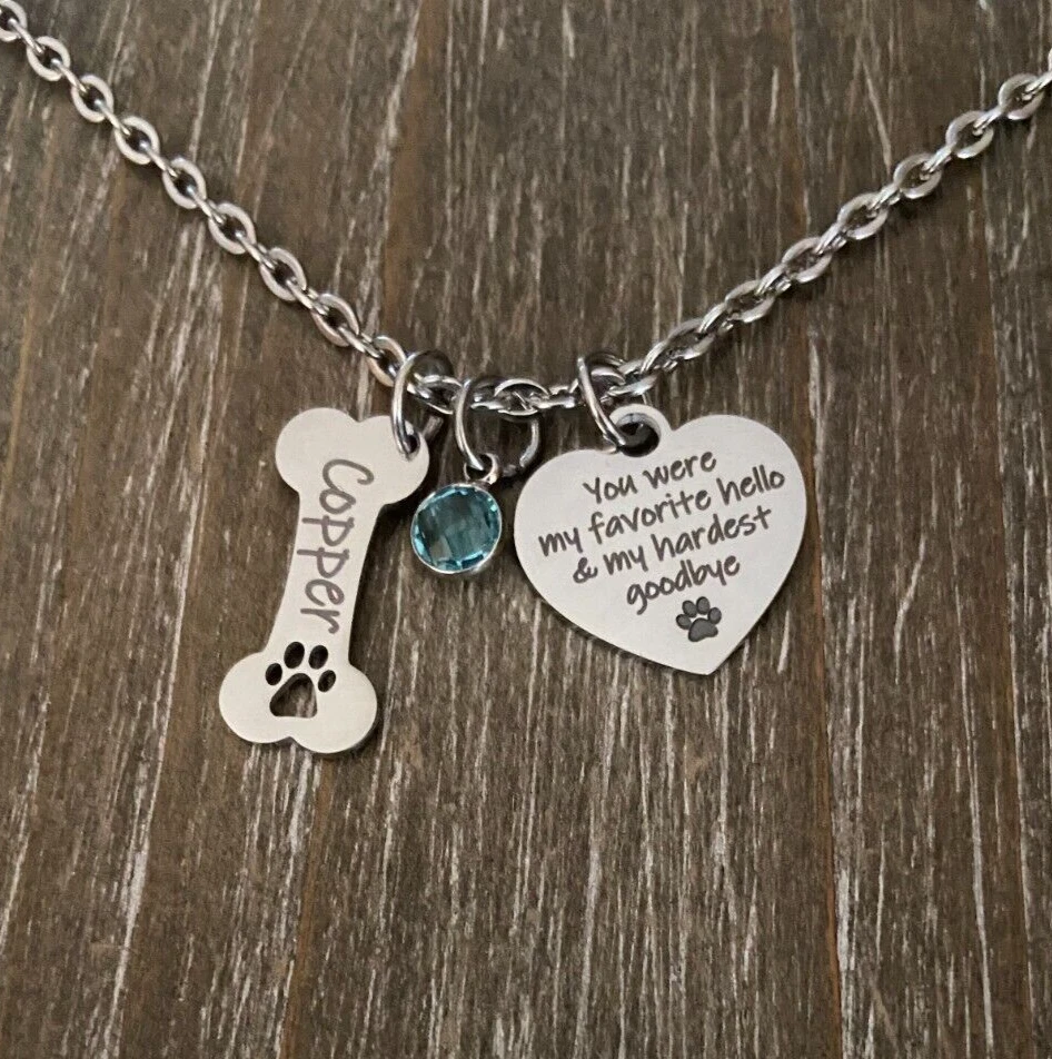 Listing is for custom Completed Pet Name Necklace, Necklace includes Bone with your choice of pet Name ( up to 10 characters ), choice of crystal and Heart with You were favorite hello and my hardest goodbye. Pendants come on a 18 inch Stainless Steel chain. 24 inch is available on request Bone is approx. 1 inch Stainless Steel Crystal is Genuine Crystal Necklace will come to you in a gift box :) *Please be sure to leave name ( up to 10 characters ) and crystal choice in purchase notes or messages to seller :) Stainless Steel doesn't need polished, will not tarnish and doesn't stain the surrounding skin. It's properties are hypoallergenic for those with metal allergies. *Due to obvious reasons cremation urns are not returnable so please follow enclosed instructions carefully.