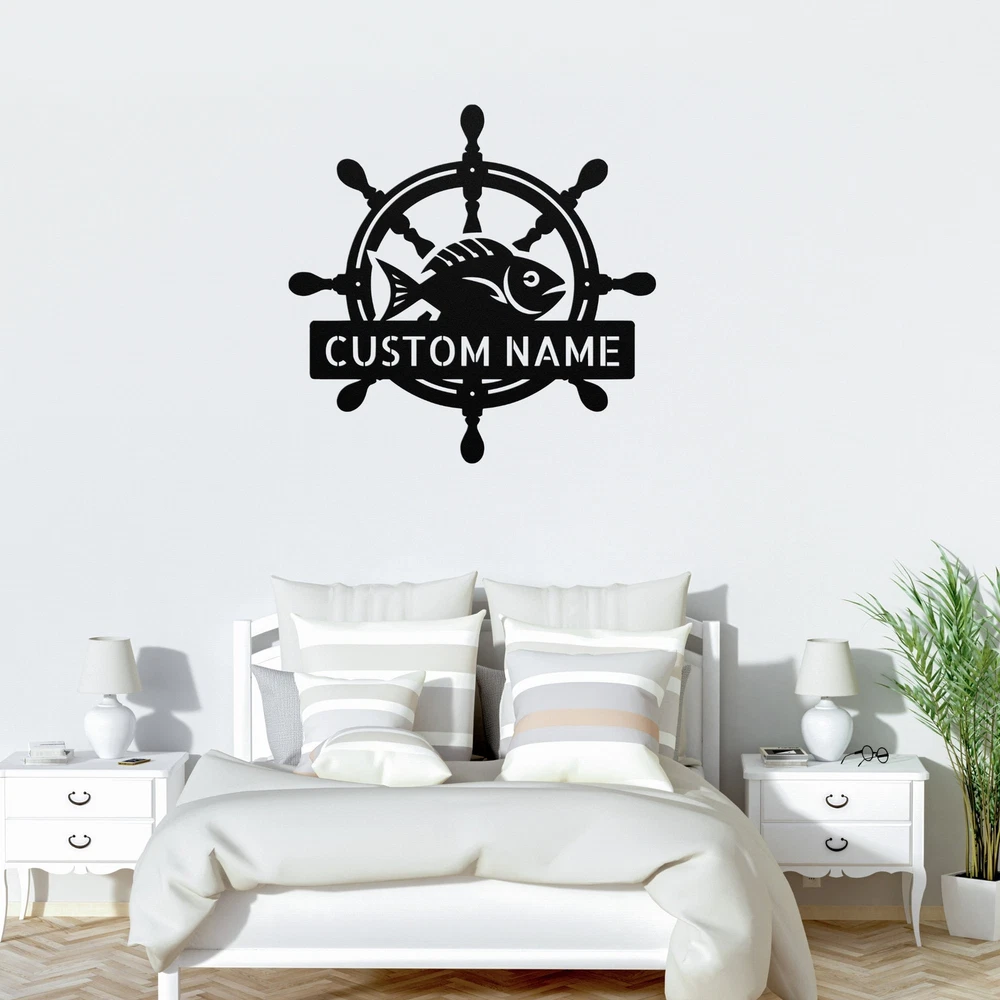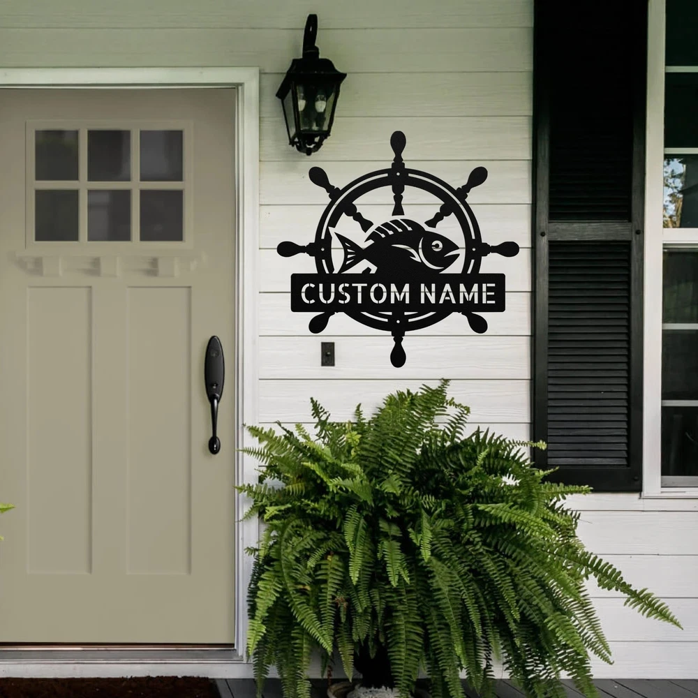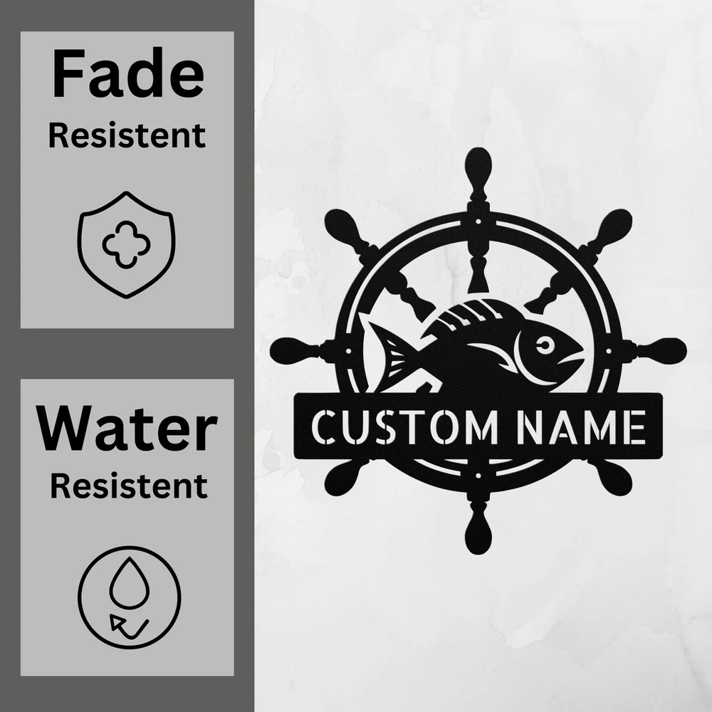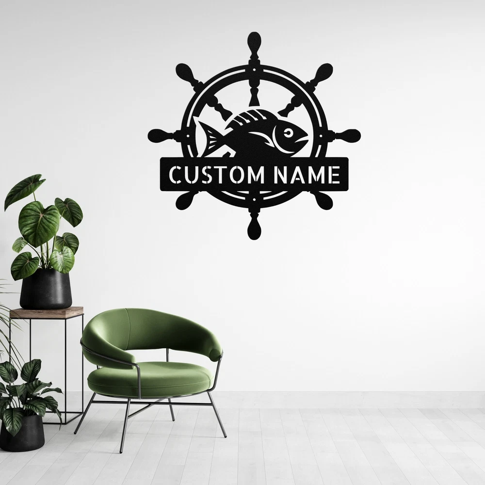 Product Description Personalized Ship Wheel Fish Metal Sign Custom Nautical Decor Fishermen Gifts Introduce a touch of nautical charm to your space with our Personalized Ship Wheel With Fish Metal Sign . This beautifully crafted sign is perfect for anyone who loves the sea and fishing. Made from 16 gauge high-quality metal , this sign is designed to withstand the elements. The powder coating adds a protective layer, making it dust, weather, and water-resistant. Key features include: Customizable Design: Add your name or a special message to make it uniquely yours. Durable Construction: Built to last, ensuring your decor remains stunning for years. Great Gift Idea: Perfect for Christmas, birthdays, or any special occasion for fishing enthusiasts. Versatile Decor: Ideal for your home, office, or as a statement piece in your boat. Make a statement with the Personalized Ship Wheel With Fish Metal Sign . It’s not just decor; it’s a celebration of your love for the ocean! Service and Color Choice Our metal signs are designed to be personalized just for you, making them the perfect addition to any space! The default color for our signs is Black , but we also offer a variety of beautiful options including Copper, Gold, White, and Silver . After placing your order, simply contact us with your preferred color choice, and we'll ensure your sign is exactly how you envision it. Let’s create something special together!