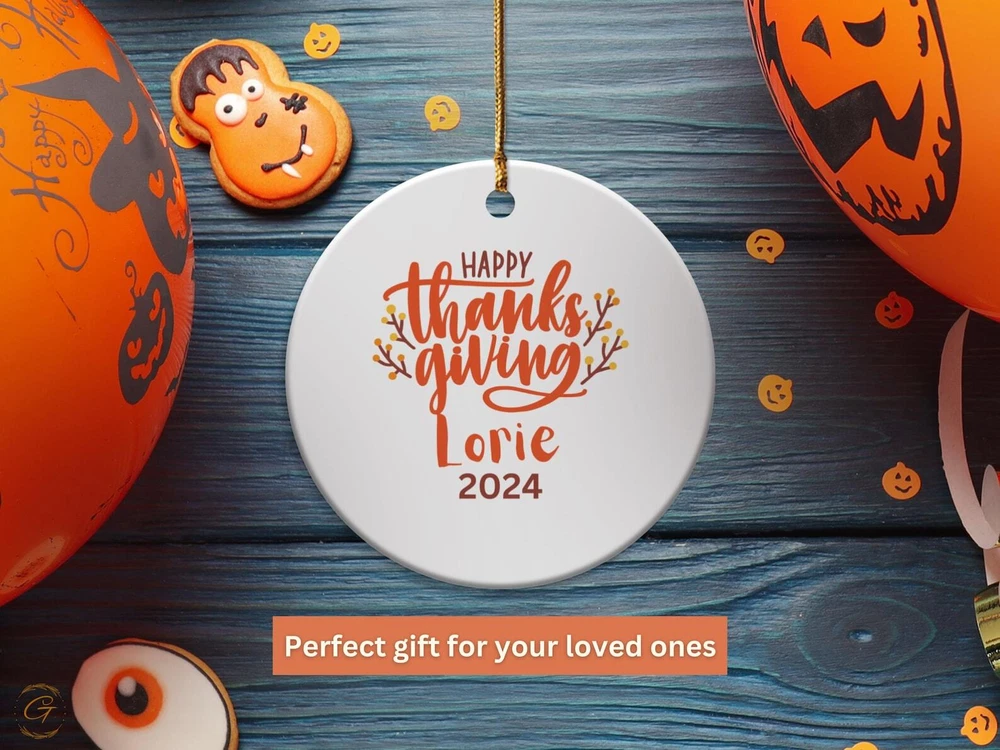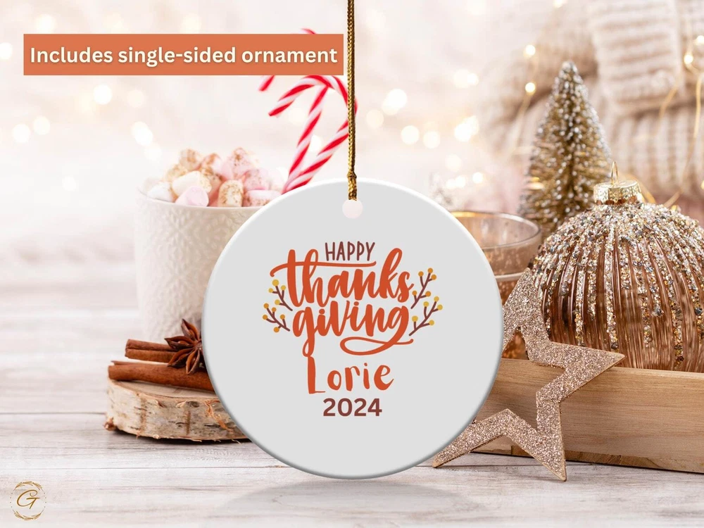 Personalized Thanksgiving Ornament 2024 Festive Decoration Gift Holiday Keepsake With Custom Name Holiday Season Customized Keepsake Gift Material: Ceramic Color: White Shapes: Circle, star, heart and oval Can be printed on both sides Imprint full-color artwork, photos, or logos Hole for hanging string and hanging string included Printed in the USA