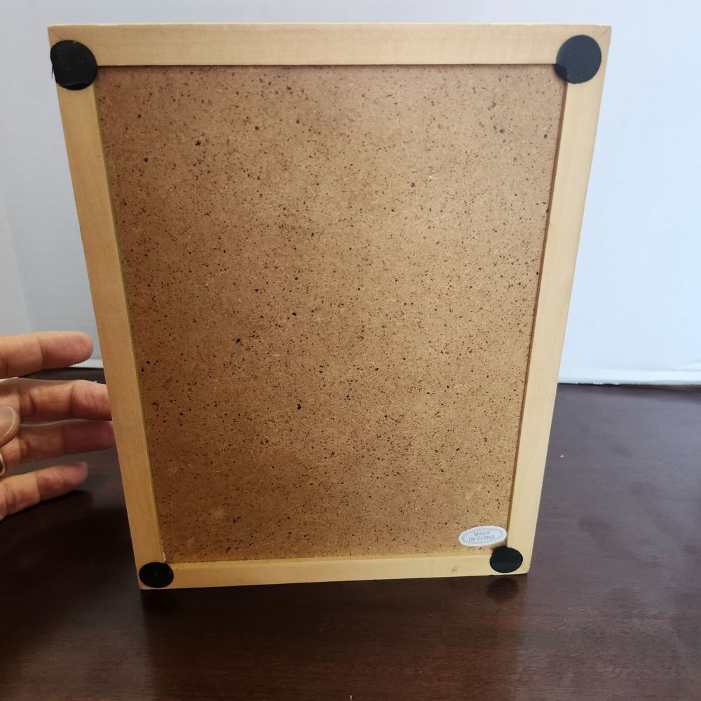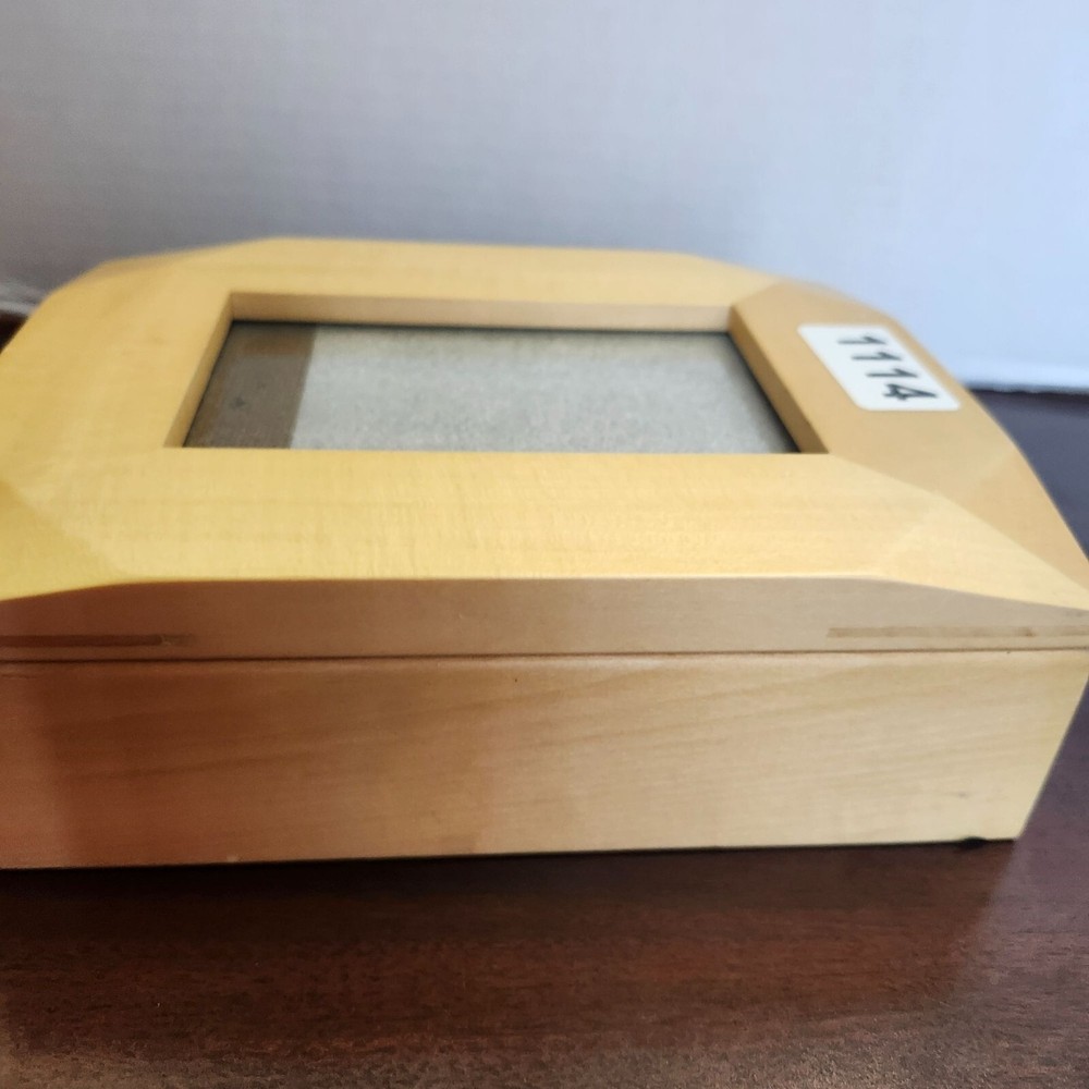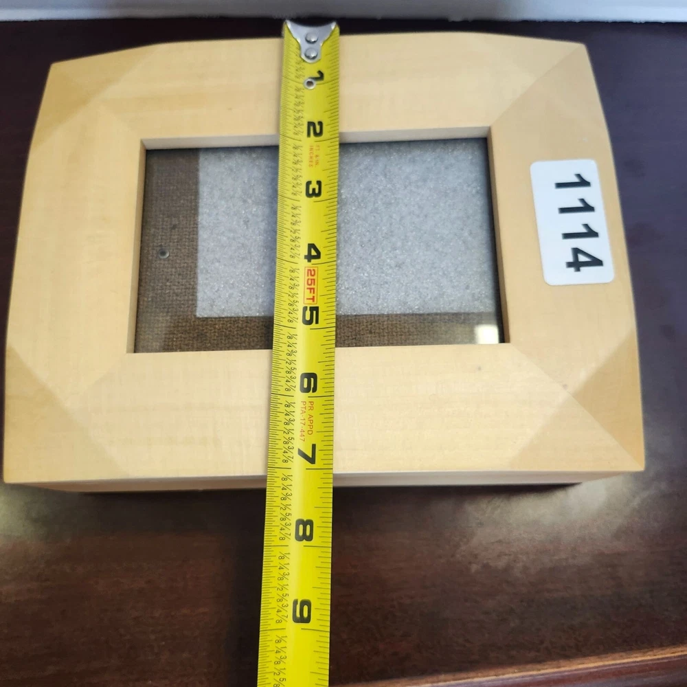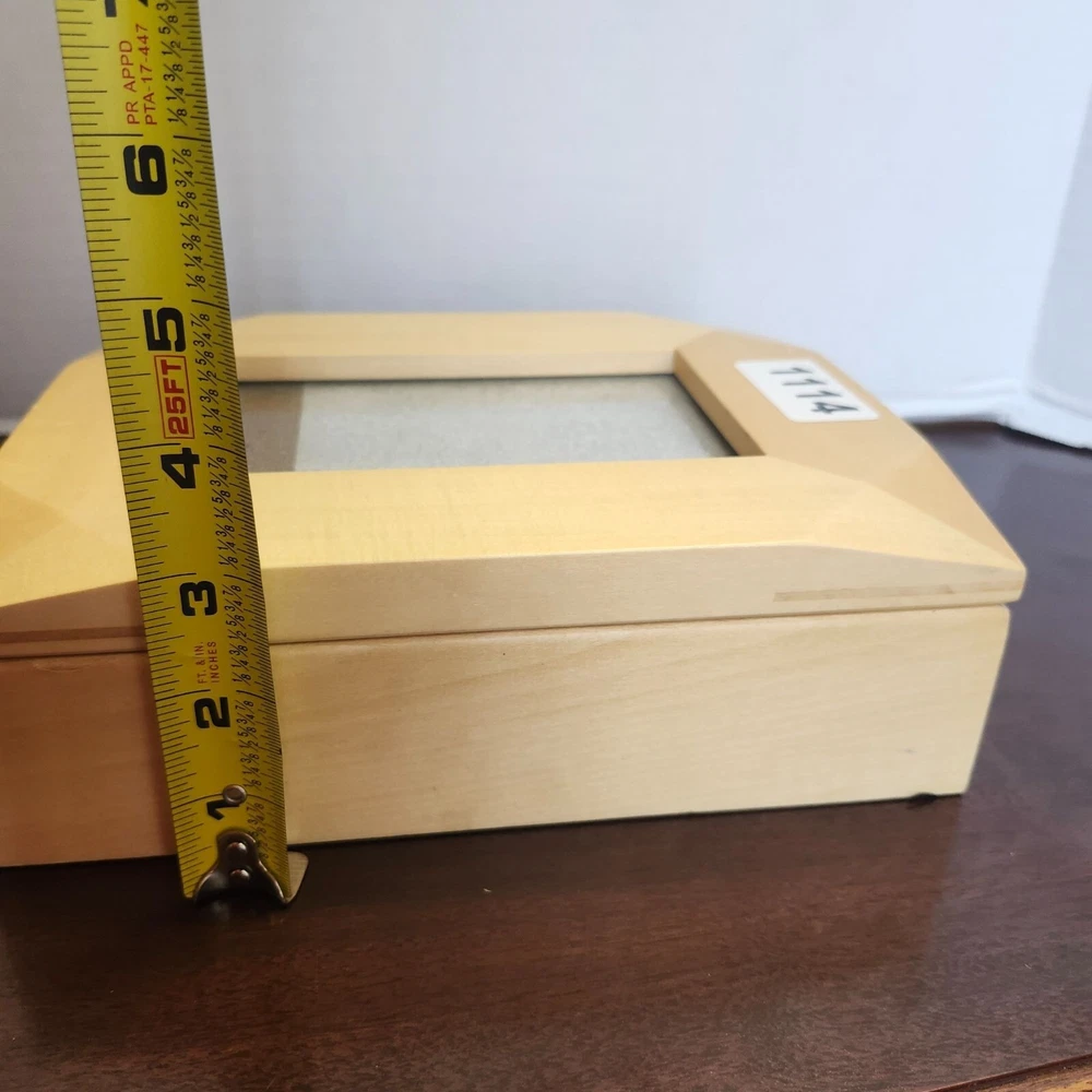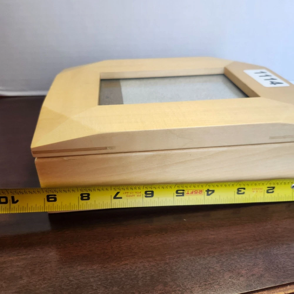 This wooden keepsake box offers a dual-purpose design with a picture frame lid. Ideal for storing small valuables or mementos. • Wooden construction • Hinged lid with picture frame (fits 4" x 6" photo) • Felt-lined bottom • Dimensions: 11" x 8" x 3" Wood has minor scuffs on the lid.