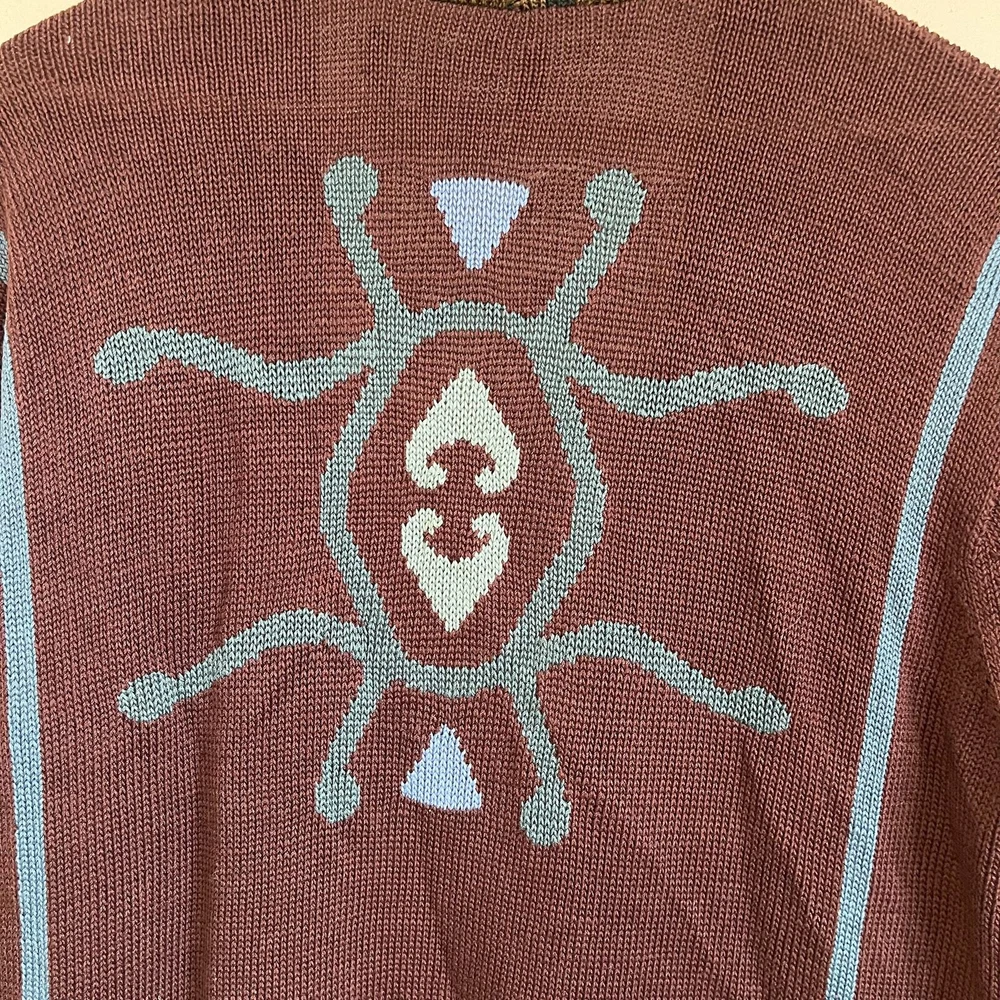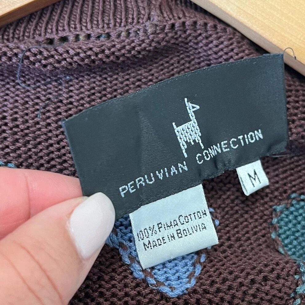 Western Southwestern Open Front Knit Long Sleeve 100% Pima Cotton Peruvian Connection Boho Moroccan Colorful Sweater Duster Jumper Jacket Tunic Kimono 100% Pima Cotton Made in Bolivia Thick heavy tight knit open front sweater Beautiful rich fall colors of brown teal and green Hand wash Sz Medium armpit 21 sleeve 21 length 31 Beautiful condition with tag detached on one side see pic
