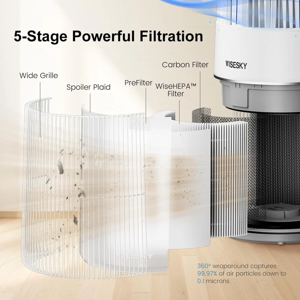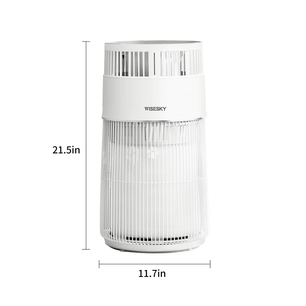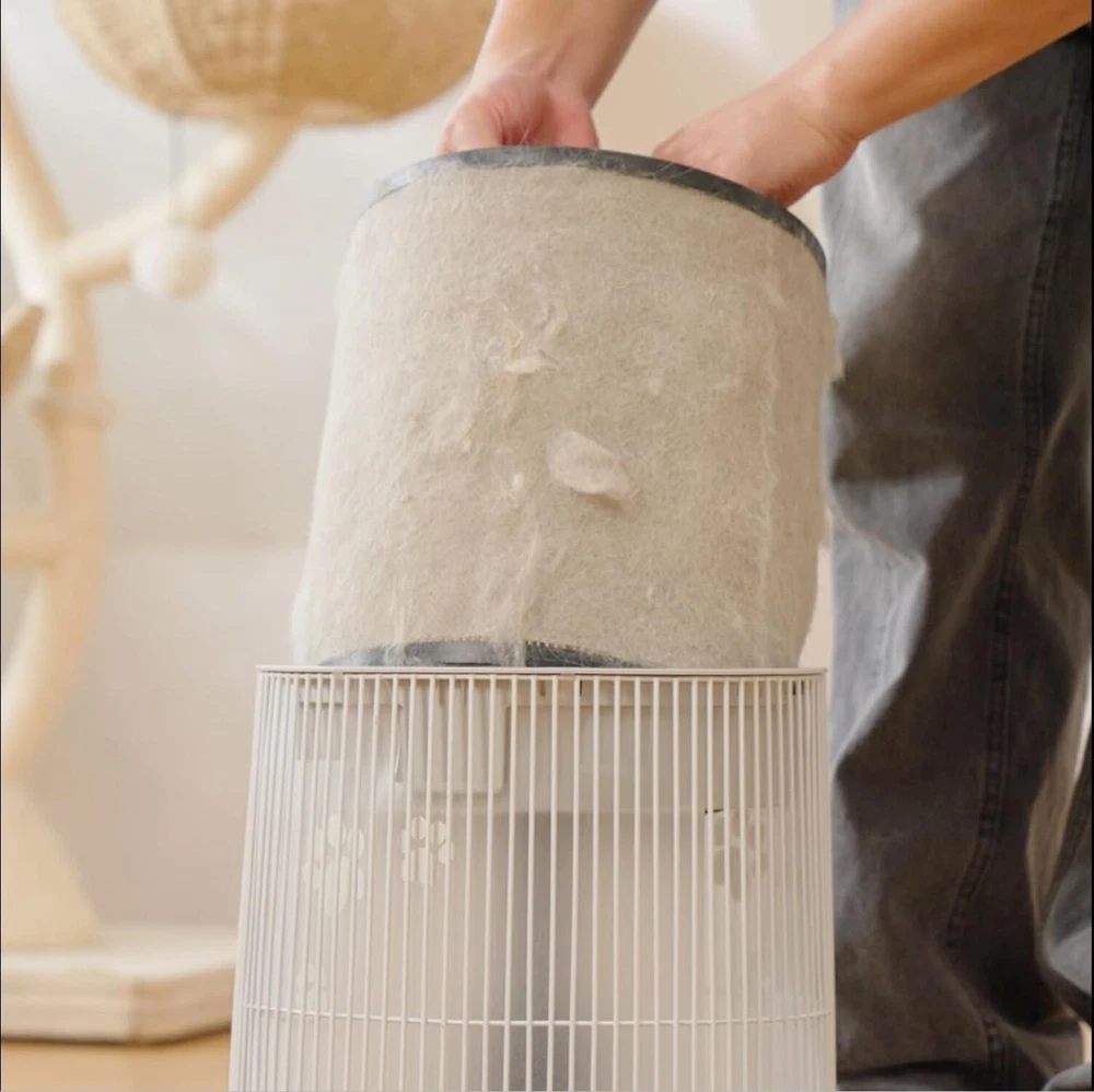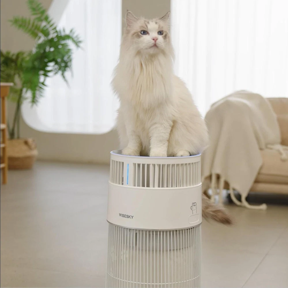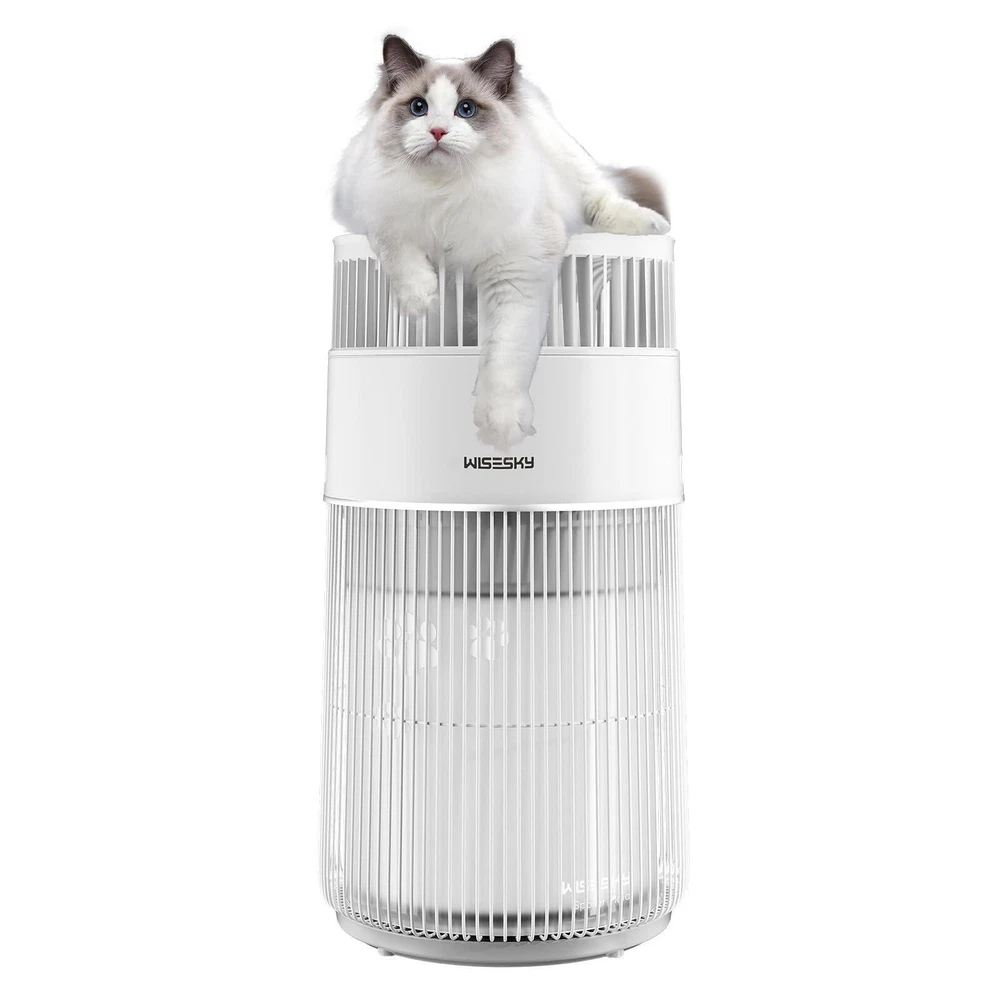 Pet Air Purifier, 3-in-1 HEPA Filter for Cat Hair Dander Odor Dust, Quiet 360° Air Intake Large Room Air Cleaner Covers Up to 1644 Ft², with Smart APP Control, W-Cat Model POWERFUL PET HAIR ADSORPTION - W-Cat prefilter captures pet hair, dust, and dander with ease. Its unique 360° visible wide grille inlet with a spoiler pattern quickly sucks in floating dander, keeping your home clean and comfortable. Cat hair adsorption filters can be torn out and replaced with new ones PET-FRIENDLY DESIGN - Bite-proof power cord, 24v low voltage and automatic power-off function when 45° tipped off. The three-color light could be turn off easily at night, and 7.5mm gap prevent cat's paw from getting stucked. These features provide extra safety, giving you peace of mind knowing your feline friends are protected QUIET MODE FOR BETTER SLEEP - Fixed speed mode doesn’t frighten pets. The quiet mode ensures that both you and your furry friends enjoy peaceful, undisturbed sleep at night EFFICIENT ODOR REDUCTION- Hepa air purifier advanced filtration system reduces 99.97% of 0.1-micron particles, including cat hair and other tiny particles. It effectively breaks down PM2.5, PM10, and VOCs. The high-efficiency activated carbon filter absorbs smoke, pet odors, and cooking smells, ensuring your home's air stays fresh and clean SMART AIR QUALITY MONITORING - PM2.5 and TVOC sensors monitor indoor air quality 24/7. The three-color air quality indicator shows real-time AQI, helping you keep track of the air quality in your home and ensure a healthy environment for your family, and our smart app can help you monitor at anytime anywhere Product Dimensions 11.65"D x 11.65"W x 21.5"H Specification Met FCC Certified, CARB Certified, EPA Certified Noise Level 23 dB