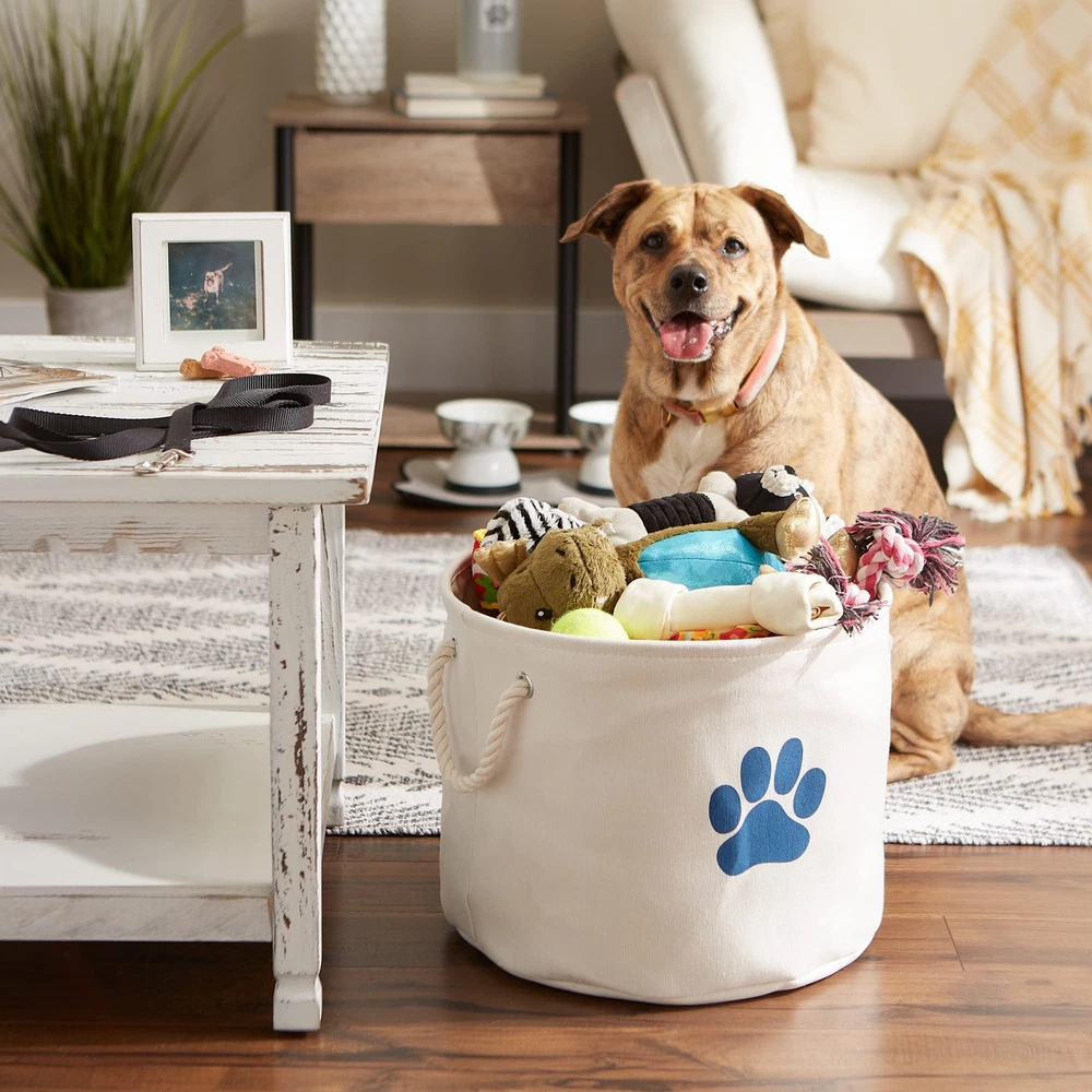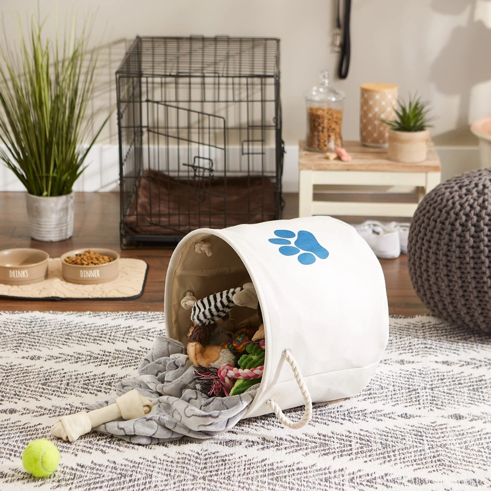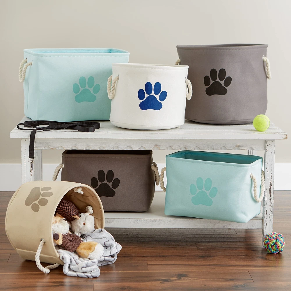 All pet products have your pet's comfort and in mind. Pamper your pets with our quality pet storage items, towels, blankets, pet mats and beds, bowls, treat canisters and more! MEDIUM ROUND BIN: Measures 12 x 15 x 15", the storage basket stands upright and the convenient handles make it easy to transport or move when needed. Simply collapse bin and when not in use. Holds up to approximately 20 lbs (9 kg). MATERIAL AND CARE: 100% Polyester, durable and long-lasting use. Wipe clean with a damp cloth. CUTE AND STYLISH FOR ANY ENVIRONMENT: The refreshing design and subtle texture of these baskets makes them great decor pieces for your home, pet-lovers or new pet owners ORGANIZATIONAL SOLUTION FOR THE HOME: Perfect for holding dry dog treats, leashes, collars, toys, blankets, outfits, grooming supplies and more! MORE PET STORAGE OPTIONS: offers various pet products including pet bed, pet towels, pet mats, pet bowls & blankets, and storage bin. For more options, search or click the link at the top.