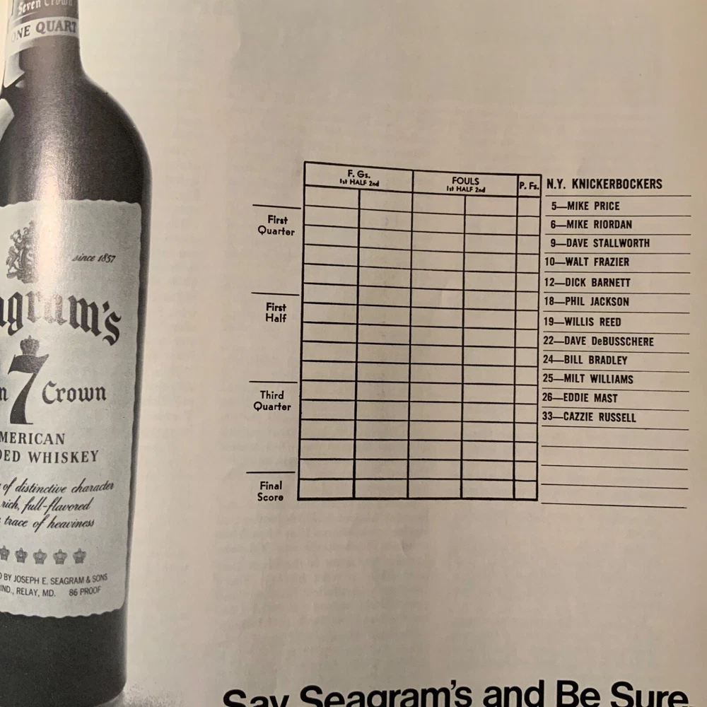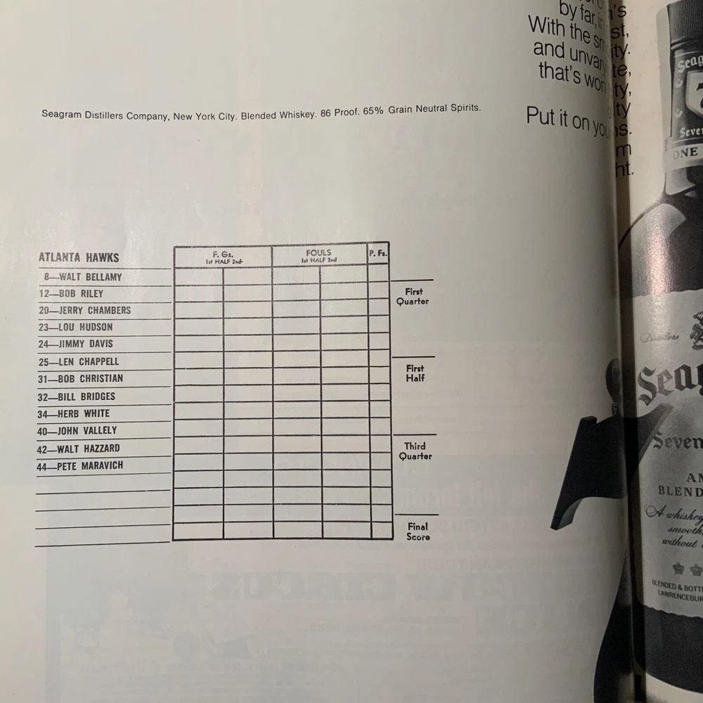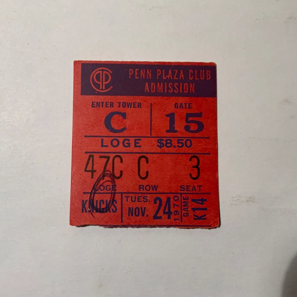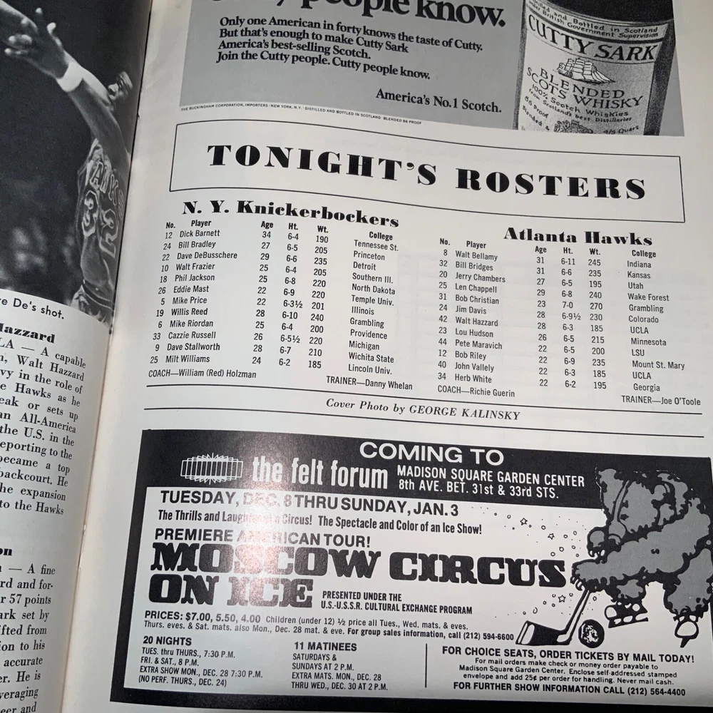 VG - EX. November 24, 1970 - Madison Square Garden. Program and ticket stub from early season game between the visiting Atlanta Hawks and the New York Knicks. Walt Frazier scored 33 points and Willis Reed put up a 23/19 double-double to lead the Knicks to a 128 - 119 victory. This was Hawks rookie Pete Maravich’s first regular season NBA game at Madison Square Garden, and he responded by scoring 40 points for the first time in his young career. Bill Bridges chipped in 21 points & 20 rebounds in the losing effort.