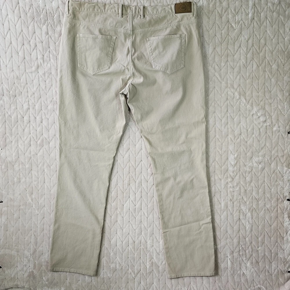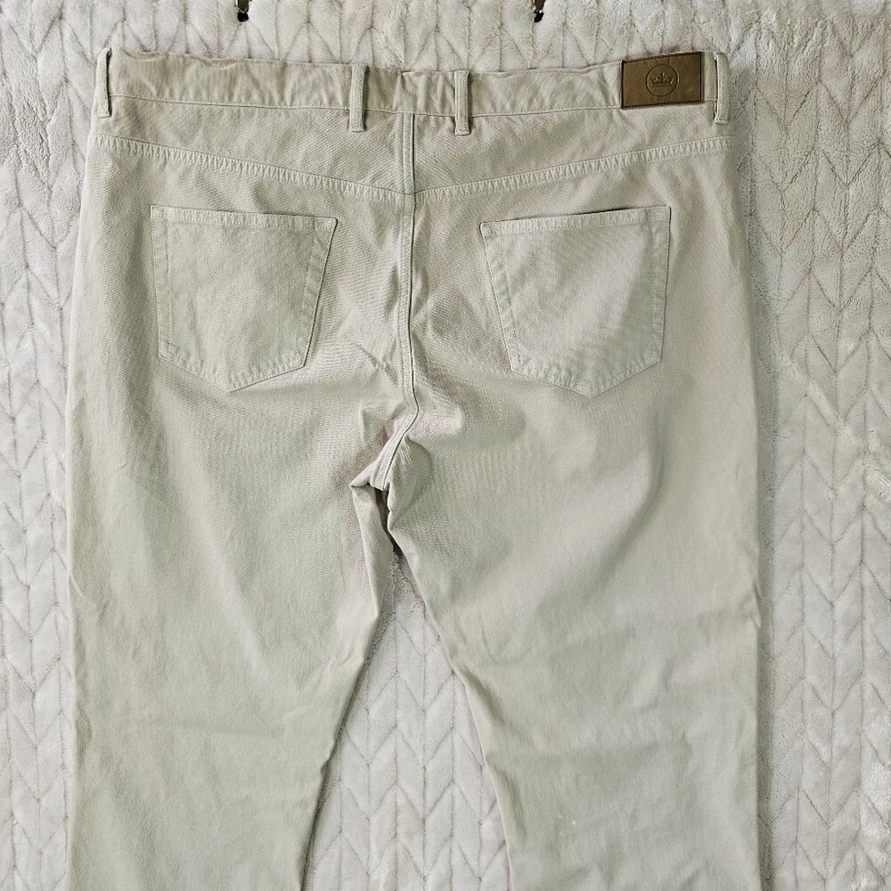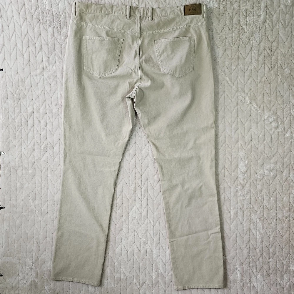 Classic pair of high quality khaki canvas pants. In a size 40 with a 32" inseam. In excellent pre owned condition, has a small bleach spot on the front of the leg and the back of the leg, I show the spots in the photos. See photos for full details.