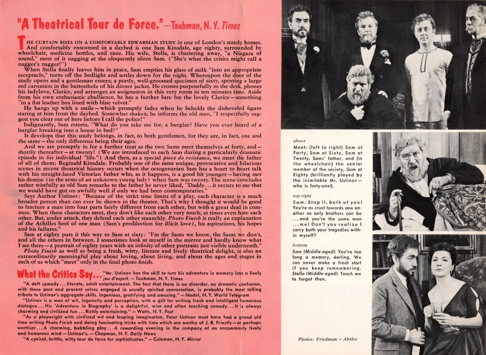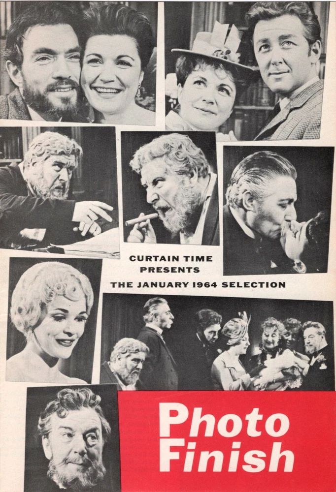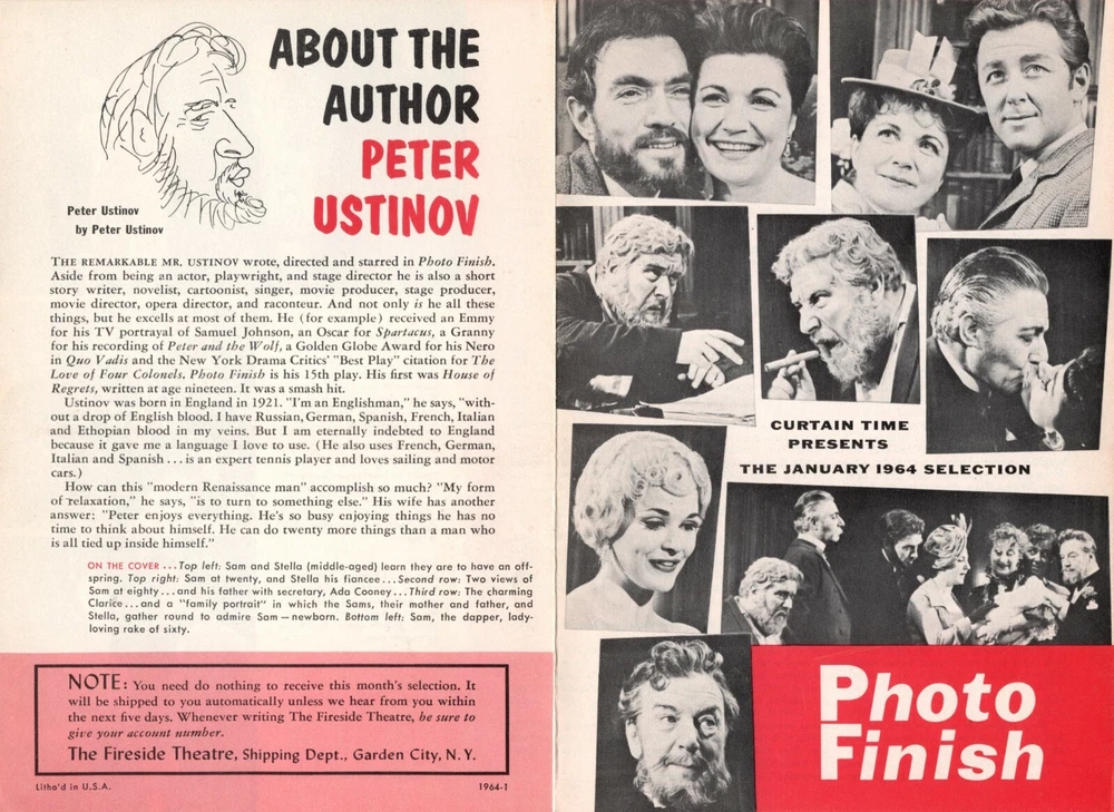This is a rare "Curtain Time" Fireside Theatre insert promoting the Book Club's hardcover selection for the month of January 1964: The Original Broadway script of the PETER USTINOV play "PHOTO FINISH". ( The Broadway production opened February 12th, 1963 at the Brooks Atkinson Theatre in New York City and closed June 29th, 1963 after 159 performances. The Original West End production opened April 25th, 1962 at the Saville Theatre in London and ran for 253 performances. ) ..... The play starred PETER USTINOV, EILEEN HERLIE, PAUL ROGERS and DENNIS KING and featured DONALD DAVIS, JOHN HORTON, PADDY EDWARDS, JESSICA WALTER and CYNTHIA LATHAM ..... CREDITS: Book by PETER USTINOV; Sets designed by DON ASHTON; Costumes designed by FRANK THOMPSON; Directed by PETER USTINOV and NICHOLAS GARLAND; Produced by JOSEPH E. LEVINE and ALFRED de LIAGRE, Jr. ..... DETAILS: The four page insert measures 5" X 7 1/4" inches and includes promotional text, a number of production photos, a bio of the playwright, a brief synopsis of the story and excerpts from several New York reviews ..... CONDITION: This rare flyer is in excellent condition and will make a wonderful addition to the collection of any theatre aficionado or historian. This item will be carefully packaged in a protective, carded sleeve and backed by stiff cardboard.