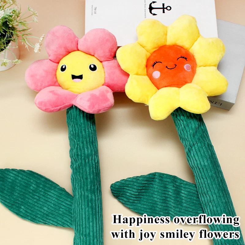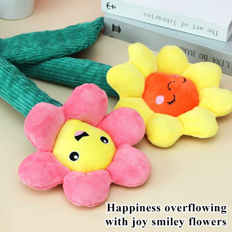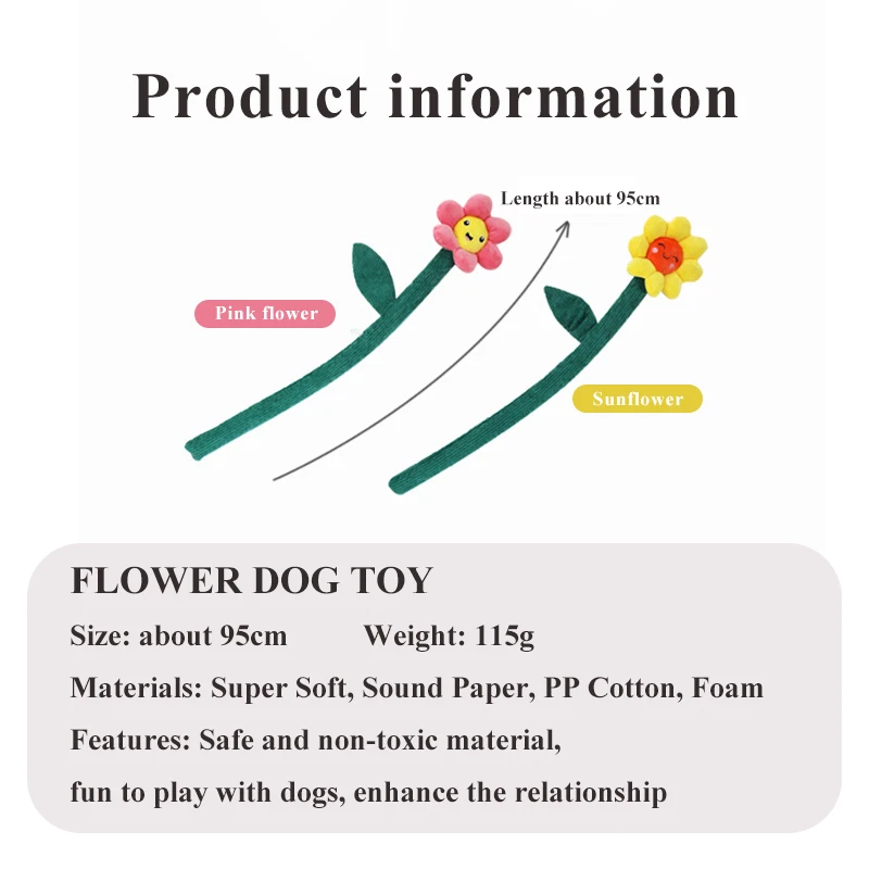 FLOWER DOG TOY Happy smiley flower, fun squeaky toy Product information Size: about 95cm / Weight: 115g Materials: Super Soft, Soundable Paper, PP Cotton, Foam Features: Safe and non-toxic material, fun to play with dogs, enhance the relationship Dogs love to play and have fun Happiness overflowing with joy smiley flowers Two flower shapes Cute without repeating