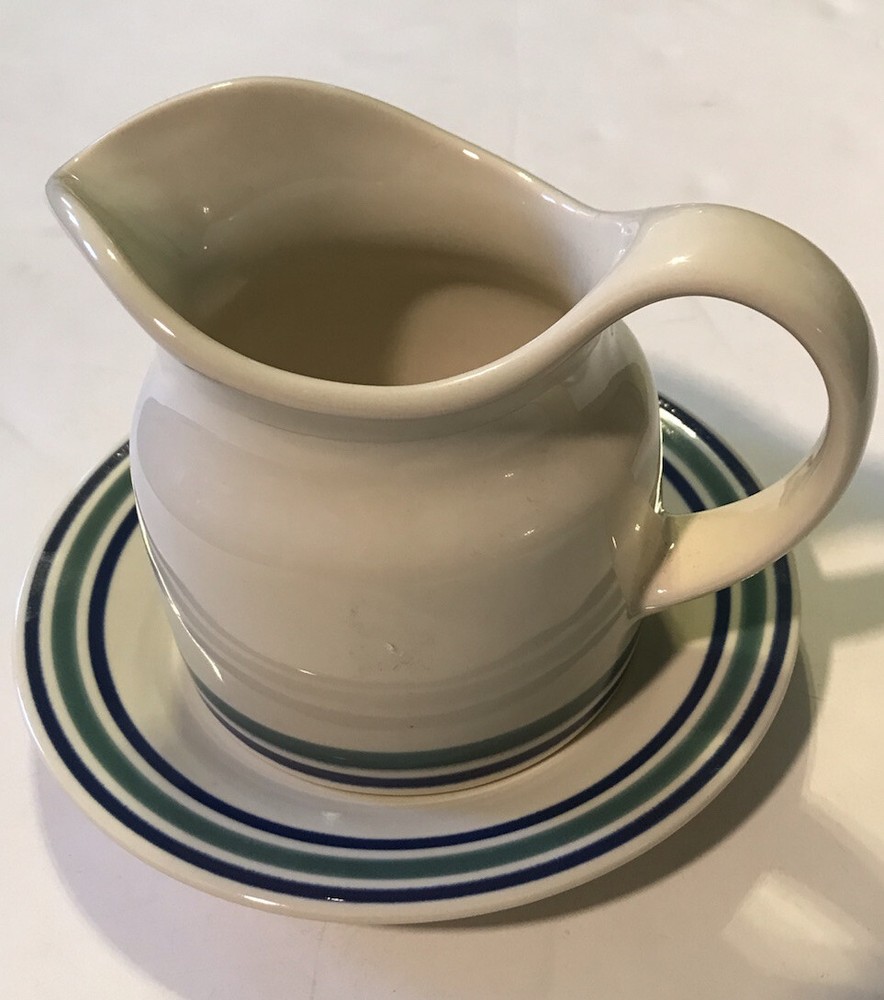 This Pfaltzgraff ceramic pitcher and plate set is a stunning addition to any collection. The pitcher has a capacity of 18 oz and features a round shape with decorative lines in multicolor. The glossy finish and art deco style make it a perfect item for display or use. The set is made in the United States and features original art pottery production style. It is handmade with care instructions of machine washable. The plate set complements the pitcher with its beautiful design and antique vibe. This 2-piece set is perfect for those who love vintage and American-themed items.