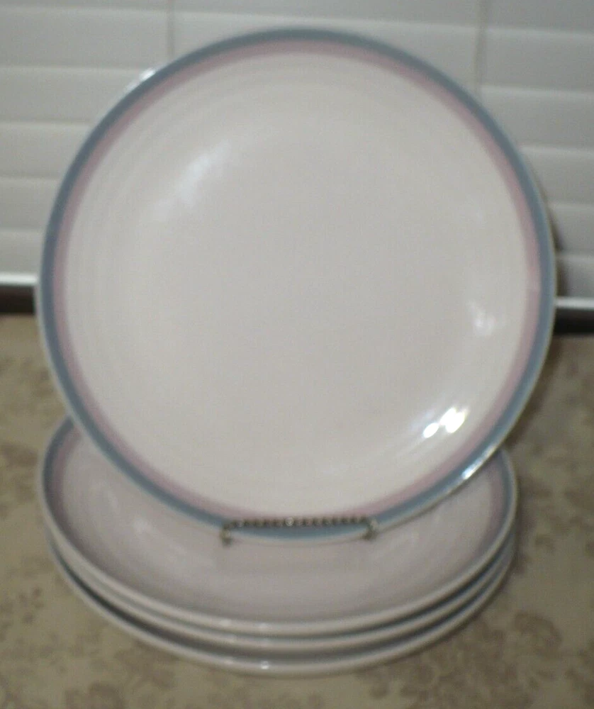 This is a 4 Piece Set of Dinner Plates by Pfaltzgraff, made in the USA, in the pattern called Aura. It features a beige background with blue and pink bands. They measure 9-7/8", and all are in good condition with no chips or cracks but do have some minor utensil marks with normal use.