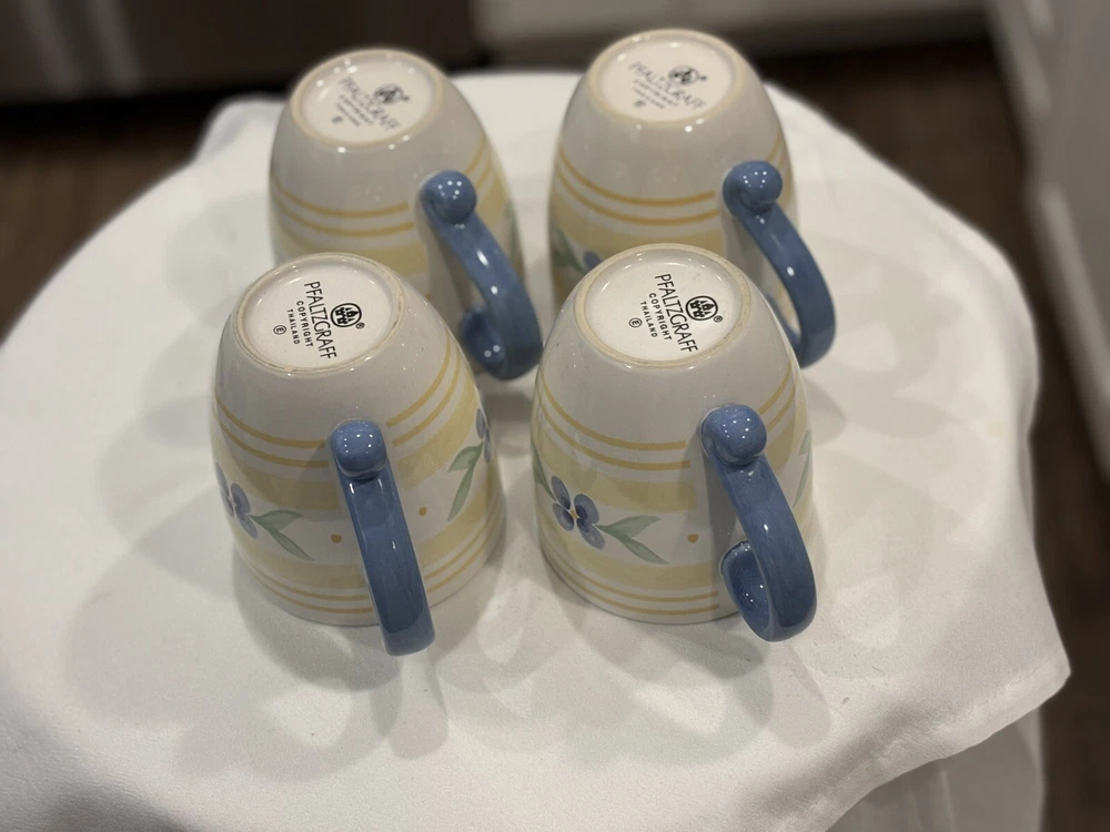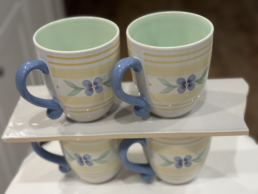 The "Summer Breeze" Pfaltzgraff Mugs Set features a vintage Four-Piece collection of round mugs with a capacity of 14-16 oz. each. Manufactured in 1990, the mugs are decorated with a colorful floral pattern of blue flowers and yellow plaid trellis, adding a touch of summer charm. These contemporary-style mugs are microwave and dishwasher safe, making them convenient for everyday use. Crafted from stoneware with a glossy finish, these mugs are a delightful addition to any table setting for all occasions. Return accepted within 30 days; buyer pays return shipping Thank you for your consideration