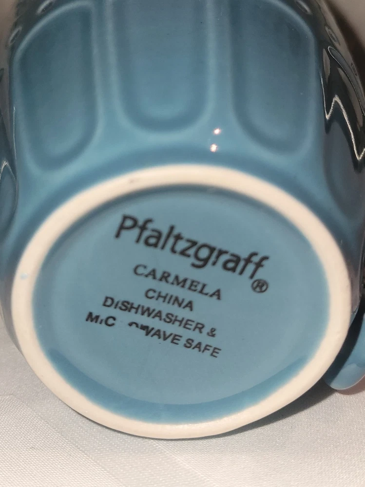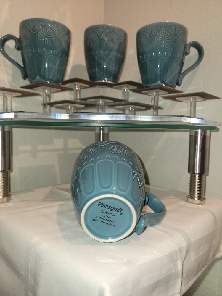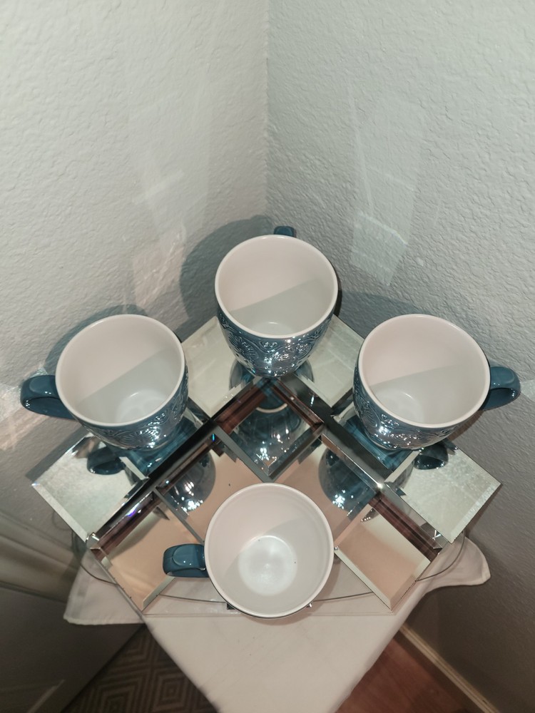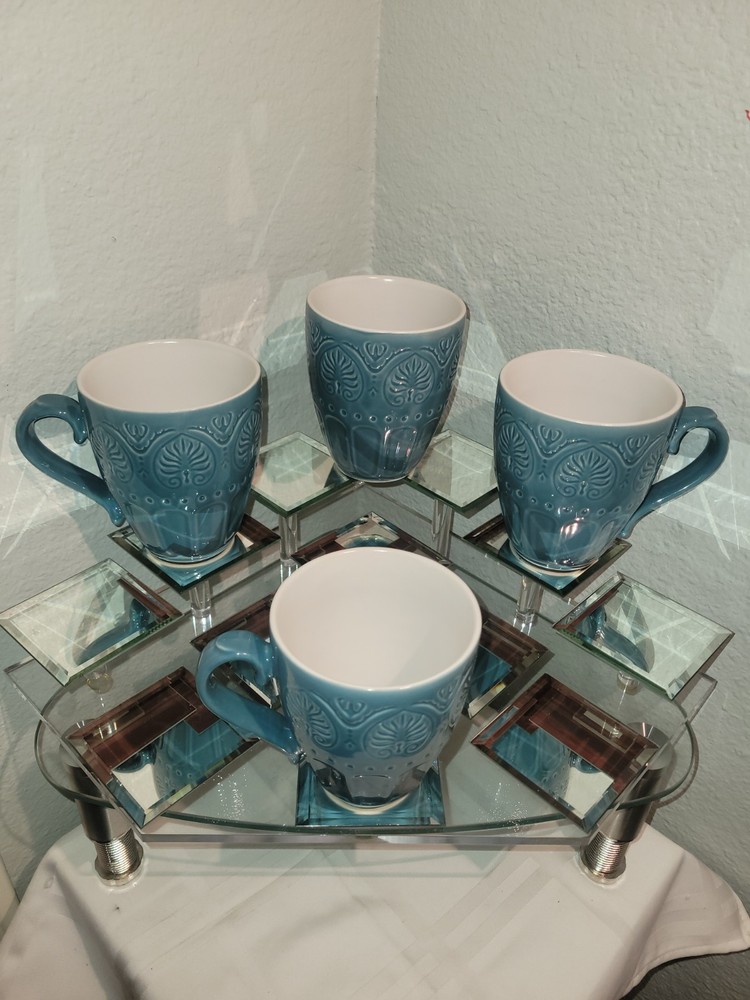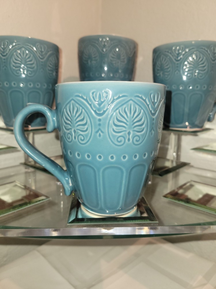 Pfaltzgraff Carmela Turquoise "Dolce Aqua" Embossed Mugs – Set of 4 Add a touch of elegance to your drinkware collection with this set of four Pfaltzgraff Carmela mugs in the striking Dolce Aqua turquoise finish. Each mug features an intricate embossed design of leaves and scrolls, combining classic charm with contemporary color. Measuring approximately 4¼ inches tall with a 3¾-inch diameter, these stoneware mugs are perfect for enjoying your favorite hot beverages in style. Durable and beautifully crafted, they make an excellent addition to both everyday use and special occasions.