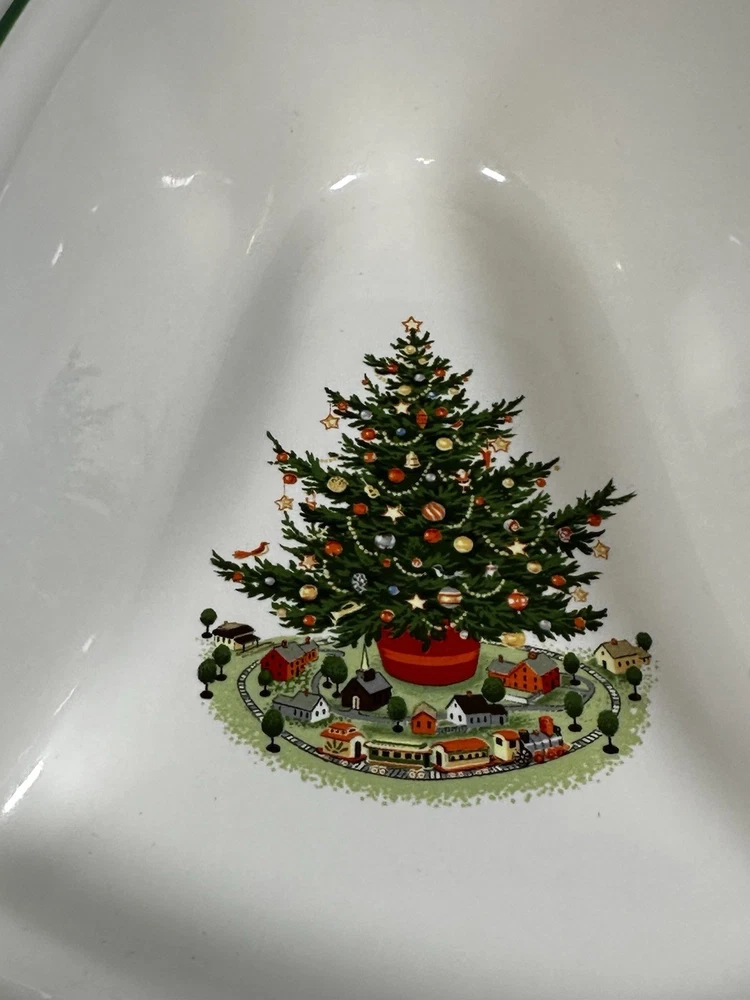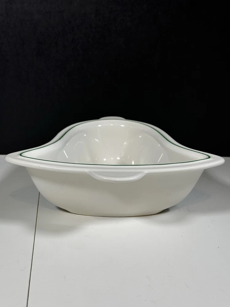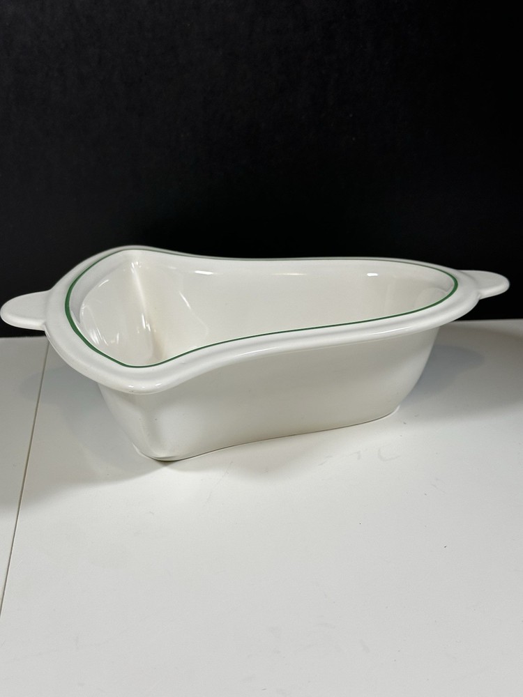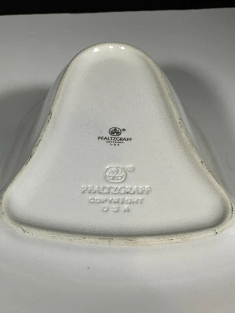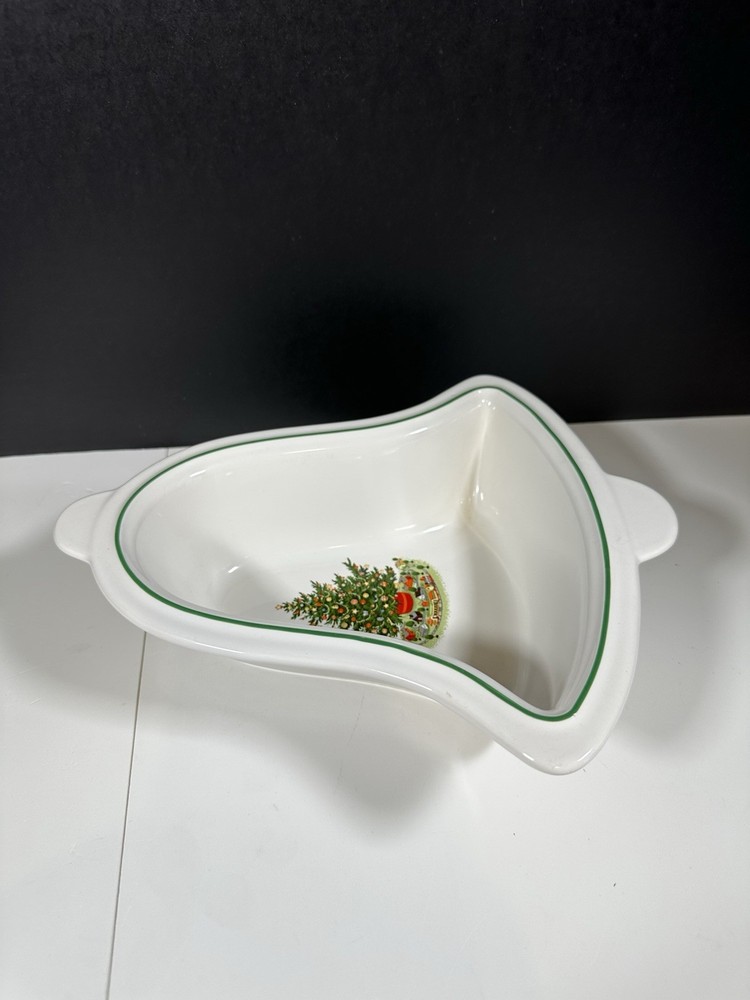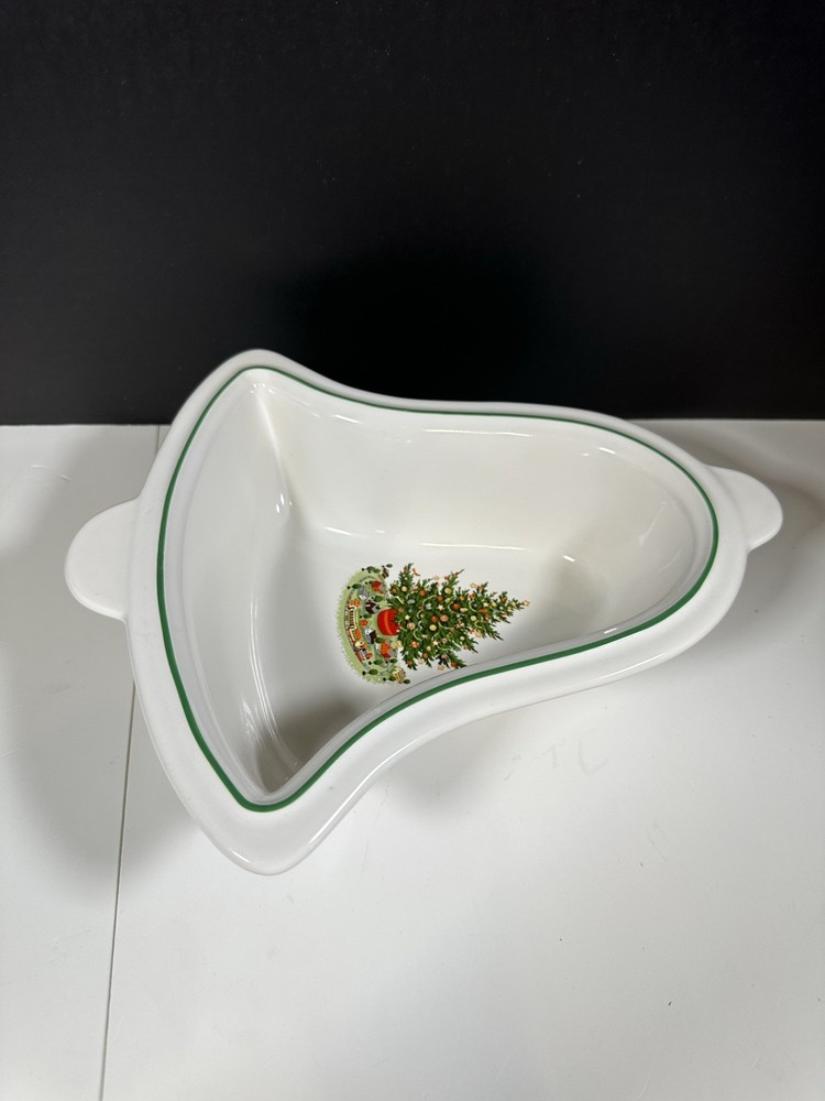 For sale pre-owned and vintage bell-shaped bowl made by Pfaltzgraff in the USA from 1981-2006 for the Christmas Heritage product line. This stoneware bell shaped bowl has a glossy cream-colored background featuring a decorated Christmas tree on the bowl face. The bowl is trimmed with a green line around the border of the bell shape. This is a discontinued pattern. Should be hand washed. Details: 11 inches long 9 3/4 inches wide at the widest area 2 3/4 inches high 2 pounds 1 ounce weight Hand wash only