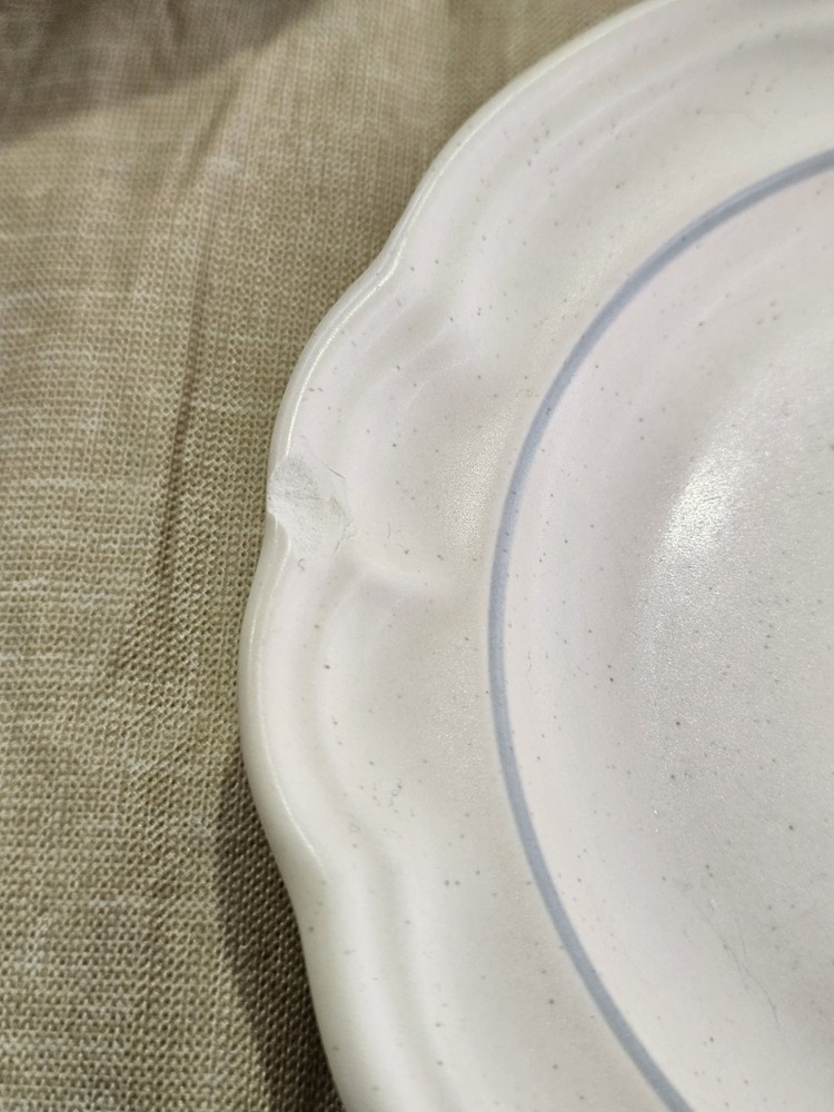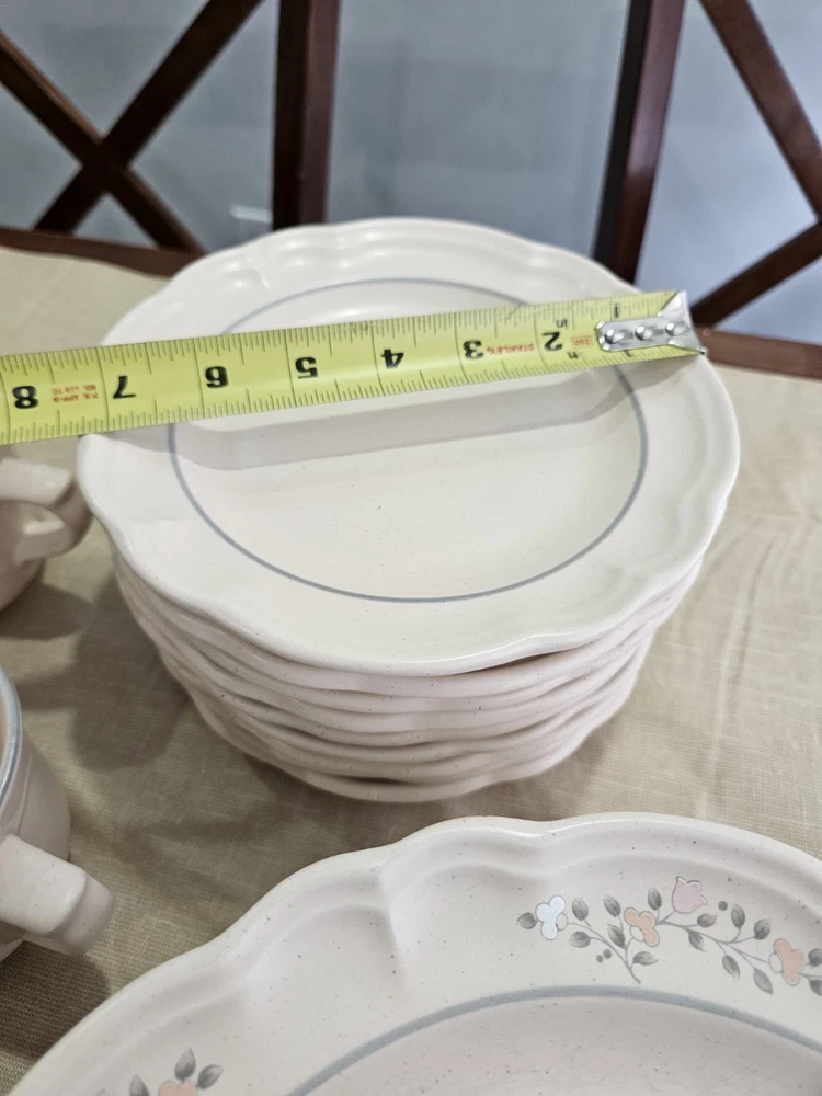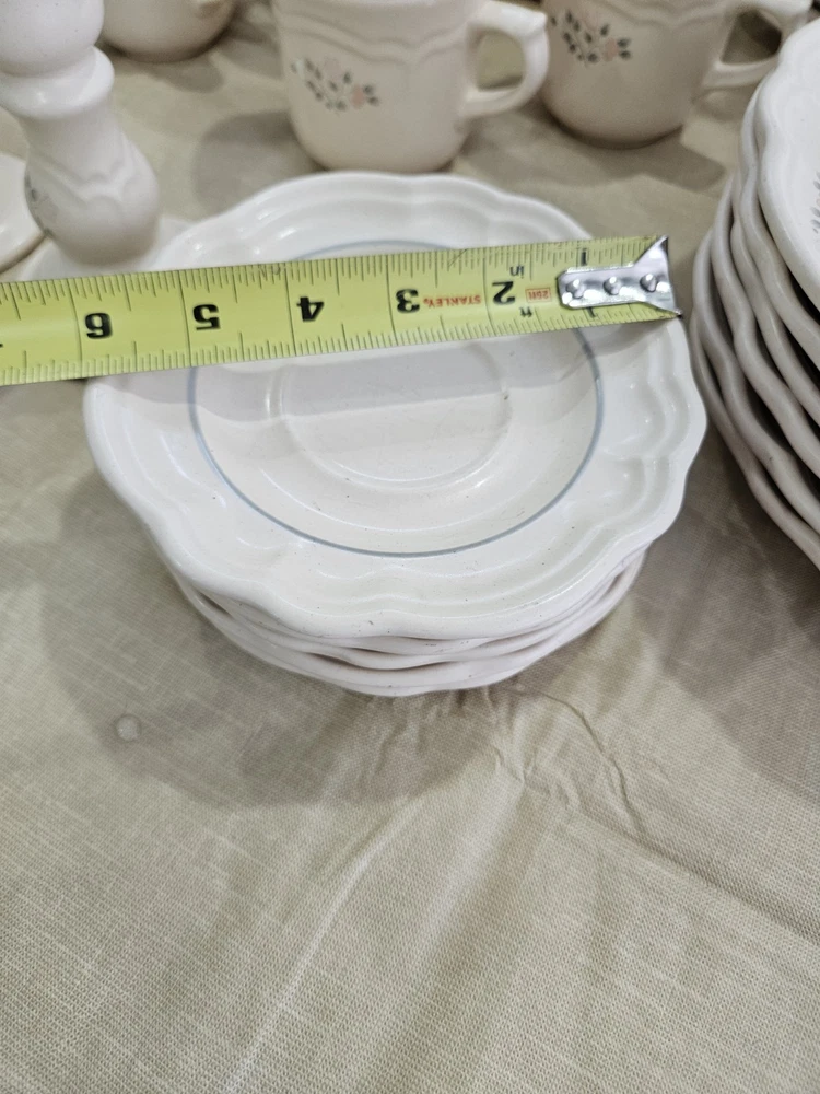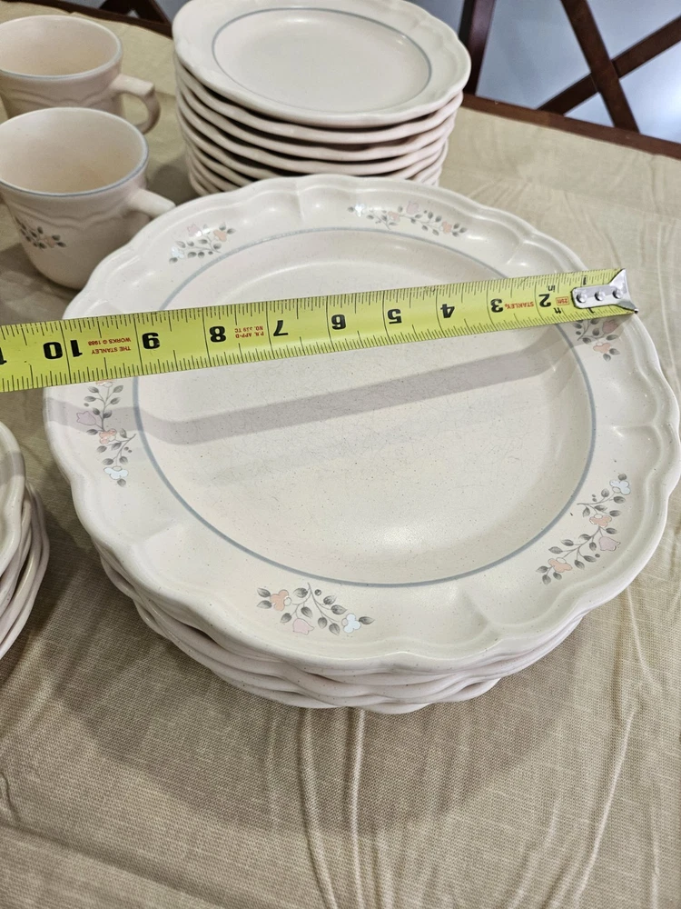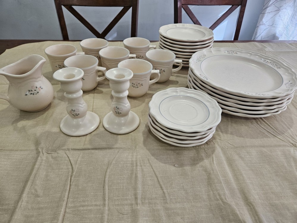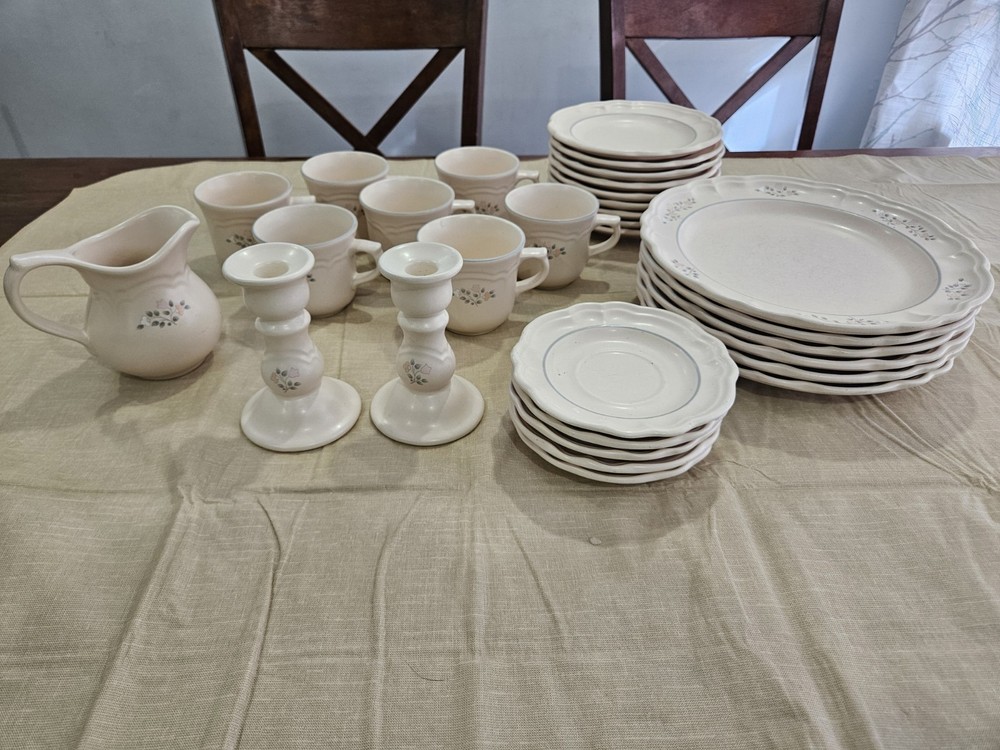 This is a 30-piece dinner set from Pfaltzgraff in the Remembrance vintage pattern. The set includes mugs, plates, bowls. The pattern features a classic design with gold accents and a matte finish. The set is perfect for those who love the charm and quality of vintage dinnerware. One of the 7" plates has a chip on the edge see picture!
