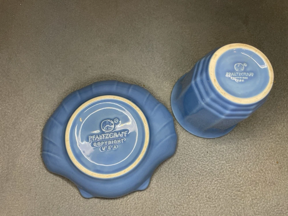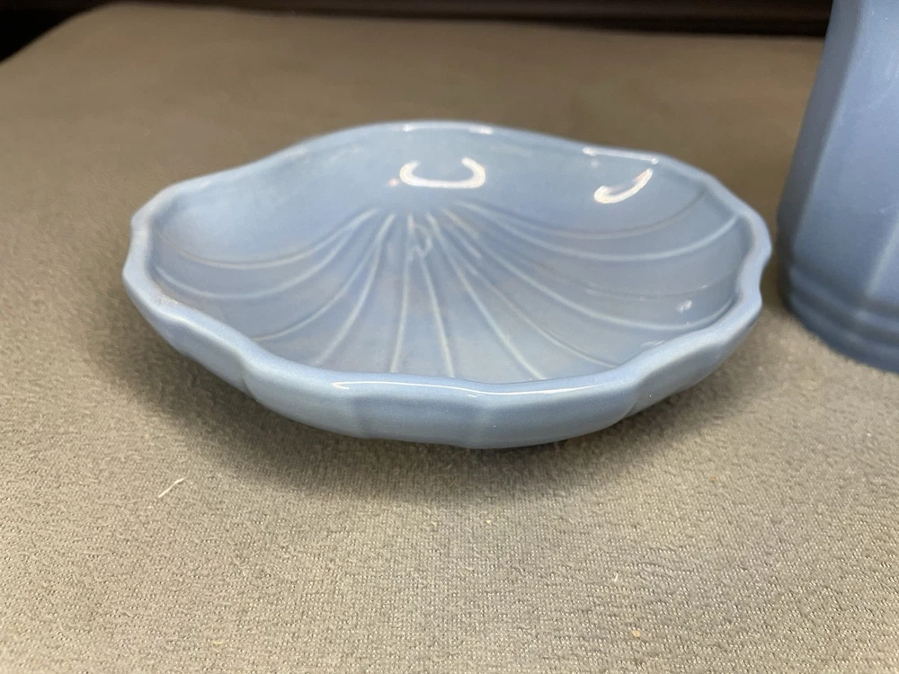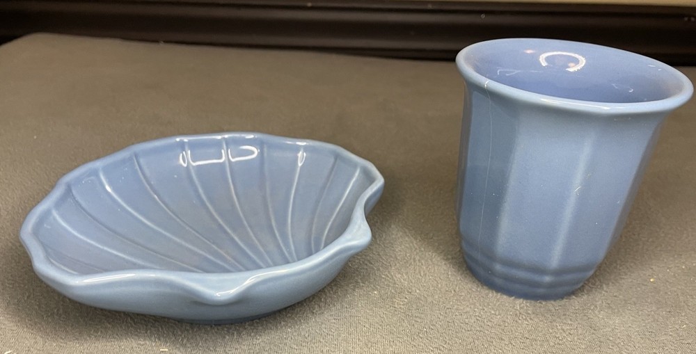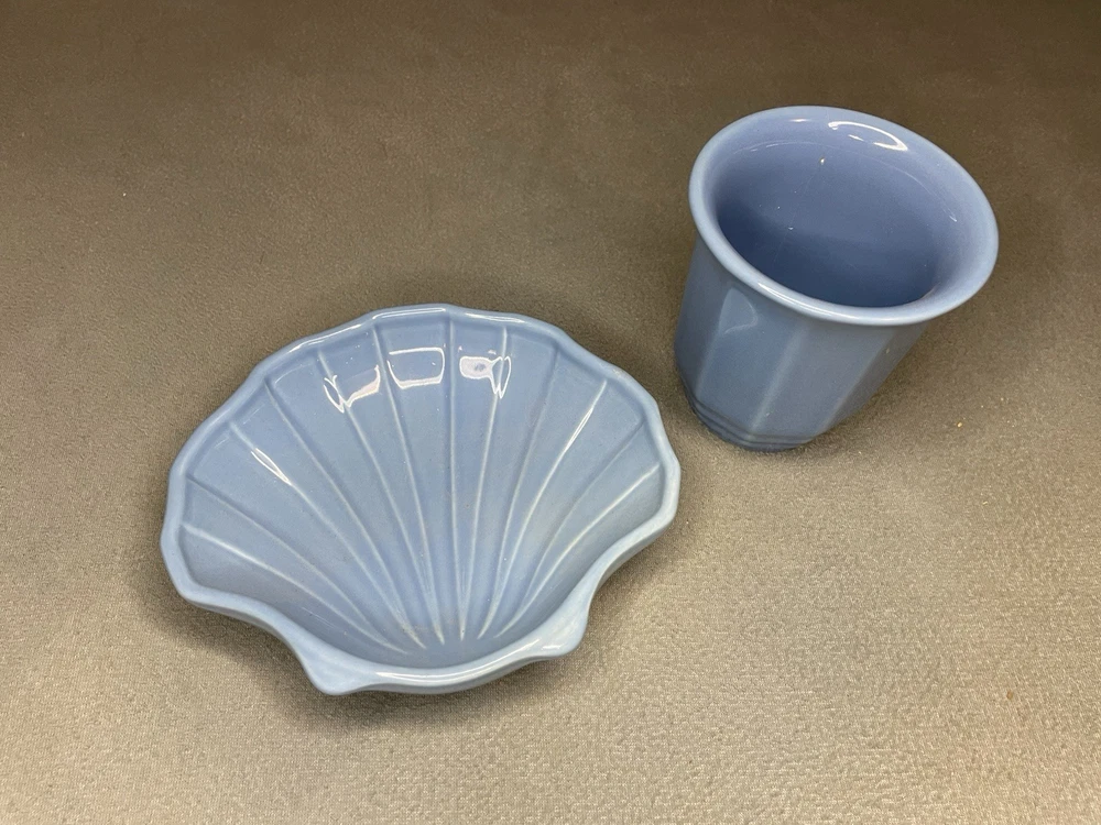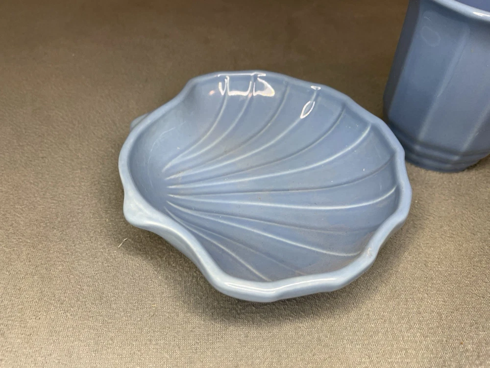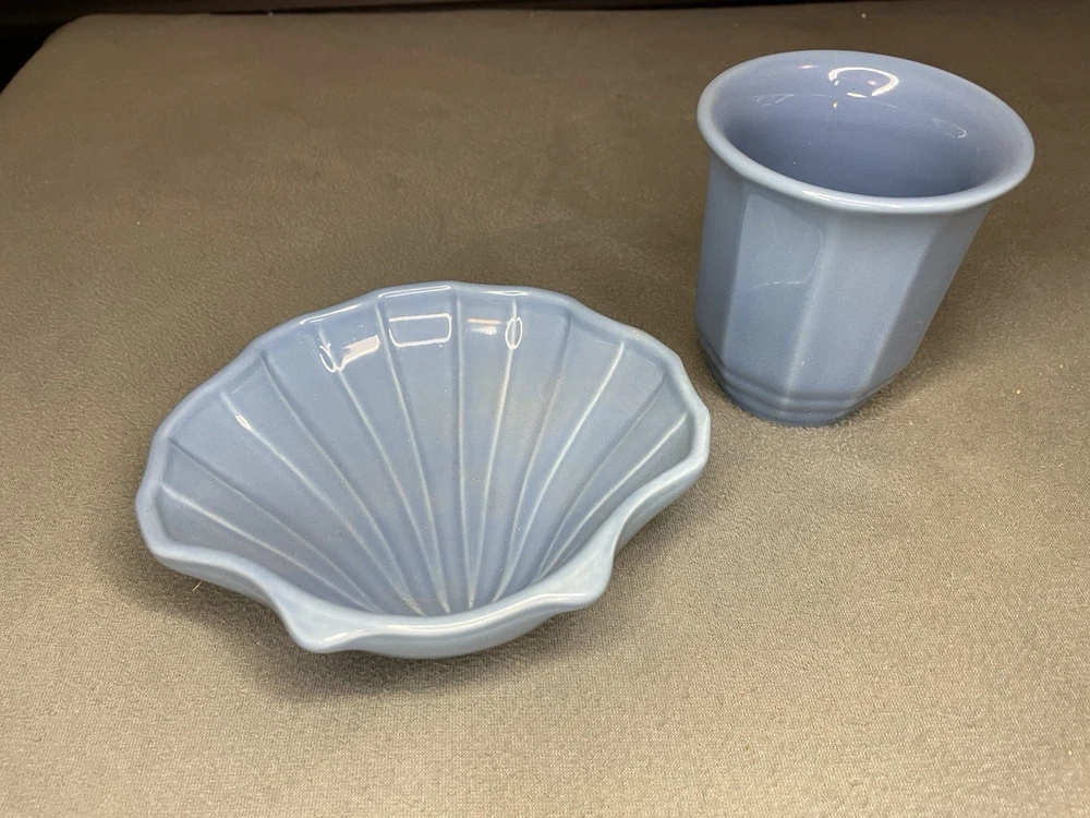 The Pfaltzgraff Stoneware Sky Blue Shell Soap Dish and Tumbler bathroom set of 2 is a charming vintage/retro accessory set perfect for adults. Made of ceramic in a solid sky blue color, this set includes a round shell-shaped soap dish and a tumbler. The set is original and was manufactured in the United States, making it a unique and stylish addition to any bathroom decor. Please inspect photos carefully