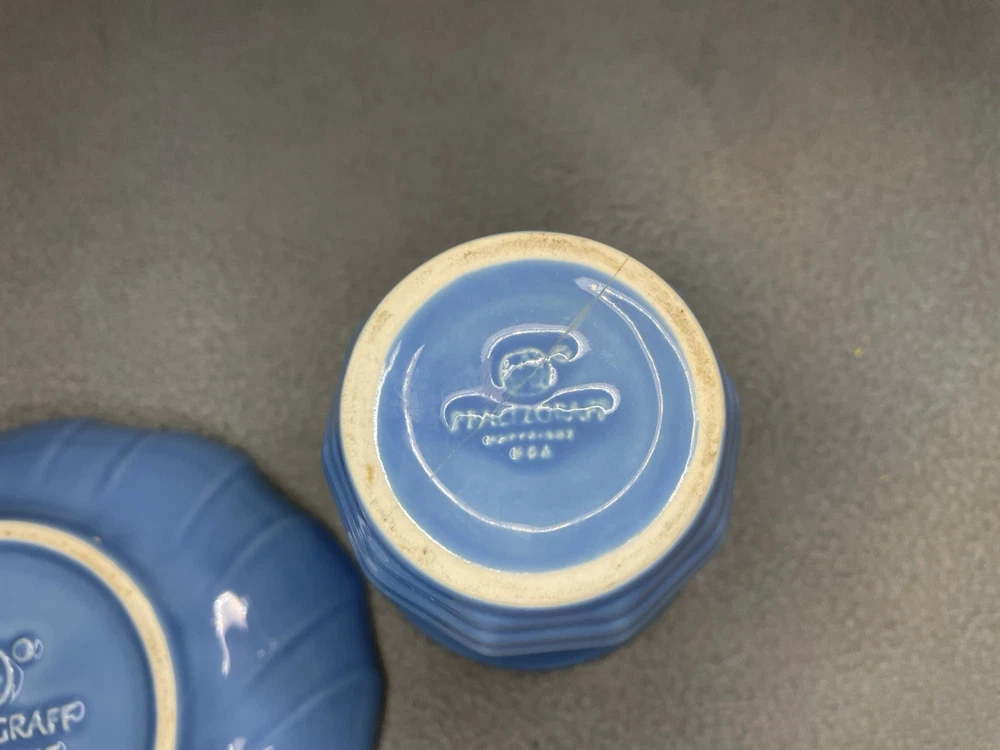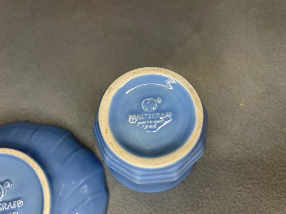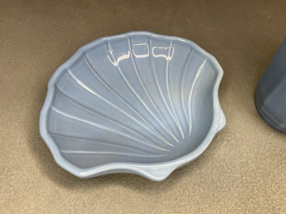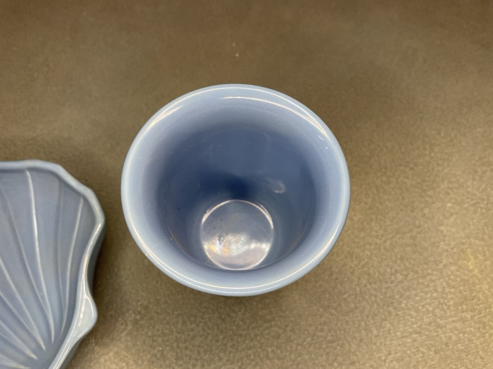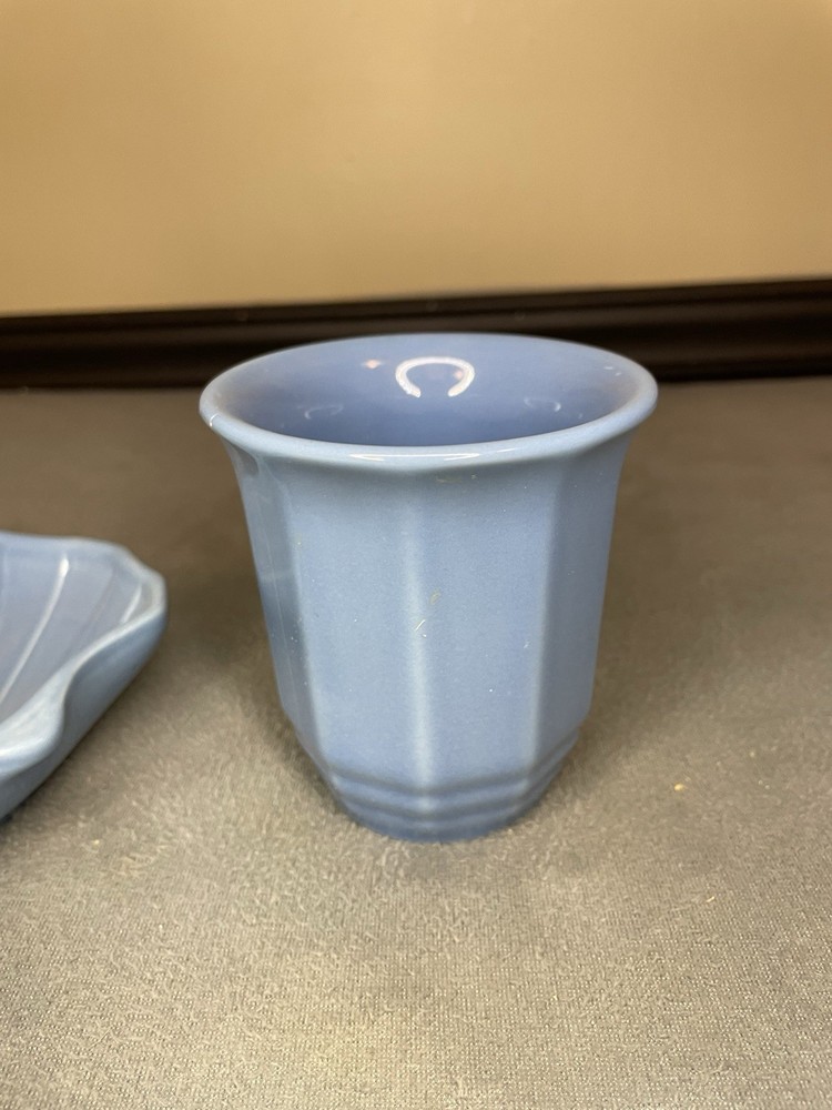 The Pfaltzgraff Stoneware Sky Blue Shell Soap Dish and Tumbler bathroom set of 2 is a charming vintage/retro accessory set perfect for adults. Made of ceramic in a solid sky blue color, this set includes a round shell-shaped soap dish and a tumbler. The set is original and was manufactured in the United States, making it a unique and stylish addition to any bathroom decor. Please inspect photos carefully