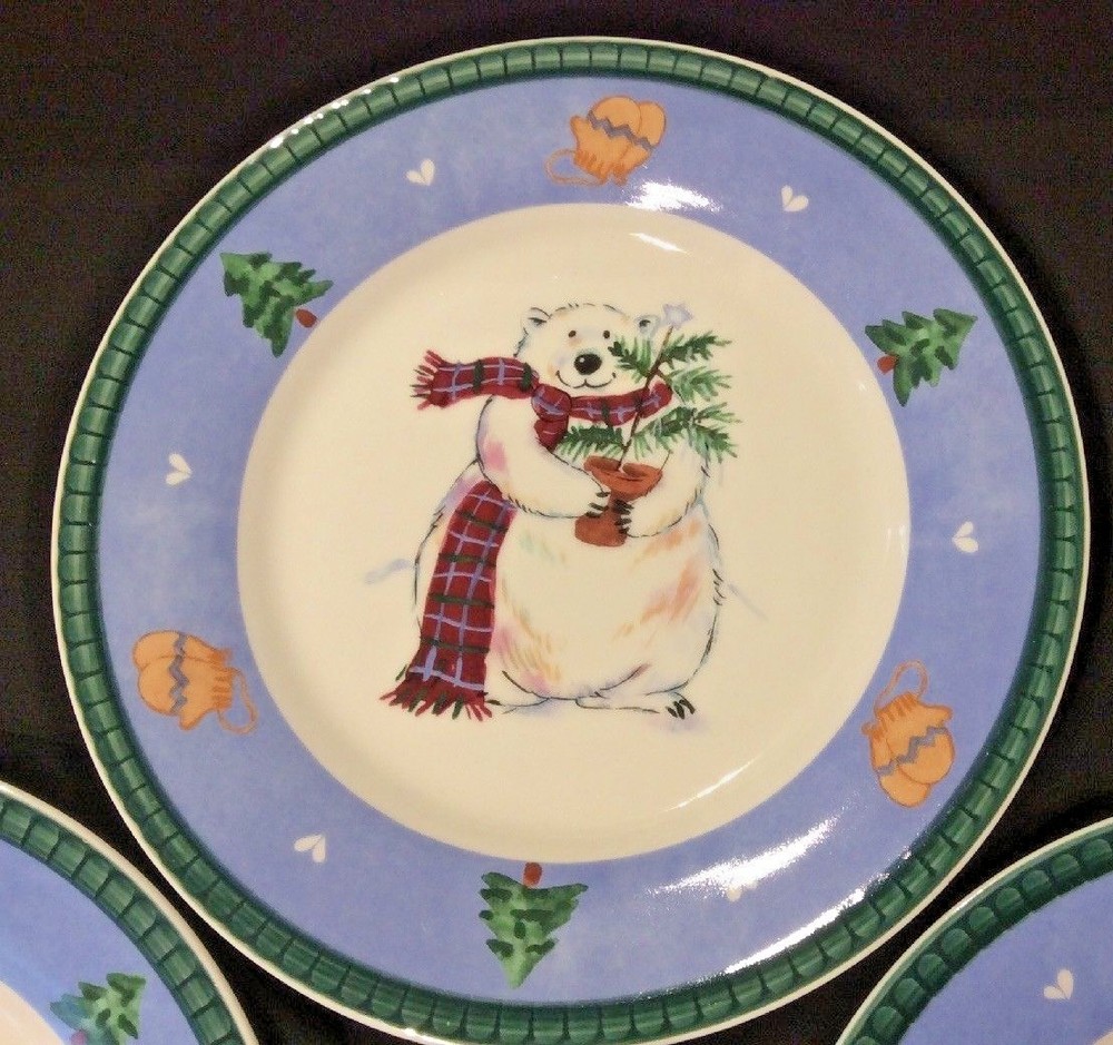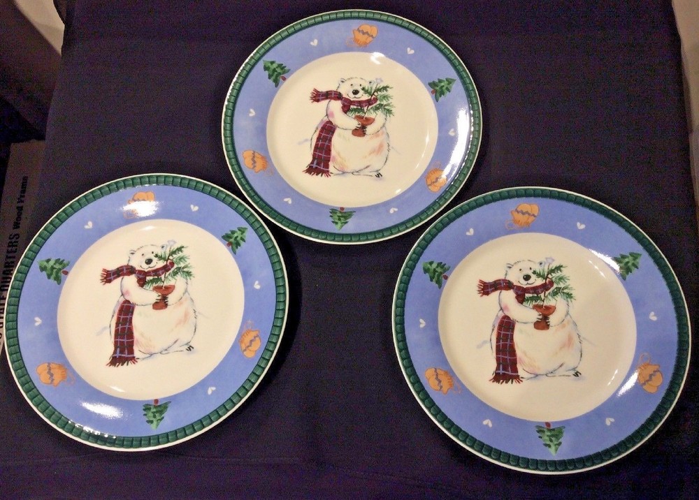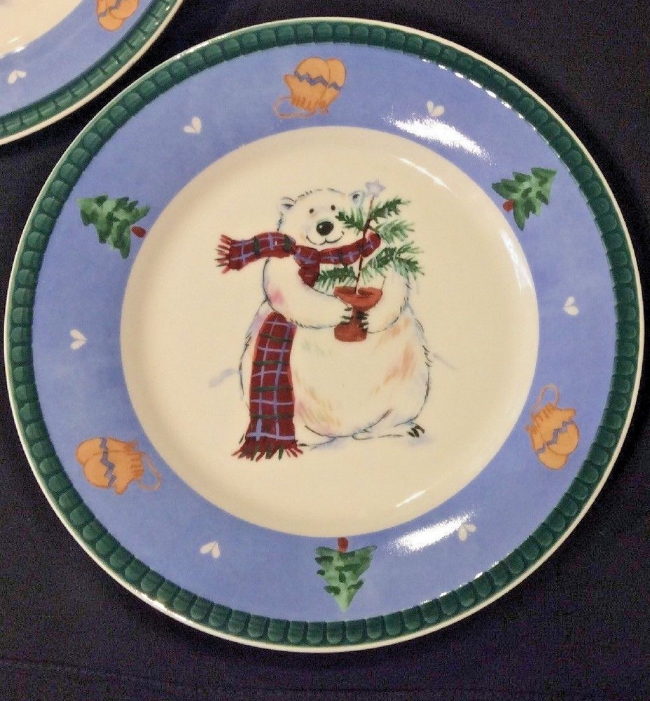 Pretty Pfalzgraff lot of 3 Accent Snow Bear salad plates. Can be used for salad, dessert, lunch or snacks. Design features a white bear in center with a scarf and holding a small tree. Blue band with Christmas/winter symbols of mittens/trees and green rim. Measure about 8-3/8" in diameter. For replacement, adding to your Pfaltzgraff Snow Bear set - and lovely plates for serving and displaying this holiday season! We mostly use new boxes but sometimes ship in clean recycled boxes.