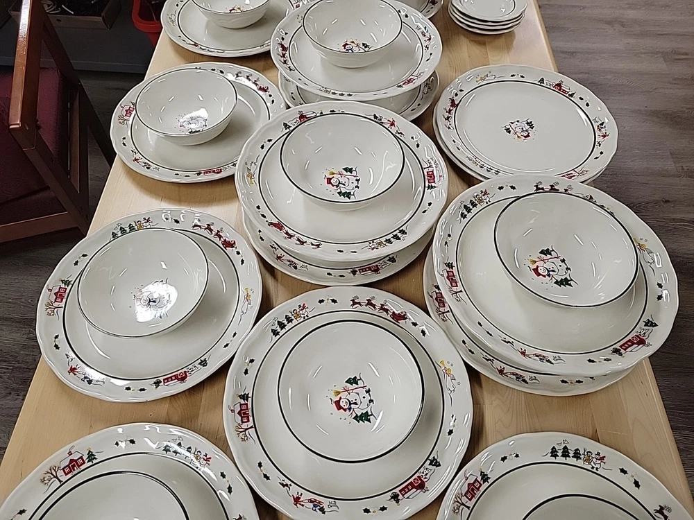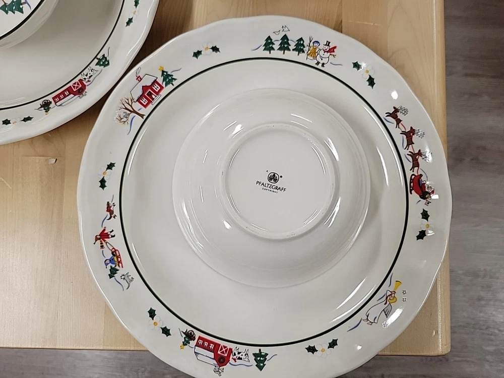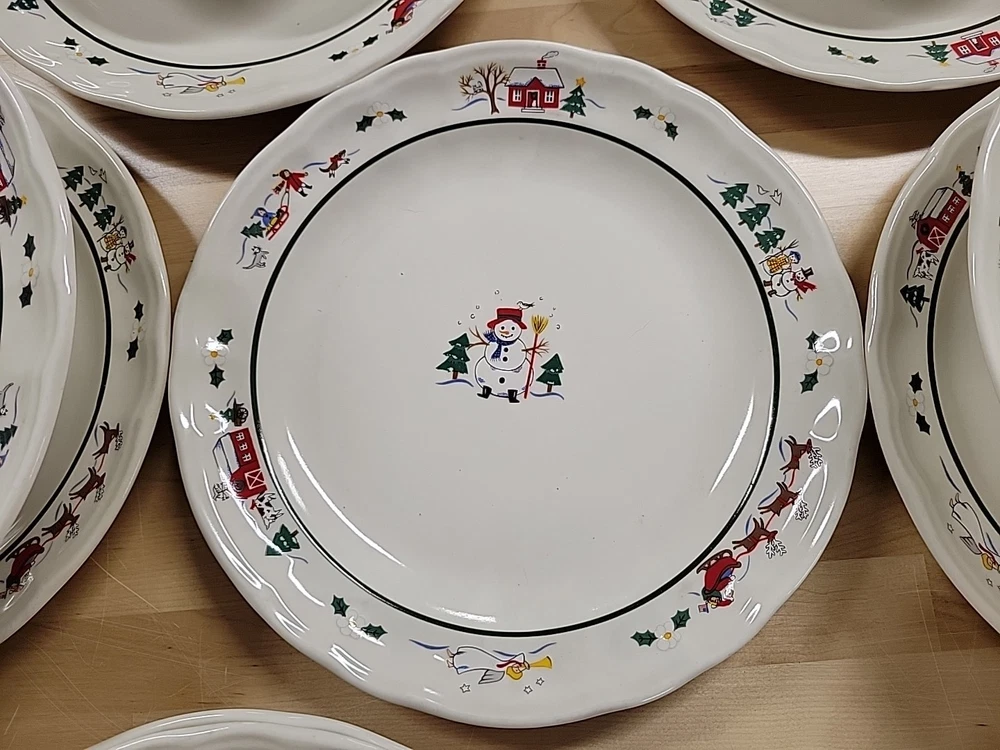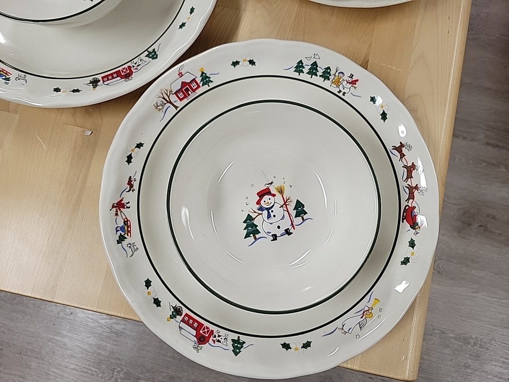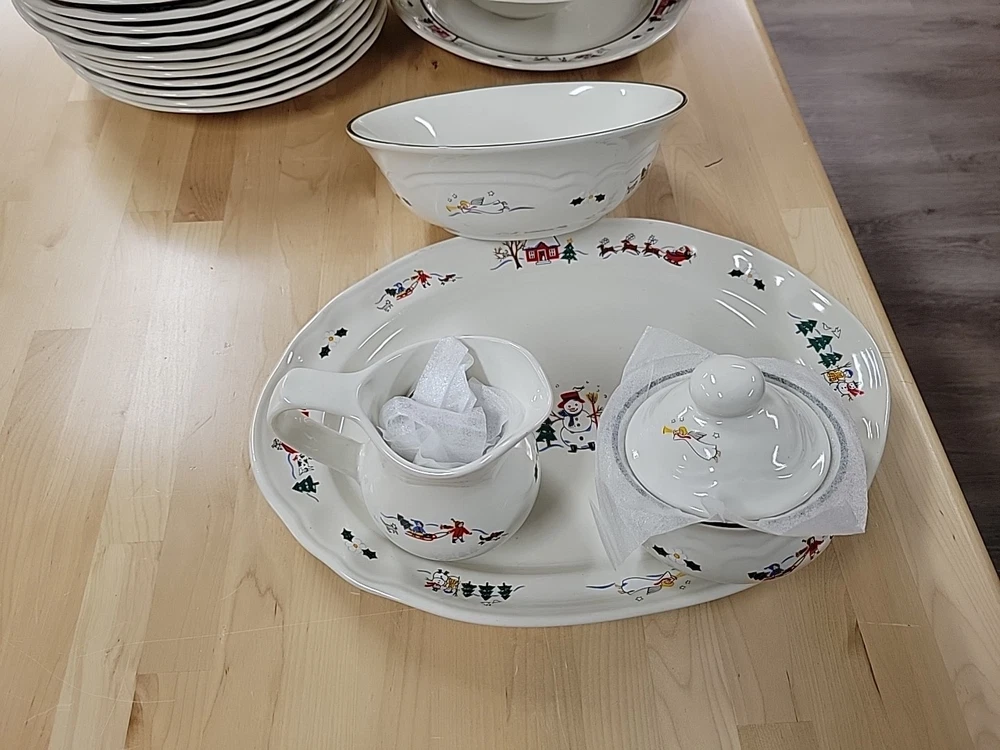 Celebrate the holiday season with the charming Pfaltzgraff Snow Village China . This 62-piece collection features a beautifully detailed Snow Village pattern that captures the festive spirit of winter. Each piece is crafted from high-quality ceramic with a glossy finish, showcasing the artistry of the renowned Pfaltzgraff brand. The set includes This Pfaltzgraff "Snow Village" China set contains 62 pieces (quantity of each where applicable): teacup (12) saucer (16) 15" x 11" serving tray creamer sugar bowl with lid 9" serving bowl 11" dinner plate (16) 6" soup bowl (12) perfect for hosting a Christmas feast. With its multicolor design, the set brings a touch of elegance and tradition to any holiday table. Enjoy creating new memories with this original, decorative dinnerware set that is sure to become a holiday heirloom. See pictures and details. Our merchandise has been generously donated by the friends and families of Community Mainstreaming Associates (CMA). All proceeds from the sale of this item benefit CMA, a 501c3 charity supporting adults with intellectual and developmental disabilities. Thank you for your support.