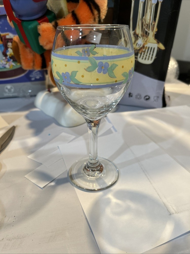 This Pfaltzgraff Summer Breeze wine goblet features a colorful design on glass, standing 7 3/4 inches tall and 2 3/4 inches wide. With a 10 oz capacity, this goblet is suitable for all occasions, adorned with a decorative pattern making it a stylish choice for drinkware and barware collections. Set of eight (8) Goblets