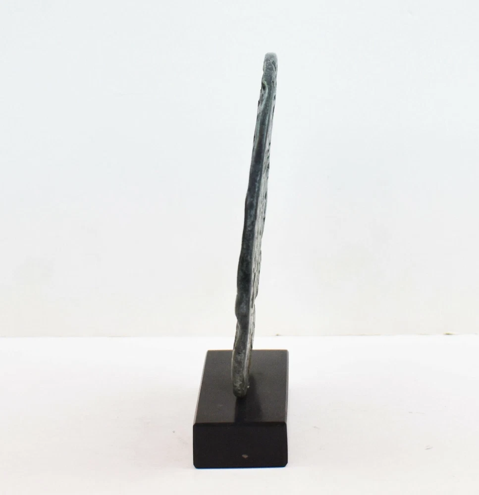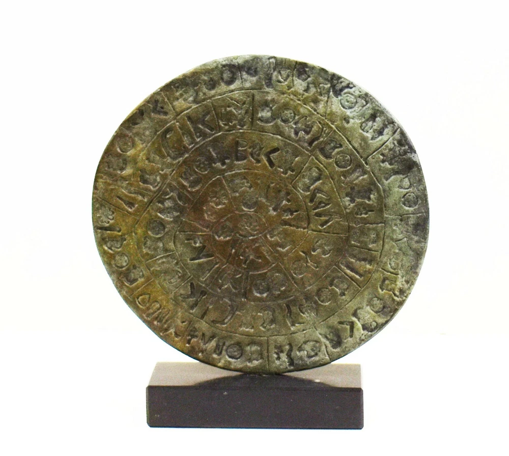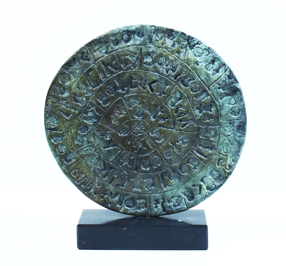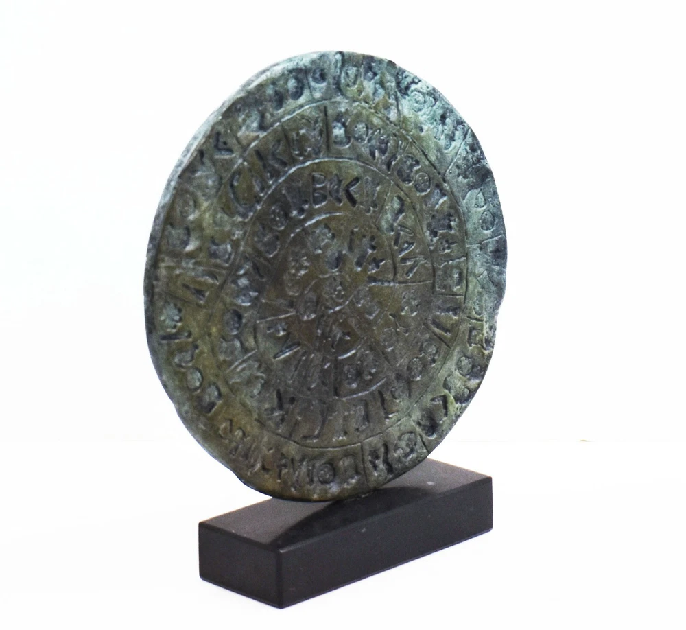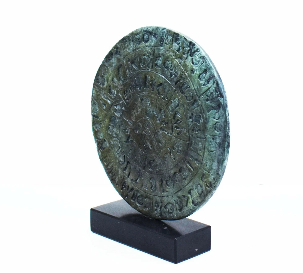 PHAISTOS DISC BRONZE STATUE The original Phaistos Disc is a disk of fired clay from the Minoan palace of Phaistos on the Greek island of Crete, possibly dating to the middle or late Minoan Bronze Age (2nd millennium BC). It is about 15 cm (5.9 in) in diameter and covered on both sides with a spiral of stamped symbols. Its purpose and meaning, and even its original geographical place of manufacture, remain disputed, making it one of the most famous mysteries of archaeology. This unique object is now on display at the archaeological museum of Heraklion. The Minoan Civilization thrived in the Bronze age (in roughly 3,000 BC) within the Aegean. The center of this civilization was Crete while the Palace of Knossos is today a visitable excavation area with remarkable original restored exhibits from the ancient Palace. All our bronze items, are cast in Greece, using the traditional 'lost wax' method. As nothing is mass-produced, there will inevitably be slight variations in patination and colouring. Each piece is, therefore, unique.(112100160001-A) Details: Condition: New, Handmade in Greece Material: Pure Bronze Height: 16 cm(6.3 inches) Width : 16 cm(6.3 inches) Weight : 900 g