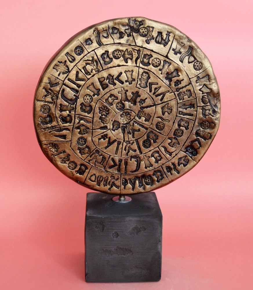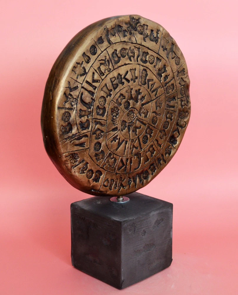 PHAISTOS DISC SCULPTURE The original Phaistos Disc is a disk of fired clay from the Minoan palace of Phaistos on the Greek island of Crete, possibly dating to the middle or late Minoan Bronze Age (2nd millennium BC). It is about 15 cm (5.9 in) in diameter and covered on both sides with a spiral of stamped symbols. Its purpose and meaning, and even its original geographical place of manufacture, remain disputed, making it one of the most famous mysteries of archaeology. This unique object is now on display at the archaeological museum of Heraklion. The Minoan Civilization thrived in the Bronze age (in roughly 3,000 BC) within the Aegean. The center of this civilization was Crete while the Palace of Knossos is today a visitable excavation area with remarkable original restored exhibits from the ancient Palace. Please be aware that, due to the fact that our products are either individually cast, carved, hand painted and hand finished, there will inevitably be minor variations in size, colour and texture.(B202-P) Details: Condition: New, Handmade in Greece Material: Casting stone Height: 24 cm(9.5 inches) Width : 16 cm(6.3 inches) Weight : 1 kg