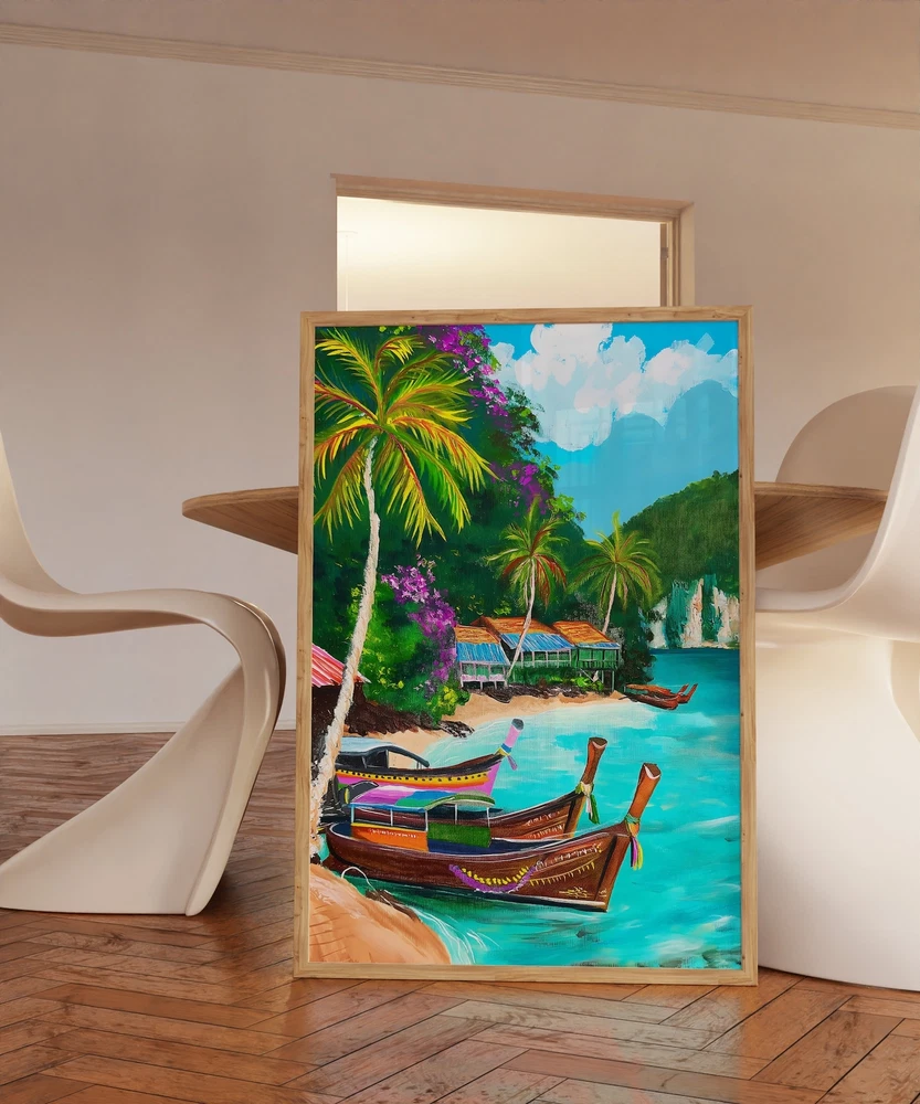 Phi Phi Illustration Thailand Summer Painting Colorful Travel Illustration Material: Premium luster photo paper Print type: Inkjet printing One side printed + The finish provides the highest possible resolution and color saturation + Lasts up to 200 years in color and 400 years in black-and-white + Printed on high-quality resin-coated photo base paper medium + Posters can be hung with double-sided tape, tacks, or framed + Hand washing with a gentle cry cloth is recommended for extended durability I will hand select the best choice of paper for your chosen design to ensure top quality results for a beautiful, bright and luxurious print. All prints are sealed in cellophane slips for protection during transportation, and are shipped in a protective cardboard envelope.