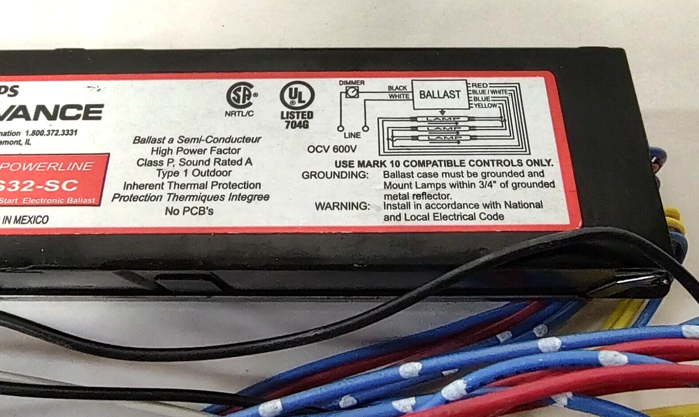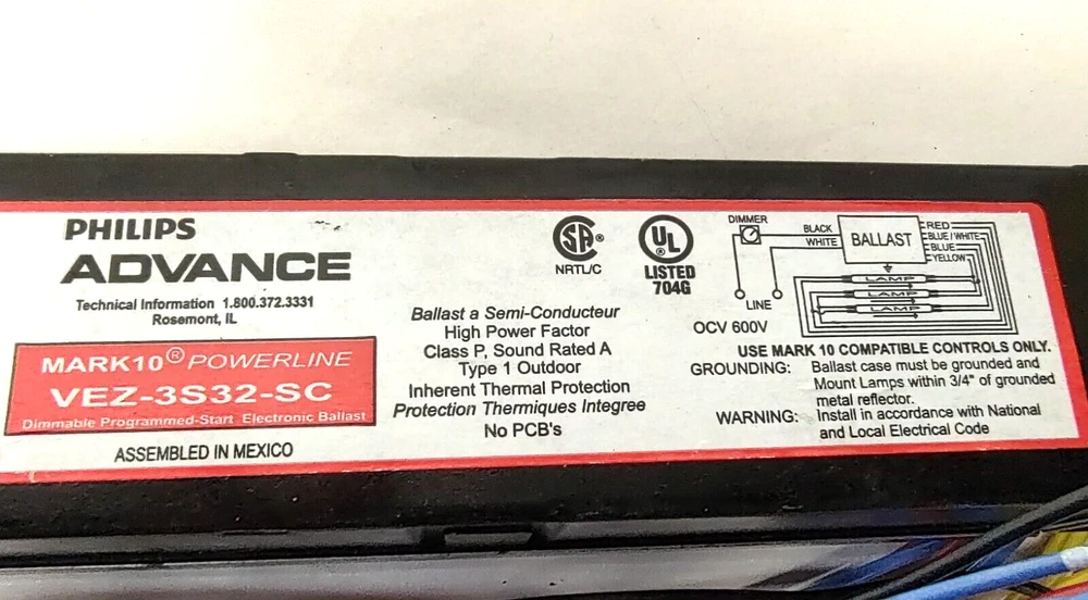 Philips Advance VEZ-3S32-SC 277V Mark10 Powerline T8 Electronic Dimming Ballast This Philips Advance VEZ-3S32-SC 277V Mark10 Powerline T8 Electronic Dimming Ballast is a top-quality lighting ballast suitable for use in various settings. With its electronic dimming feature, it provides efficient and effective lighting control, making it an ideal choice for use in facilities such as offices, warehouses, and factories. This ballast is manufactured in Mexico and has a model number of VEZ-3S32-SC. It is also known as VEZ3S32SC and is designed to work with 277V AC voltage. It is a reliable and durable lighting ballast that provides long-lasting performance. Get this lighting ballast today and enjoy efficient lighting control in your facility. New old stock without original package. Store inventory #1461