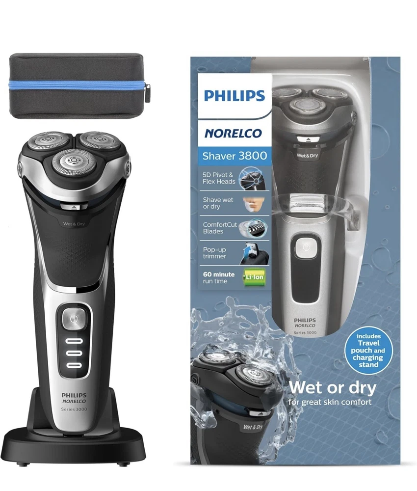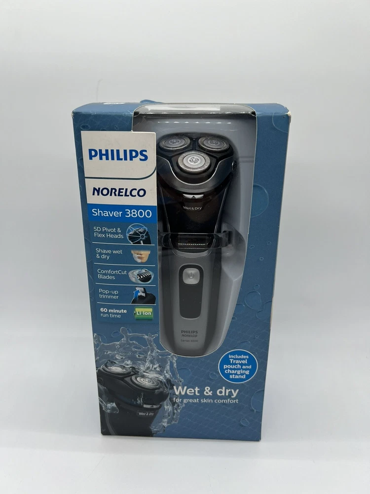 Philips Norelco Shaver 3800 Wet & Dry S3311/85 Used, tested it works. Item: Q2(19) Enjoy a clean shave that follows your face's contours with 5-directional pivot, flex and floating movements. The head reaches your face at the ideal angle and adjusts to the curves of your face and neck, creating smooth contact with your skin. Get a convenient dry shave or a refreshing wet shave with gel or foam, even in the shower. With ComfortCut blades, you get a clean shave that's comfortable on your skin. Rounded caps shield 27 self-sharpening blades to gently cut hair just above skin level and help the shaver glide smoothly over your skin. Finish your look with the built-in pop-up trimmer. It’s ideal for maintaining your mustache and trimming your sideburns. Shave for up to 60 minutes on a 1-hour charge - that's about 20 shaves - with the powerful Li-ion battery. A 5-minute quick charge gives enough power for one shave. Operates in cordless mode only.