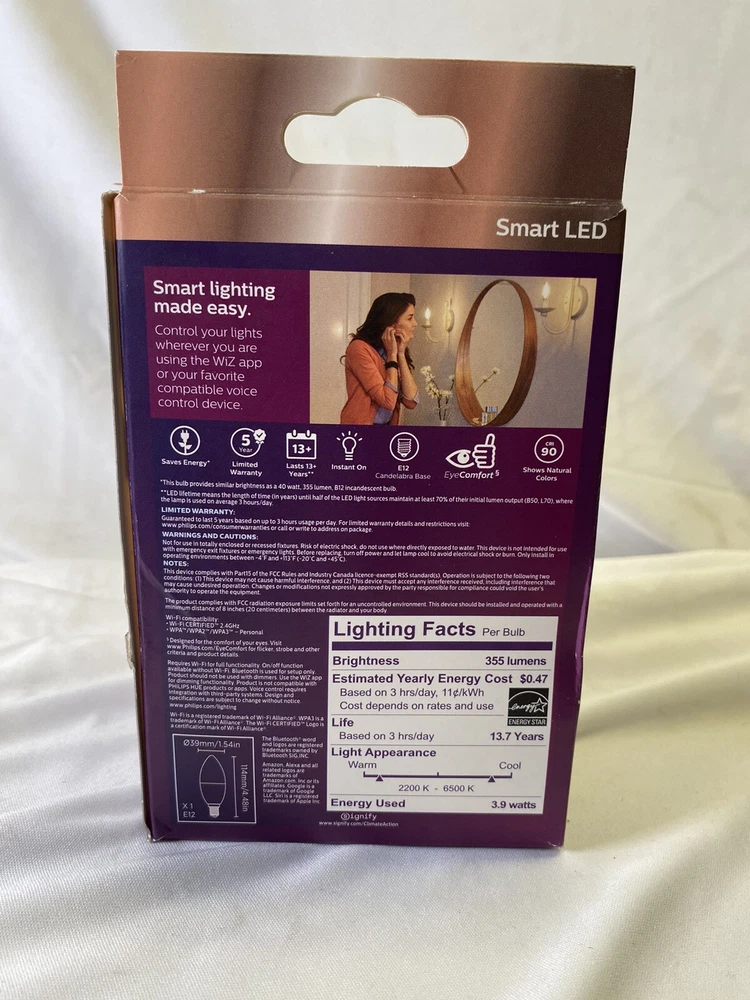 Philips Smart Wi-Fi LED 40-Watt B12 Candle Light Bulb, Frosted Dimmable Color
