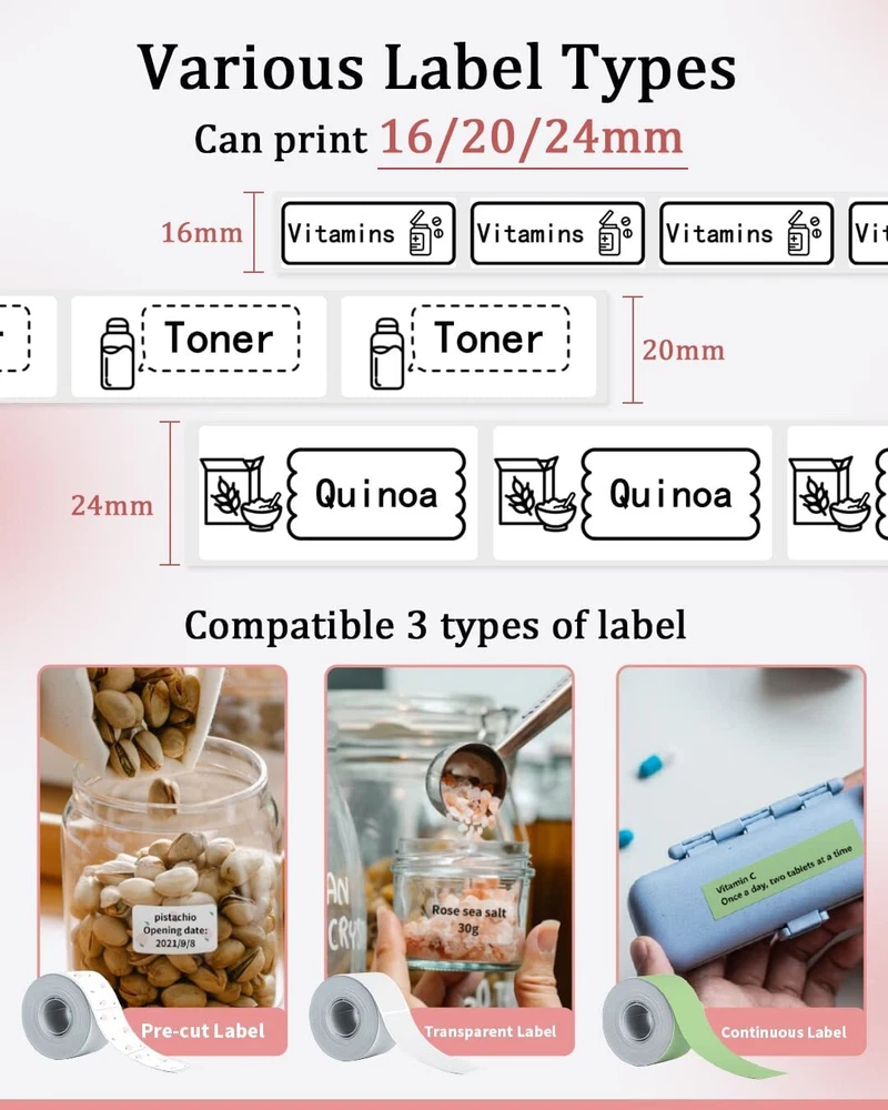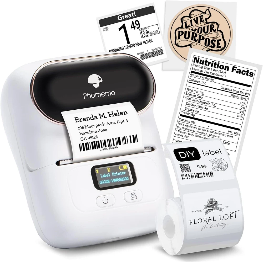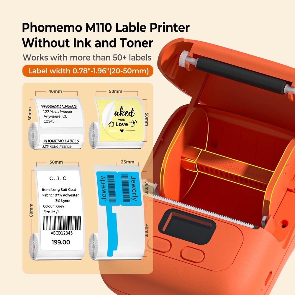 Specifications Brand : Phomemo Color : Pink,White,Black,Orange Material : ABS + Metal Print Type: Ink free printing Size: Approx. 178 * 148 * 72 mm Printing Speed: 20-60mm Package Weight: 516 g Battery: Lithium Battery (built-in) Interface: 5V, micro USB Resolution: 203dpi Support System: for iOS + Android Package List Phomemo-M110 Label Printer * 1 USB Cable *1 User Manual * 2 Packing Box *1 Sample Sticker *1 Phomemo Card *1 Note: 1. You can download a Free APP from Google by searching"Print Master" for your PC or Mobile. 2. Free iOS APP, just search the "Print Master" on the APP Store. Feature Easy Use Label Maker Printer - Mini Bluetooth wireless protable thermal mobile label printer, connect your mobile phone easily. There are a lot of templates in APP, you can easily print any label you need, clothing labels, price labels, cable labels, jewelry labels, address labels, folder labels and so on. Phomemo-M110 Label width range of is 20mm~50mm, the largest printable width is 48mm. Not for shipping labels. Powerful APP - Phomemo-M110 Bluetooth label maker machine with all free label templates and can set up your own templates. You can edit and typeset labels, supporting Excel batch printing to improve work efficiency. Ink-less, Smooth & Fast Printing - Adjustable Paper Holder & Automatic Label Identification, it is built to prevent paper jams and deviations, makes your printing more fast. It is thermal printer, no ink printing, no need to use ribbon, reduce consumable demand and save money. Only print black and white. Stable Bluetooth Connection - One-click connect and printing. Bluetooth 4.2 with up to 33 feet range, just need 2 seconds to connect. A good assistant during office, supermaket Price tag, , . Powerful Function Printer - OCR-Optical Character Recognition, recognize text on images in 4 seconds. You can enjoy converting the text in the photos directly into editable text with Phomemo-M110 label printer. Make your business run faster.