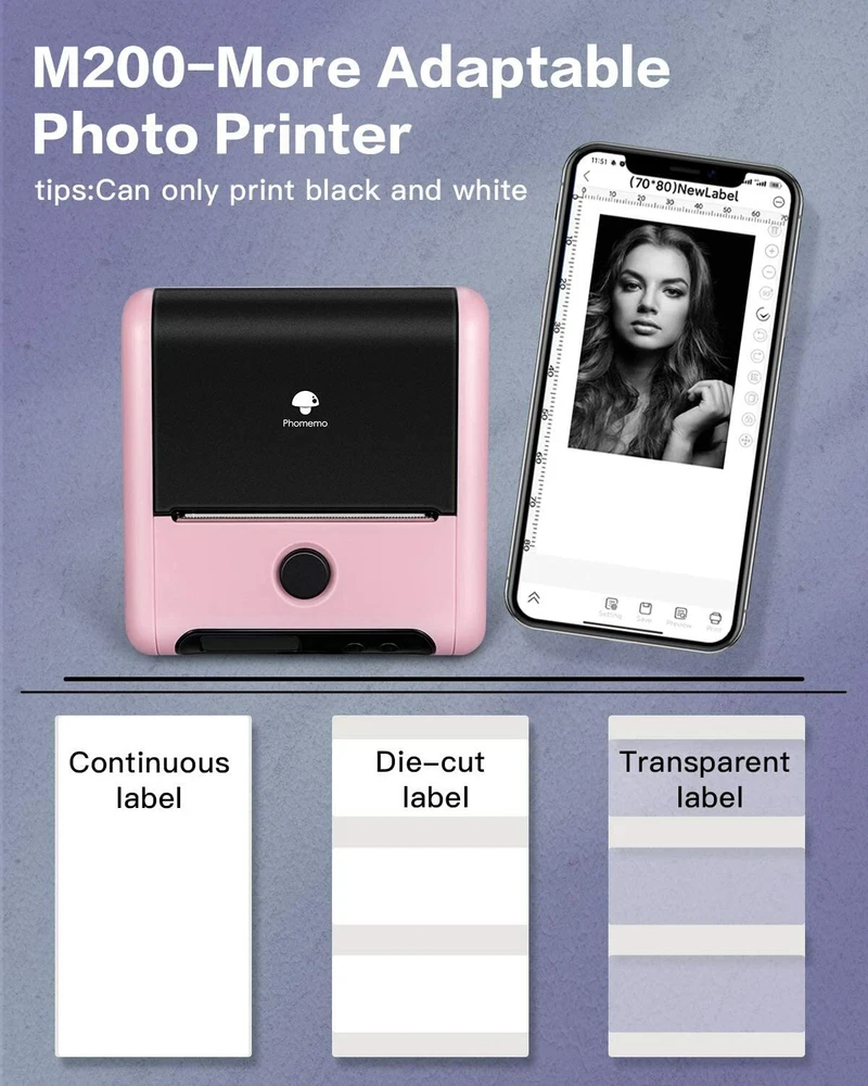 Phomemo M200 Bluetooth Thermal Label Printer Updated M200 label maker adopts a minimalist design, with subtle changes in a cube, and the screen is tilted upward to a slight angle to better support users. With the great compatibility, M200 label printer is able to print 20-80 mm wider label, which offers you more choices in choosing various sticker paper. Easy Bluetooth connection steps as follow: Download Print master App from App Store & Google Play > Turn on M200 printer and open Phone Bluetooth > Choose printer model in app > Go and enjoy your printing. About this item All in One Thermal Label Printer - M200 pink label printer gathers all the function you need. It supports automatic/manual power off, restore factory setting, battery indicator, continue or skip paper feed, adjustable printing density and printing speed. Powerful Phone App - You can operate by downloading " Print Master " APP on iOS or Android mobile phone. Easy connection via Bluetooth. "Print Master" APP offers lots of templates, fonts, icon and other more tools for you to print. Large Capacity Battery - Type C fast charging and 2600mAh large capacity battery meets your daily printing demands. Standby time up to 1 week after full charging. You can feel free to carry it out and print without keeping worry about out of juice. Support Various Types of Labels - Supports to print 20-80 mm wider label. M200 printer can print gap paper, black mark paper, transparent paper, die-cut paper, continuous or non continuous paper. No annoying sticky residue when the labels are removed. Wider Applications -This Bluetooth label maker is perfect to be used at home, studio, office, hotel, school, etc. It is a good helper for you to make warm prompt, memorandum, small business, storage and organization. More Functions: Adjustable Print Density Adjustable Print Speed Restore Factory Setting Auto/Manual Power Off Bluetooth Connection Backlight LCD Screen Battery Indicator Skip Paper Feed Package Includes: 1 x Phomemo M200 Pocket Thermal Printer 1 x Type-C Cable 1 x White Regular Thermal Printing Paper (in the printer) 1 x User Manual 1 x Packing Box *If you choose paper only, you will receive paper only, no printer. Type of Label: Product Name Color Size Adhesive or not Pcs/Roll Quantity (per box) 1 Roll 30*20mm White Square Label White 30mm*20mm Yes 320pcs 1 Roll/3 Rolls 1 Roll 40*30mm White Square Label White 40mm*30mm Yes 230pcs 1 Roll/3 Rolls 1 Roll 40*60mm White Square Label White 40mm*60mm Yes 130pcs 1 Roll/3 Rolls 1 Roll 50*30mm White Square Label White 50mm*50mm Yes 230pcs 1 Roll/3 Rolls 1 Roll 50*80mm White Square Label White 50mm*80mm Yes 100pcs 1 Roll/3 Rolls Item Specifics Supported Paper Size : 80mm × φ50mm Model : Phomemo M200 Printer Maximum Resolution : 203 x 203 DPI Custom Bundle : Yes Product Line : Phomemo M200 Series Input Type : Monochrome Connectivity : Bluetooth Type : Label Printer Output Type : Black & White Features : Pockert Technology : Thermal MPN : M200-TOP Printing Speed : 35mm/s Service Life : 50km Brand : Phomemo Manufacturer Warranty : 1 year Type-2 : Photo Printer Support System : Windows 7/8/10 / iOS 8.0 / Android 4.0 or above