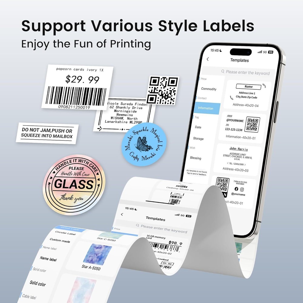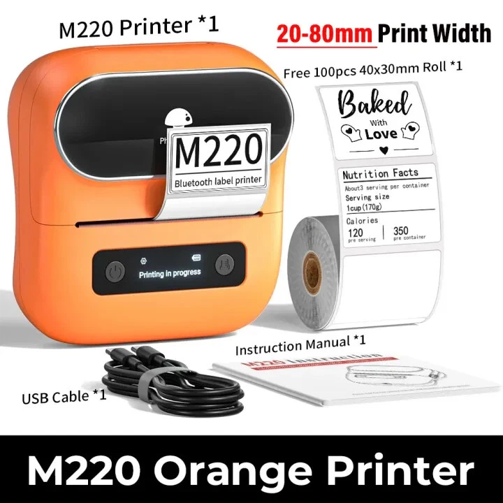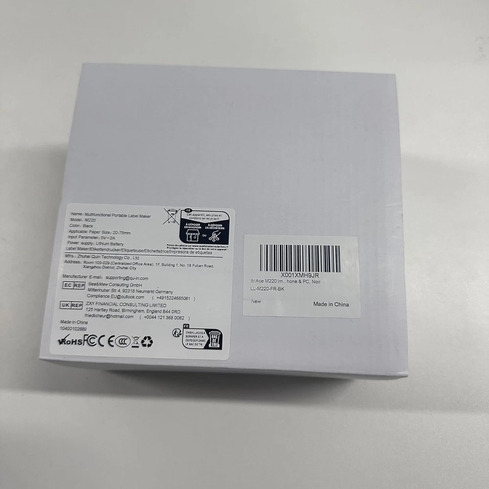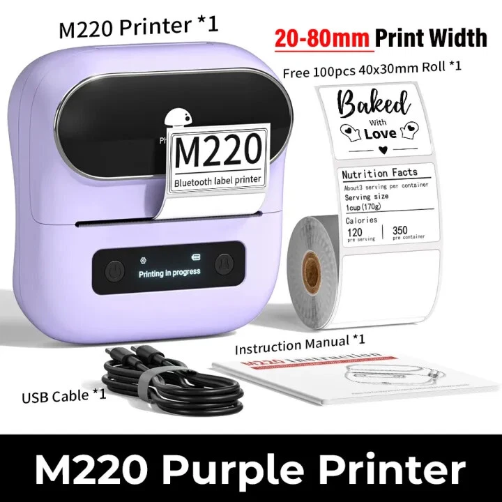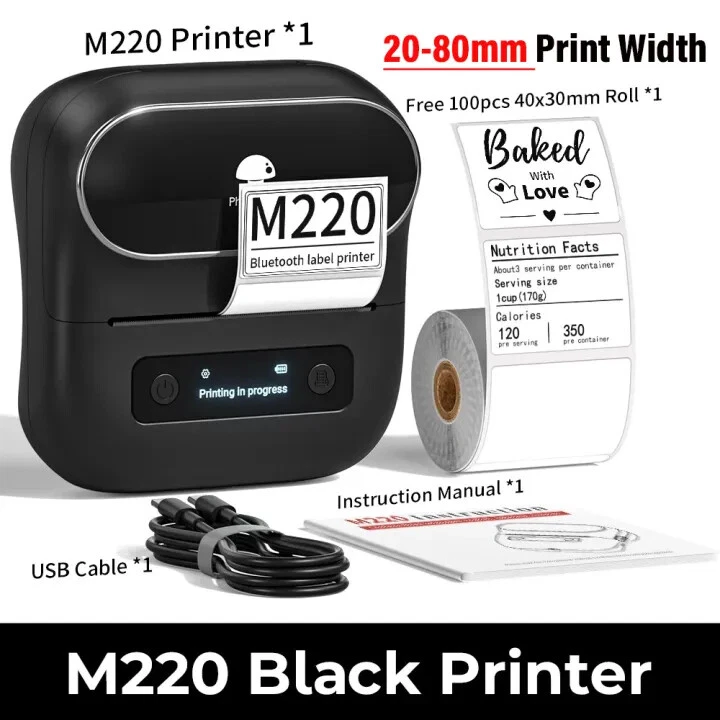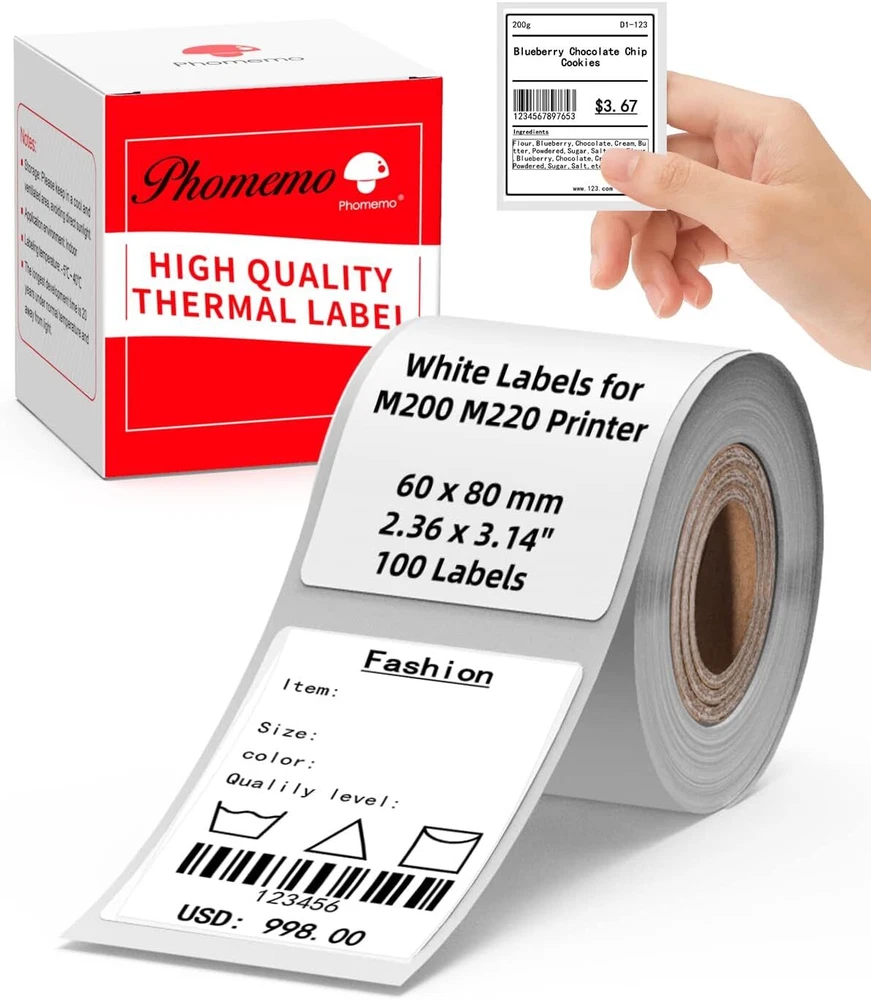 Product Description Print Model: Thermal Print Speed: 50 mm/s Print Width: 20-80mm Support System: Windows 7/8/10, Android 8.0 / iOS 9.0 above Pixel: 300dpi Interface: 5V/2A Size: 125×119×63.5 mm Weight: 400g Battery Capacity: 2000mAh About this item: 【Wireless & Inkless Label Printer】 Equip with Bluetooth 4.2, this thermal label printer can easily connect with the smartphone via Bluetooth function. Direct thermal printing technology, get rid of any ink and ribbon, Convenient and clean. Android mobile phone by bluetooth connection, but also supports USB connection for MAC and Windows 7,8,10,11. (Attention: The label maker only support print 0.78'' - 3.14'' width labels, can't print 4 x 6 shipping labels) 【Phomemo's New Flagship】 Phomemo M220 Label Printer adopts Roma print head from Japan, new upgraded 20-80mm print width, supports printing wider and more types of labels; such as barcode, jars, price, clothes, QR, icon, also can print address labels, ingredient labels, shipping labels. Save you a lot of time handwriting labels and improve efficiency. (label maker not support 4 "x 6" label). 【High Compatibility 】 Phomemo M220 bluetooth label maker not only supports iOS, and Android mobile phone by Bluetooth connection, but also supports USB connection for Mac OS and Windows 7.8.10. 11(WARNING: For your better experience, please be sure to watch the software installation tutorial on the page). 【Long Battery Life】 Phomemo M220 wireless label printer upgrade 2200 mAh battery provides up to 36 rolls of continuous printing, newly added auto-sleep mode, which can reduce power consumption by 25% and extend the use time by 2-3 hours. 【Bluetooth Label Makers with Powerful App】 Independent R&D "Print Master" APP brings smooth and convenient printing experience to you. Create your label in the APP with its text, pictures, QR codes, barcode, form, and hundreds of icons, which can be used at a small business, home organization, mail, kitchen, etc. Play Video Phone and Tablet Connect Via Bluetooth On The App "Print master" Small Label Maker, Big Power Previous page Next page 1 Phomemo M220 2 Kinds of Labels 3 Durable Labels