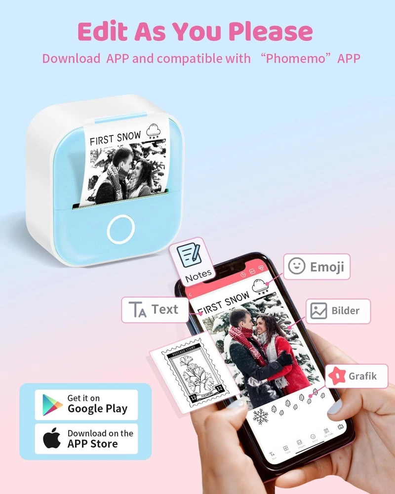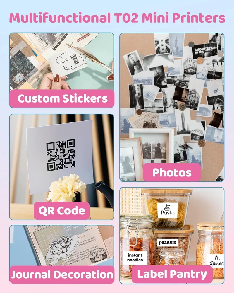 Phomemo T02 Mini Pocket Bluetooth Thermal Printer Wireless Photo Inkless Sticker Product Description Phomemo T02 Mini Printer: Compact, Stylish, and Ready to Print! Product Overview The Phomemo T02 Mini Printer is a stylish and versatile thermal printer designed for on-the-go printing. Whether you're a student, a professional, or someone who loves to stay organized, this mini printer is the perfect tool for all your printing needs. With its compact size, stylish colors, and easy-to-use features, the T02 is ready to be your go-to printing companion. Key Features Category : Printer Series : T02 Dimensions : 3.42" x 3.54" x 1.57" (87mm x 90mm x 40mm) Weight : 5.29 oz (150g) Colors Available : Green, Pink, White, Yellow, Blue, Black Charging Interface : Type-C Reverse Charging : Not Supported Fast Charging : Not Supported Rated Voltage : 5V Operating Voltage : 100-240V Input Current : 2A Printing Technology : Thermal Printing Print Resolution : 203 DPI Print Speed : 6-10 mm/s Print Density : Light/Medium/Heavy/Custom Remote (Cloud Printing) : Not Supported Printer Type : Thermal Printer Network Printing : Not Supported Automatic Duplex Printing : Not Supported Mobile Systems : Android/IOS PC Compatibility : Not Supported App Name : Phomemo App Languages : Simplified Chinese, Traditional Chinese, English, Korean, Japanese, Portuguese, French, Spanish, German, Italian, Polish, Thai, Czech, Turkish Battery Capacity : 1000mAh Paper Types : Adhesive, Thermal Paper Supported Paper Width : 2.09" (53mm) Maximum Effective Print Width : 1.89" (48mm) Included Consumables : 1 Roll of 1.5M White Adhesive Thermal Paper (53mm wide) Why Choose the Phomemo T02 Mini Printer? Stylish and Compact : Available in multiple colors to match your style and personality. Its small size makes it easy to carry in your pocket or bag. Convenient Printing : Print directly from your smartphone or tablet using the Phomemo app (available for Android and iOS). No need for a computer or complicated setup. Versatile Uses : Perfect for creating labels, to-do lists, study aids, receipts, bookmarks, and more. It's also a great tool for kids' educational games and creative projects. Inkless Thermal Printing : No ink, toner, or ribbons required. Enjoy hassle-free printing with clear and crisp results. Long-Lasting Battery : 1000mAh battery ensures extended use on a single charge. Easy to Use : Simple setup and intuitive app interface make it easy for anyone to start printing right away. Package Includes 1 x Phomemo T02 Mini Printer 1 x Type-C Charging Cable 1 x User Manual 1 x Roll of 1.5M White Adhesive Thermal Paper (53mm wide) Ideal for: Students : Create flashcards, study notes, and organize your textbooks. Professionals : Print to-do lists, memos, and receipts on the go. Creative Enthusiasts : Design and print personalized labels, bookmarks, and more. Families : Perfect for kids' educational games and fun DIY projects. Upgrade your printing experience with the Phomemo T02 Mini Printer—compact, stylish, and packed with features! On May 30, 2025 at 04:19:54 PDT, seller added the following information: