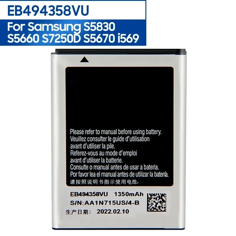 This product ensure that the purchase is from the mobile phone manufacturers accessories sales channels ,absolutely 100% genuine original Battery attributes: original battery Battery Type:EB494358VU Battery capacity: 1350mAh Voltage limit: 3.7DVC Compatible with: For Samsung Galaxy Ace S5830 S5660 S7250D S5670 i569 Battery Country of Origin: China Packing specification: Bulk Important: New Lithium Ion batteries must be FULLY CHARGED and FULLY DISCHARGED 2 to 3 times, before being FULLY CONDITIONED. Please remember that a new Lithium-Ion battery's full performance and longevity is only achieved after 2 to 3 complete charge and discharge cycles. After you go through 2 to 3 cycles, you'll never have to condition your battery again! All talk and standby times are approximate, depending upon carrier's network settings, signal strength, and features selected. Talk and Standby times will be lower in Analog mode as noted above. Dear customers and friend: when you buy my product,if anything unusual happens:Not received the items, or inconsistent with the description, or other reasons make you not satisfied. Please do not leave neutral (or negative )feedback or open case easily, please feel free to write to contact me. We will do our best service to solve your problem. I believe that good communication can resolve everything. Again thank you so much. We appreciate your understanding and patience.
